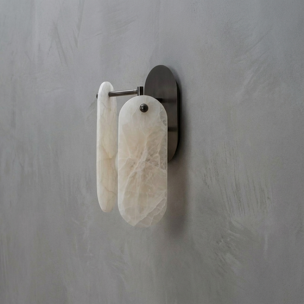 This wall sconce blends rose-jade tones with luminous alabaster to create a richly layered mineral palette. The contrast of the soft stone and nuanced color brings a refined, sculptural presence to any space. When illuminated, the alabaster brightens gently, casting a warm, contemporary glow that instills a sense of calm in hallways, seating areas, or transitional spaces. Used on its own as a quiet focal point or placed in rhythm along a corridor, it establishes a measured cadence of light that beautifully complements modern interiors.