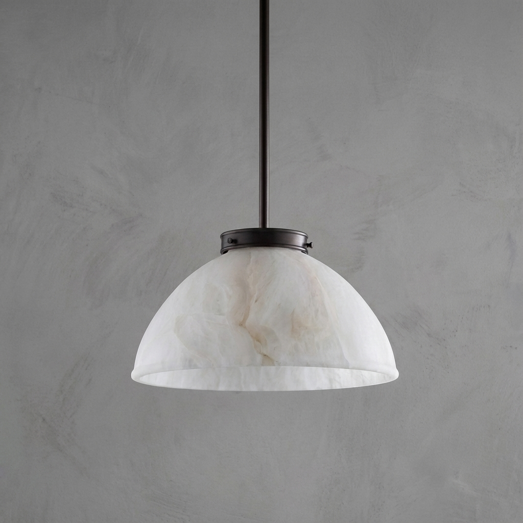 The small Tiber pendant shapes luminous alabaster into a compact, gracefully tapered form. Its restrained geometry highlights the stone's natural veining, making each piece feel intentional and unique while adding gentle softness to modern interiors. Whether grouped in staggered heights or used alone, this pendant adapts effortlessly to entries, stairwells, and intimate reading corners that call for a refined accent. Thoughtfully considered mounting details allow the fixture to appear light and effortless once installed, keeping the focus on the alabaster's quiet glow.