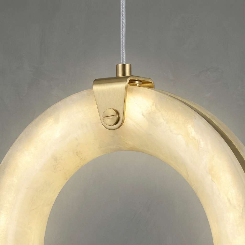 A sculptural take on modern lighting, this toroid chandelier pairs a circular silhouette with the natural beauty of alabaster. The ring is lit from within, so light traces the inner curve and washes softly across the stone, revealing its subtle veining and creating a warm, ambient halo.