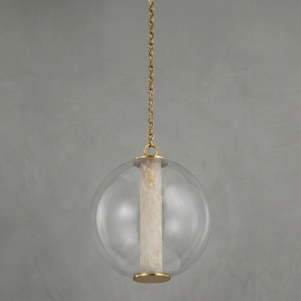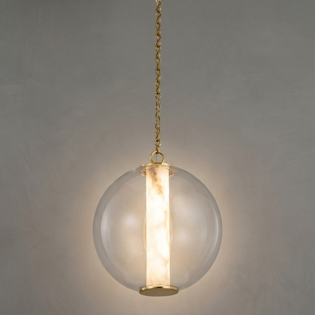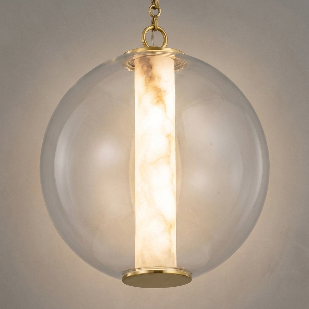 This pendant brings together luminous alabaster and a clear glass globe, allowing the warm glow of stone to mingle with crisp refraction. The interplay between these refined materials creates a balanced, modern purity that feels both sculptural and soft. Used alone or grouped in staggered heights, it adapts beautifully to entries, stairwells, or intimate reading corners that call for a subtle statement. A compact canopy keeps the ceiling line clean and understated, ensuring the focus stays on the elegant form and gentle radiance of the alabaster tube and glass globe.