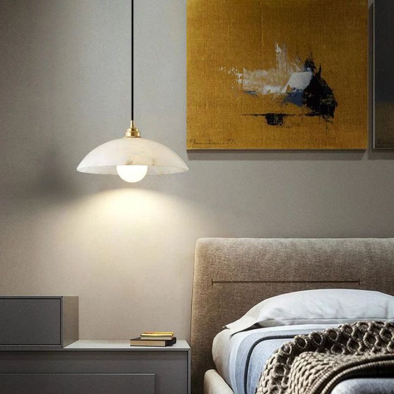 An alabaster pendant shaped with a graceful, umbrella-like curvature, this piece allows light to pool softly beneath it. The natural alabaster is gently illuminated, casting a warm, inviting glow that feels both refined and understated.
