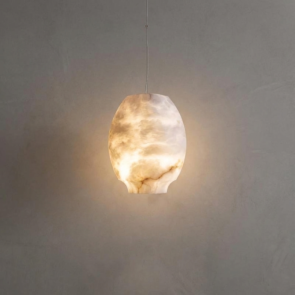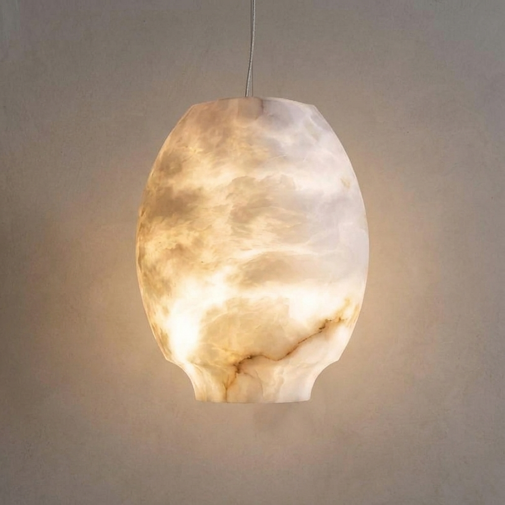 Shaped like a small alabaster vase, this pendant diffuses light in a tender, collected bloom. The natural alabaster softens the glow, creating a warm, welcoming ambiance that feels both modern and timeless. Rounded shoulders gently tailor the light, making it an inviting choice over kitchen islands, intimate nooks, or layered in pendant groupings. Whether hung in staggered heights or used as a single statement, it easily adapts to entries, stairwells, and reading corners that call for a refined accent. Thoughtful, refined mounting details allow the piece to feel light and effortless once installed, letting the alabaster form and its serene illumination take center stage.