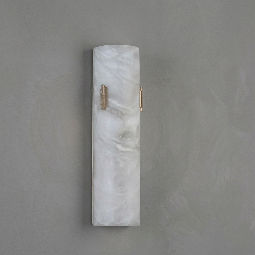 A gently ornamented alabaster wall sconce, framed with a decorative bronze accent. When illuminated, the alabaster stone glows from within, revealing subtle tonal shifts that add depth, warmth, and dimension to the wall.