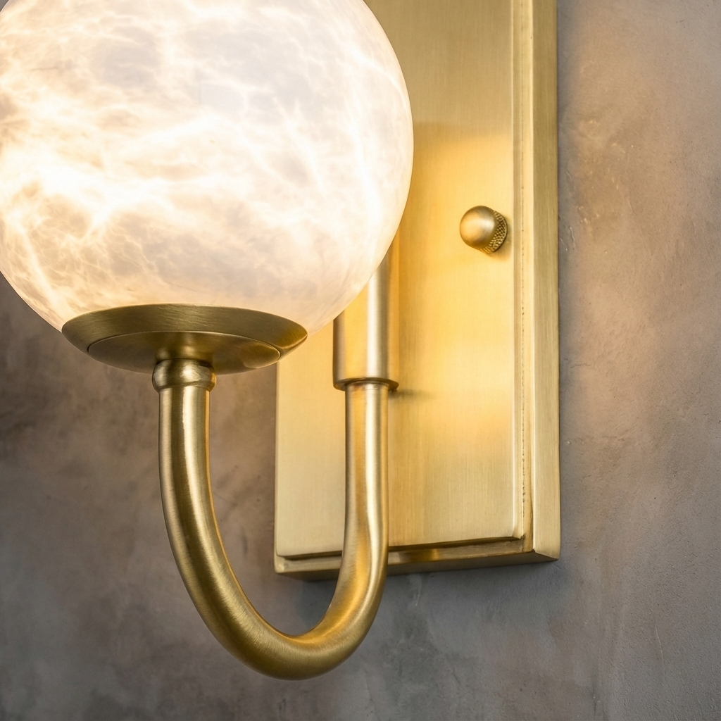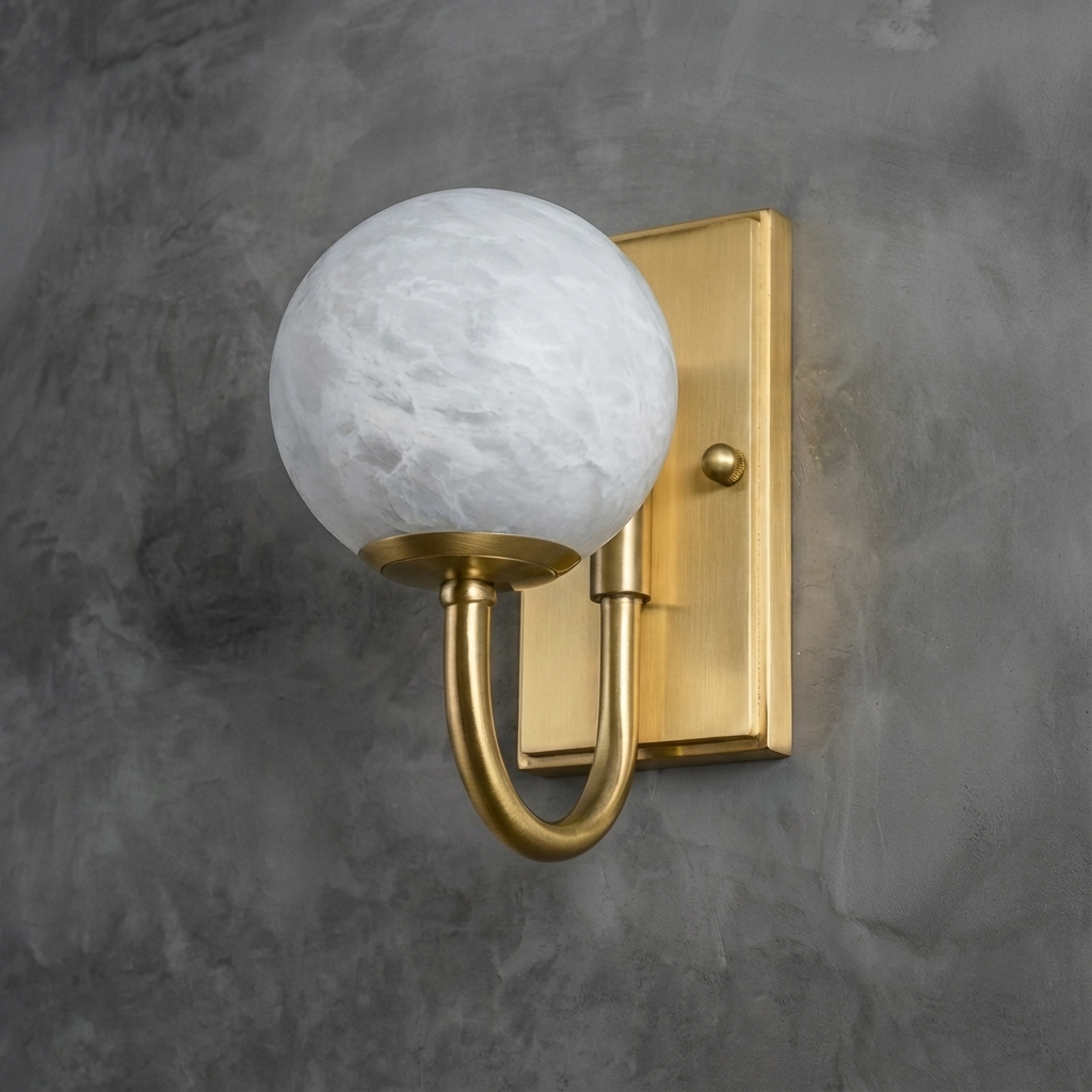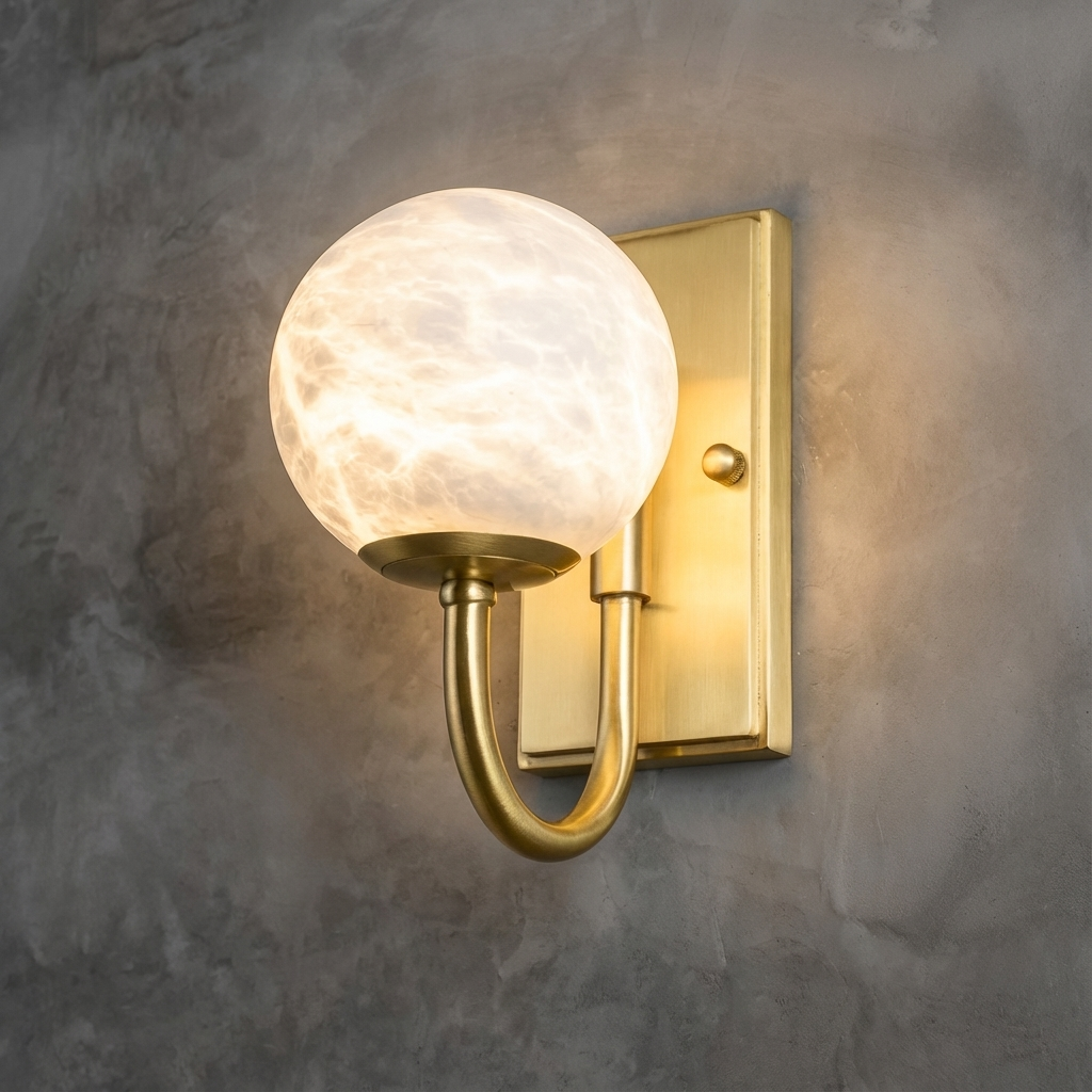 Softly curved alabaster surfaces bring a soothing presence to the bedroom, as the stone's natural translucency transforms light into a warm, comforting glow. The gentle illumination creates an inviting atmosphere that feels calm and restorative, ideal for winding down at the end of the day. A minimal bronze bracket supports the alabaster diffuser, offering a refined contrast while allowing the focus to remain on the stone's subtle, organic character. Elegant and understated, this wall light is designed to enhance restful, intimate environments with a modern, premium touch.