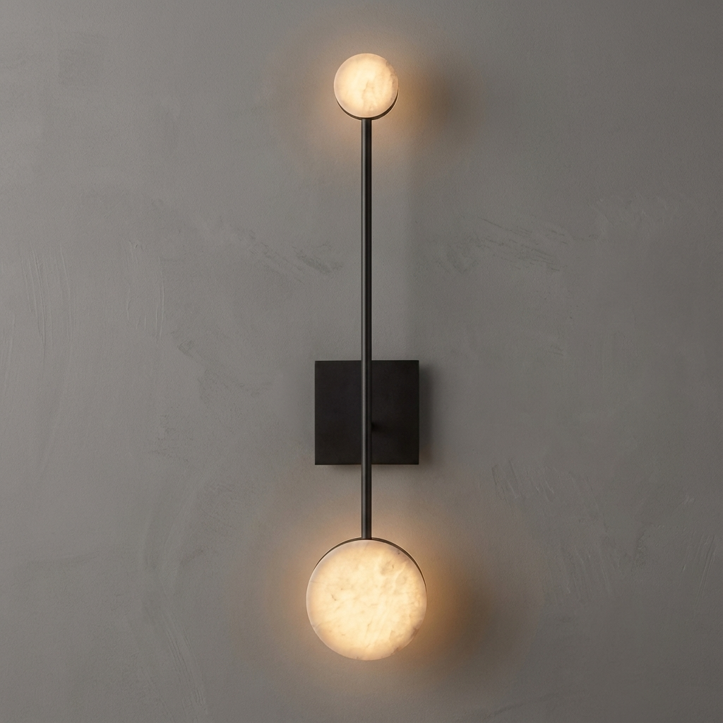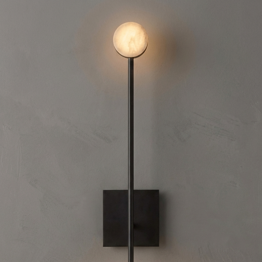 A wider, more expansive evolution of the Alexander series sconce, the Alexander Sconce 28 is designed to enhance larger walls and open spaces with quiet confidence. Its generous diffuser creates a broad, ambient glow that gently washes the room in soft, welcoming light. Rich bronze detailing adds a refined, architectural accent that complements rather than competes with the stone's natural beauty. The result is a modern, understated statement piece that feels both luxurious and effortlessly at home in contemporary interiors.