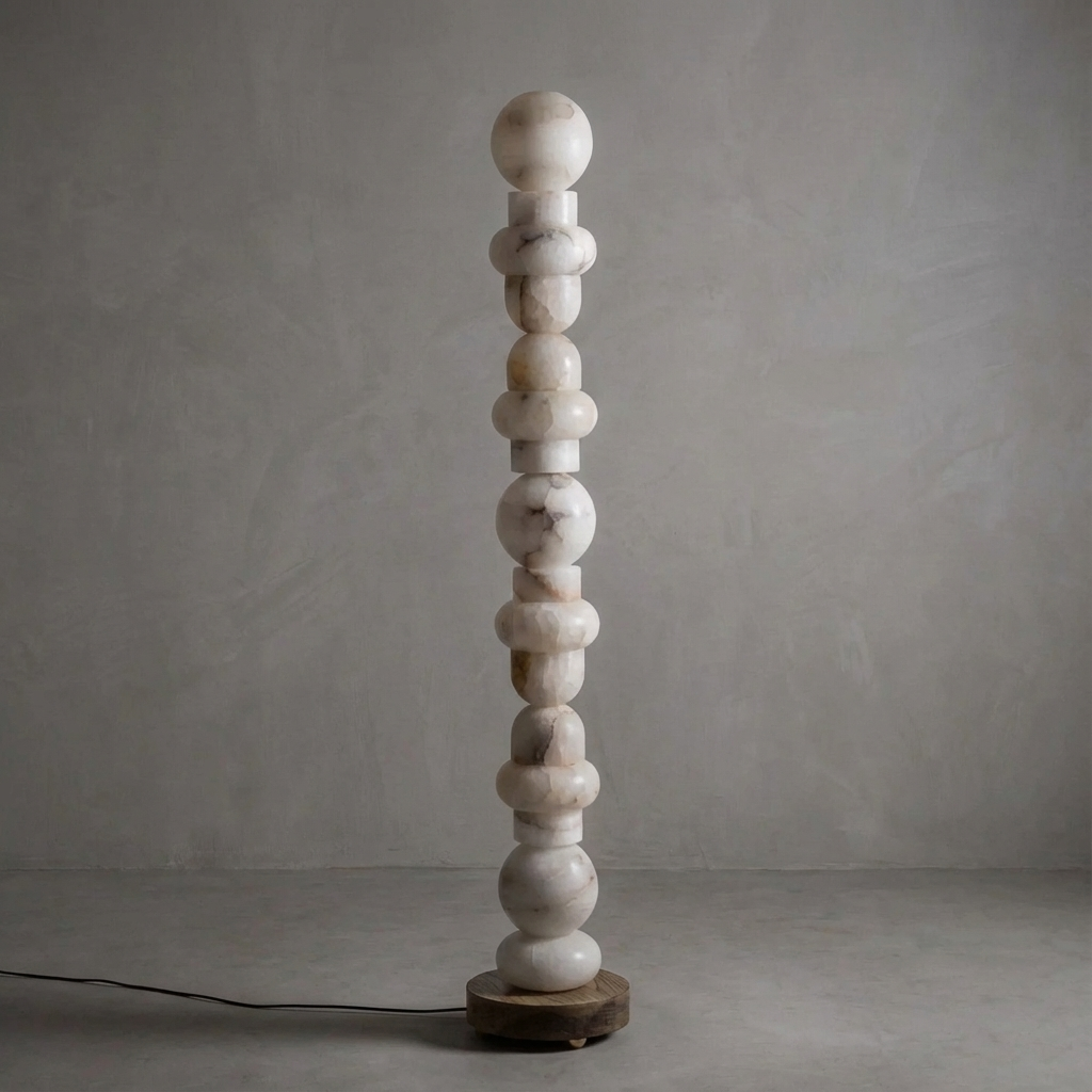 A tall, sculptural column of alabaster rises from a minimal metal base, its surface glowing with a deep, ambient warmth. As the lamp brightens, the natural mineral veining is gently revealed, turning the vertical form into a quiet architectural accent. Grounded by a satin-bronze or brushed-metal canopy, this piece balances soft luminosity with subtle contrast. Ideal for living rooms, reading corners, or any space that benefits from gentle sculptural illumination, it brings a refined, modern presence to the room even when unlit.