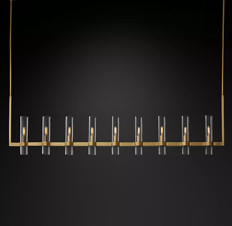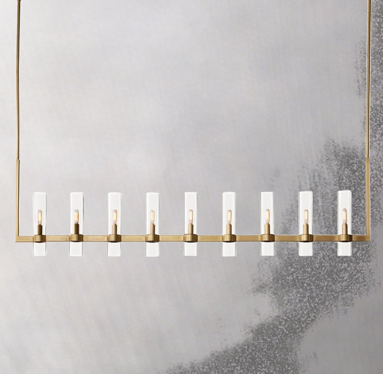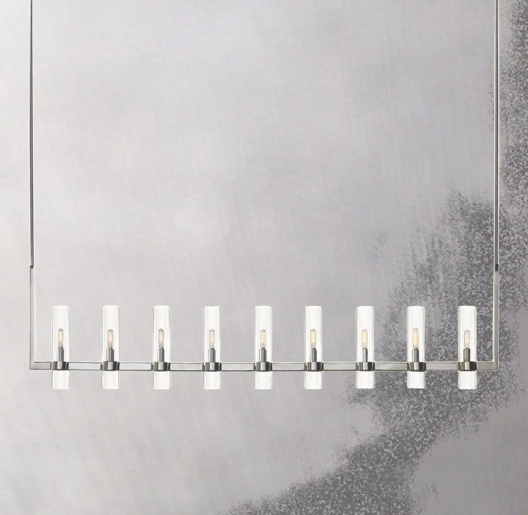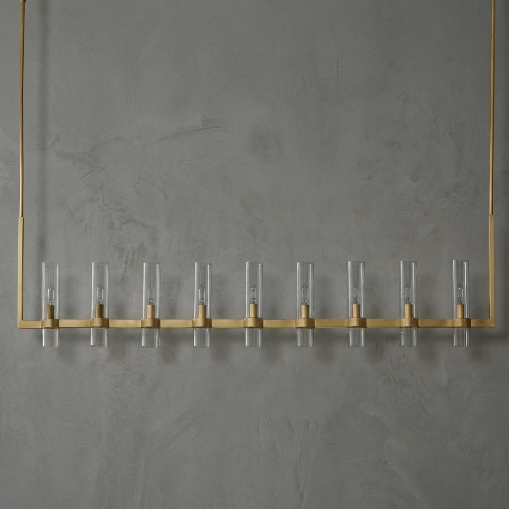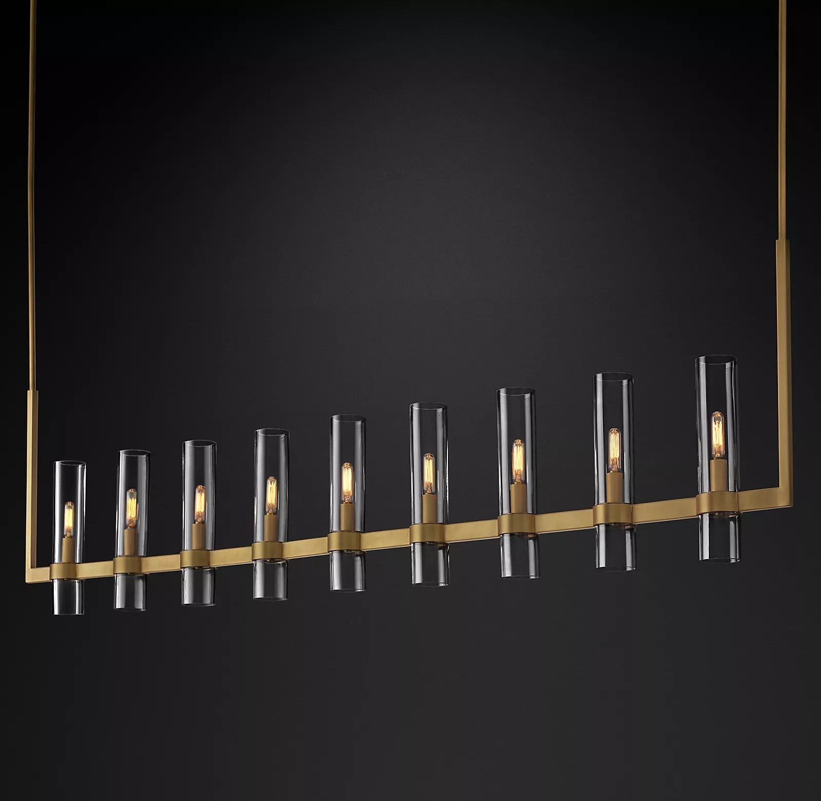 The Anello Linear Chandelier For Art Blown Glass 71" brings sculptural elegance to long dining tables, kitchen islands, and refined living spaces. Defined by its linear silhouette, solid brass frame, and vertically rising blown glass cylinders, this chandelier creates a crown-like composition that feels both architectural and luminous.