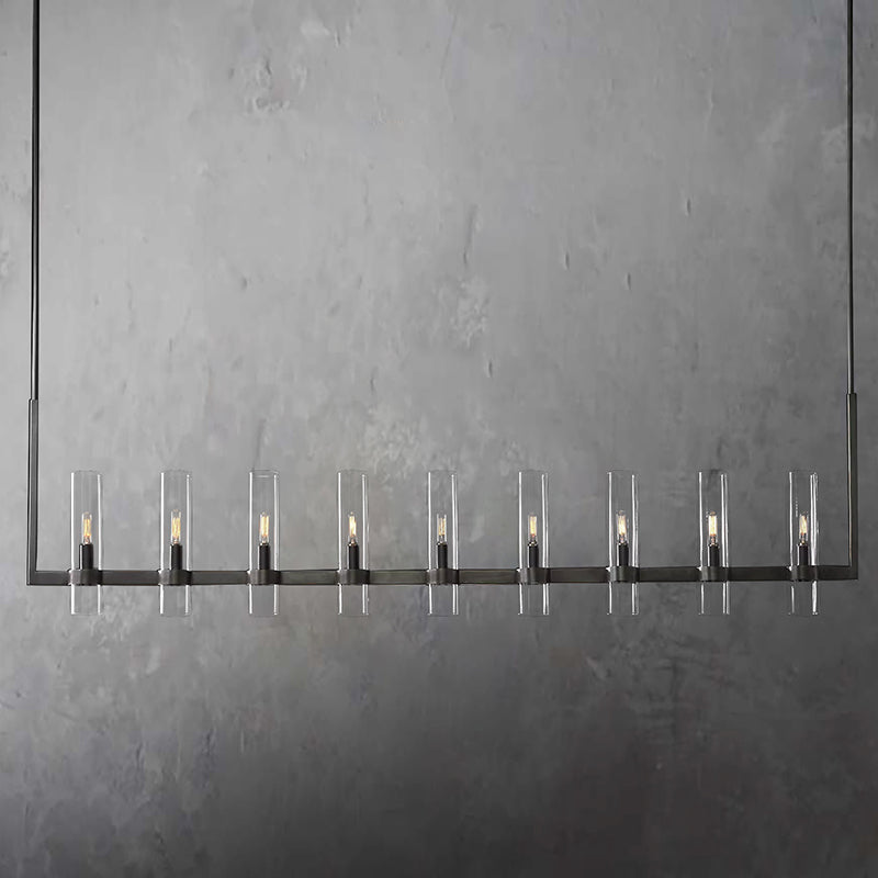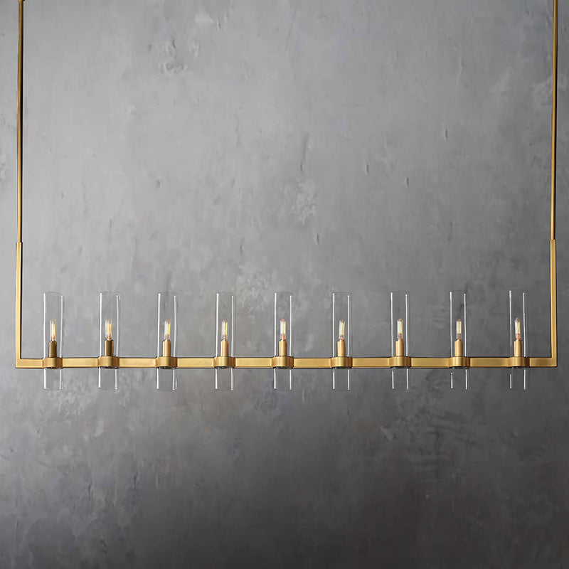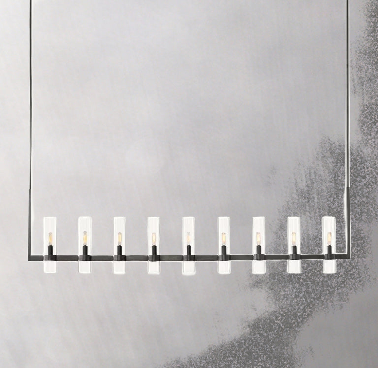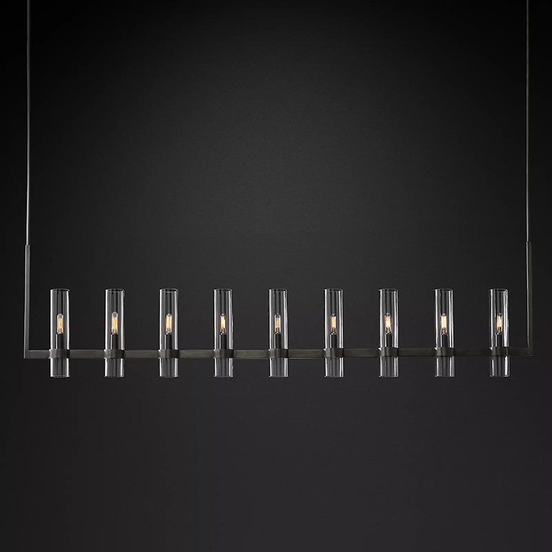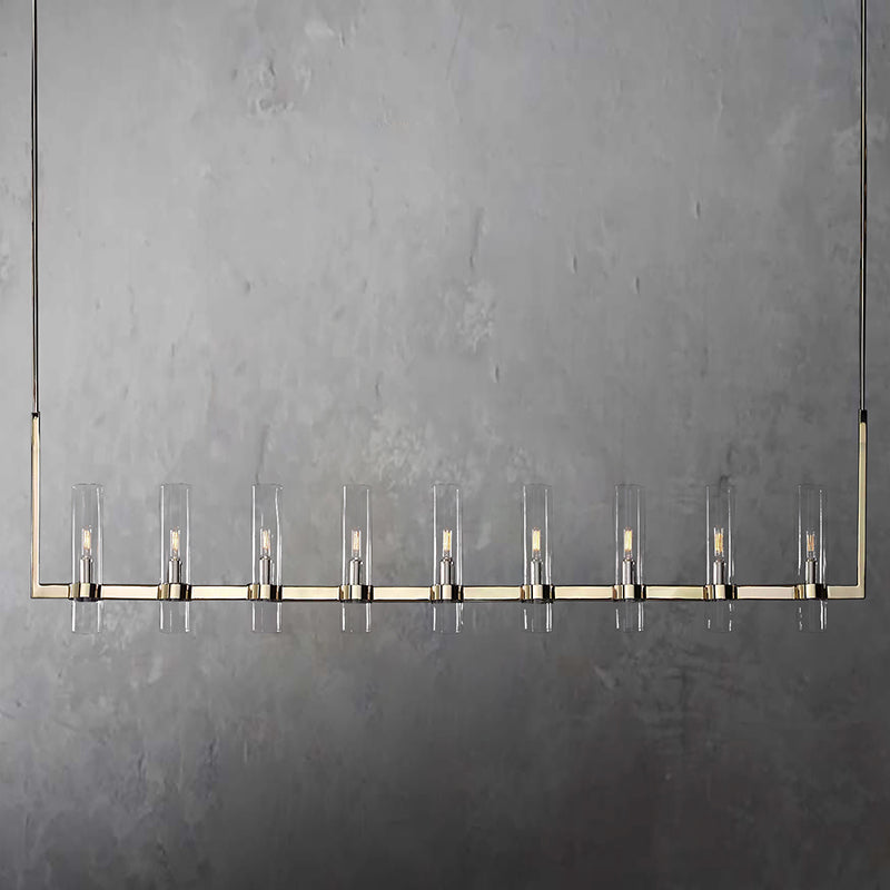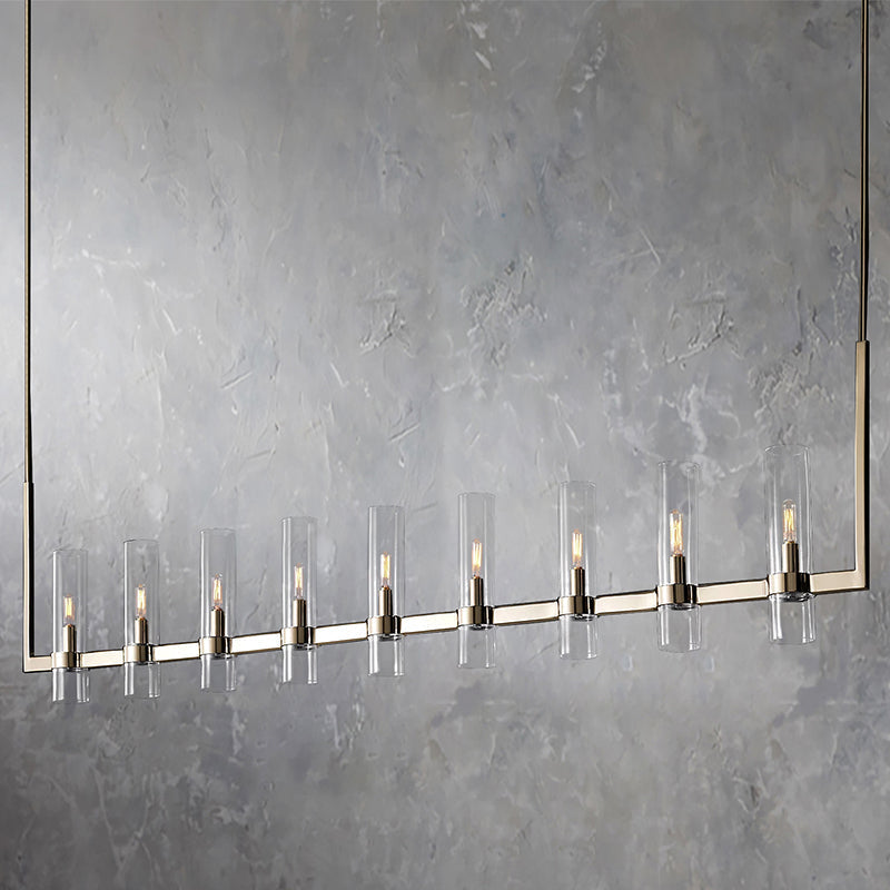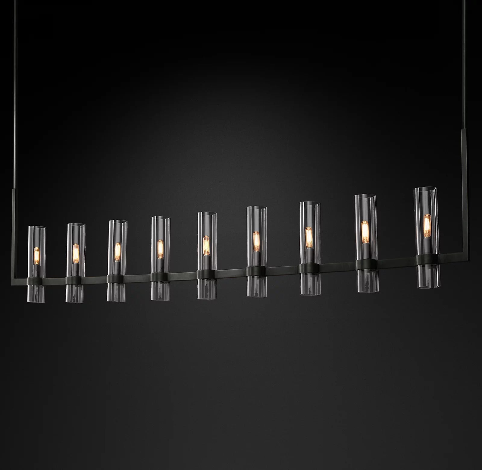 The Anello Linear Chandelier For Art Blown Glass 71" brings sculptural elegance to long dining tables, kitchen islands, and refined living spaces. Defined by its linear silhouette, solid brass frame, and vertically rising blown glass cylinders, this chandelier creates a crown-like composition that feels both architectural and luminous.
