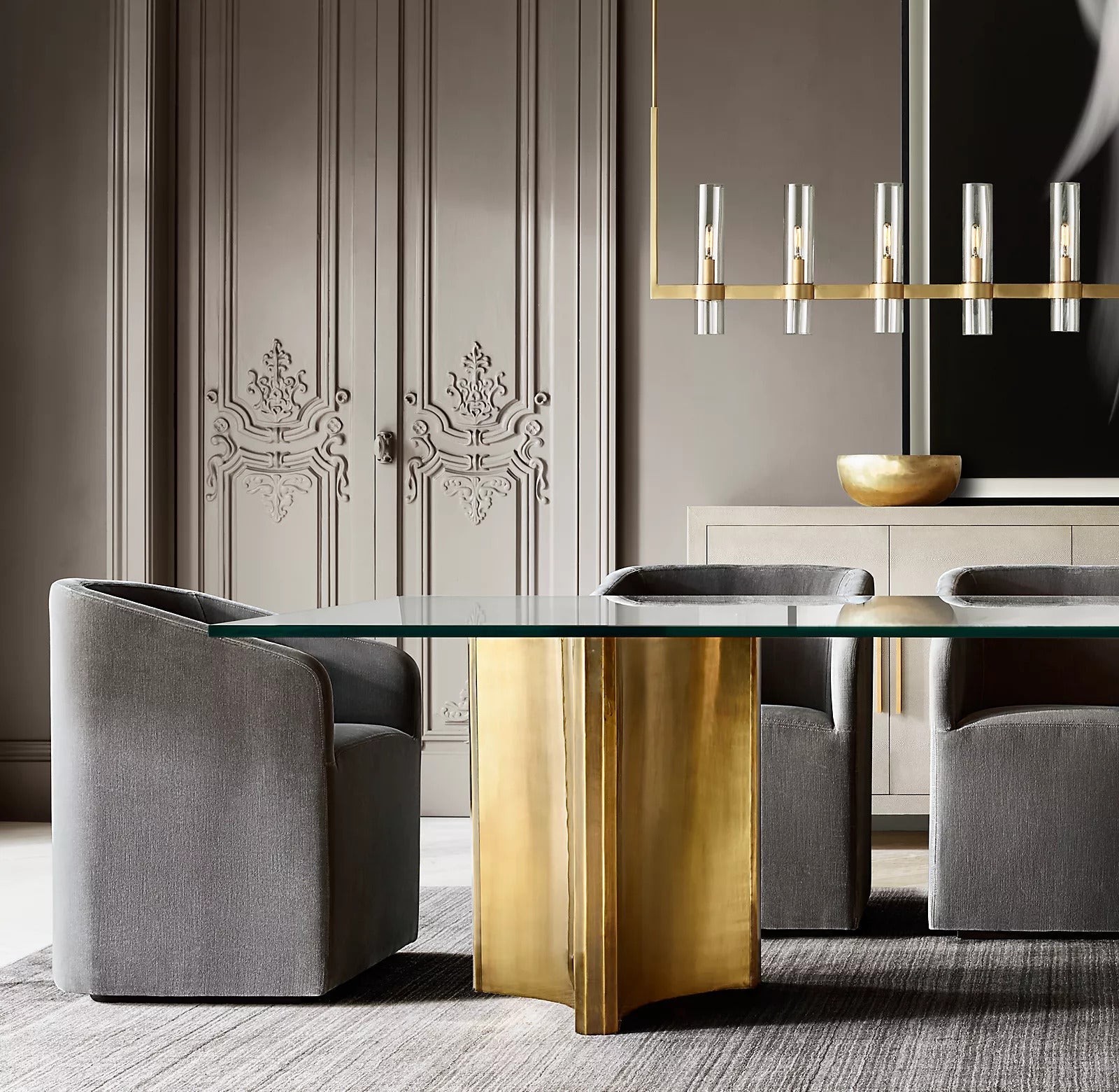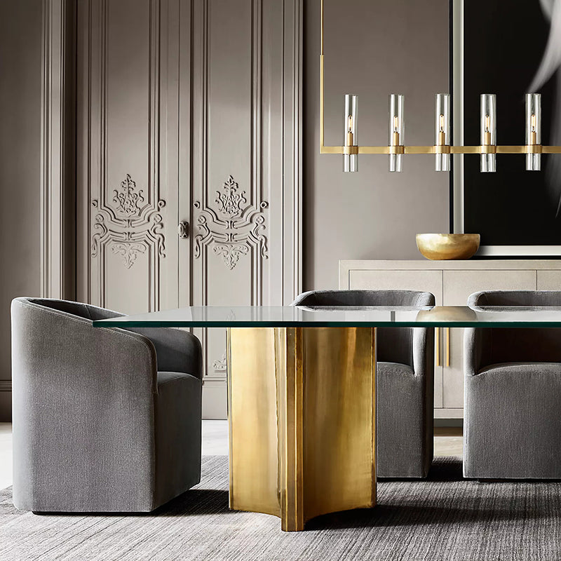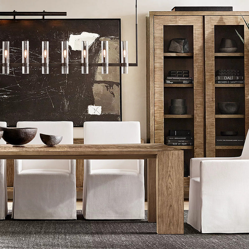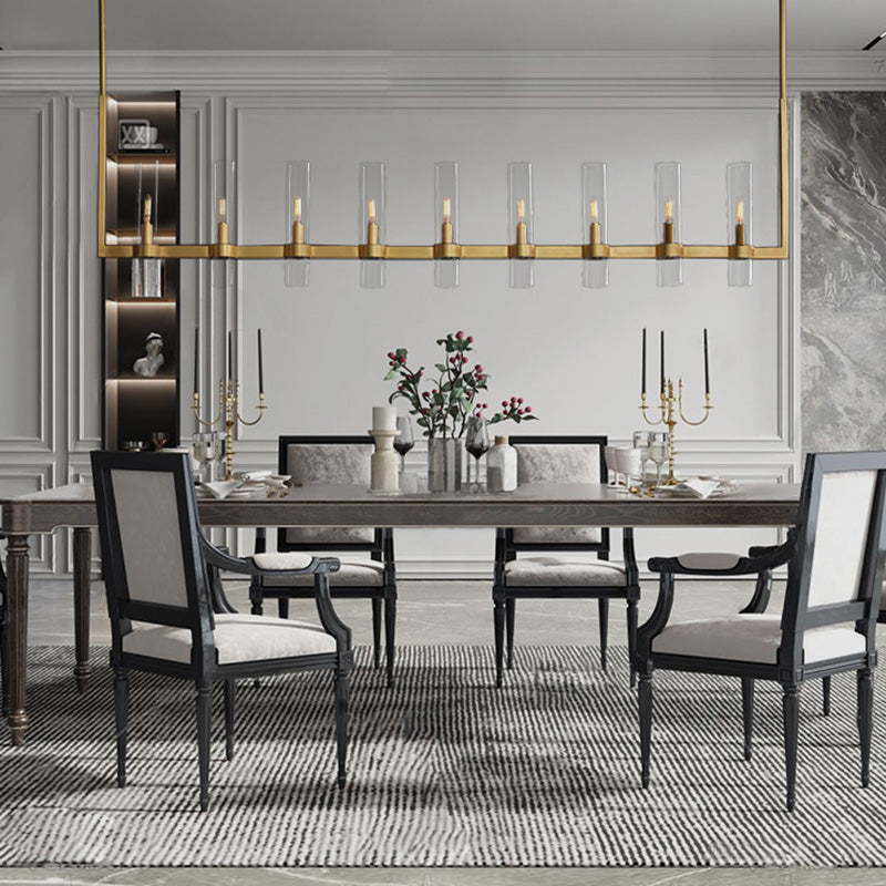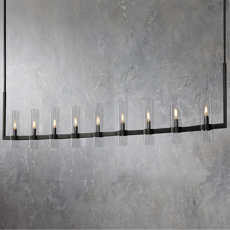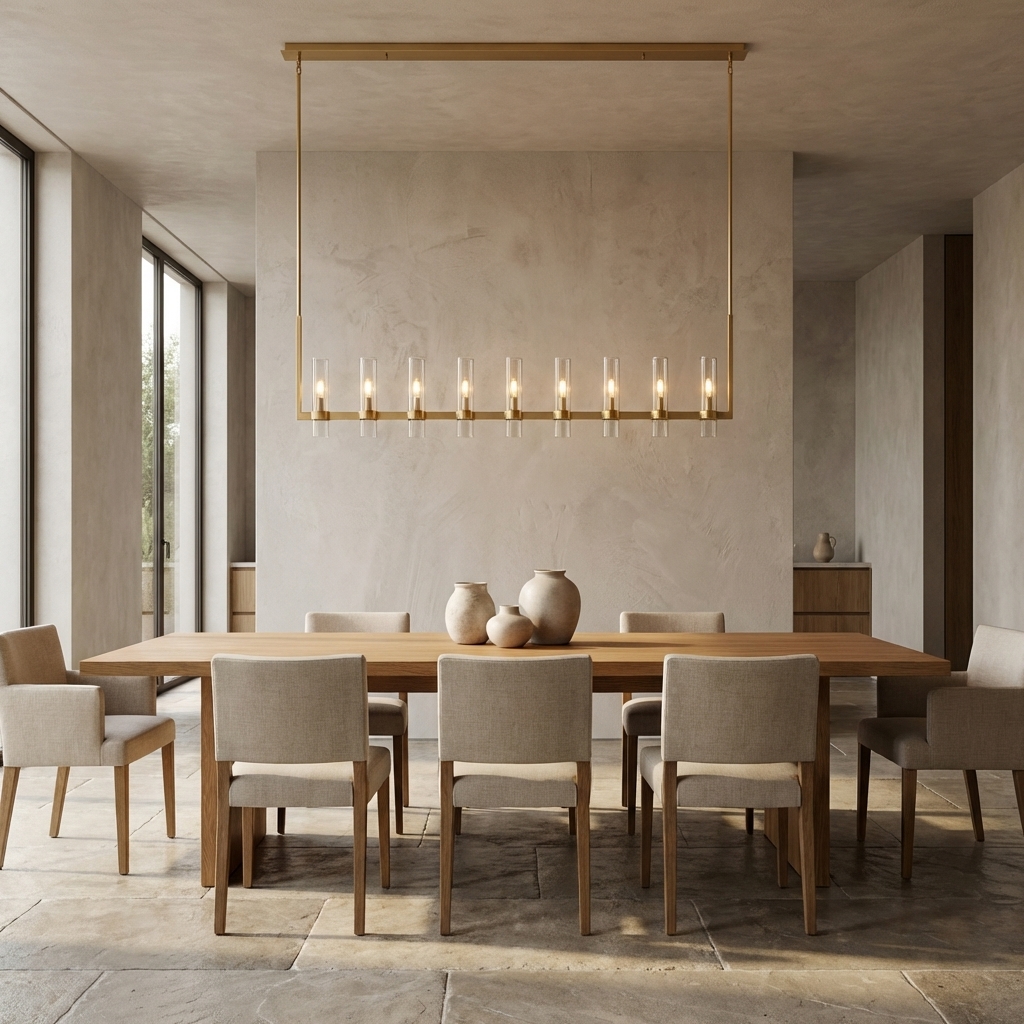 The Anello Linear Chandelier For Art Blown Glass 71" brings sculptural elegance to long dining tables, kitchen islands, and refined living spaces. Defined by its linear silhouette, solid brass frame, and vertically rising blown glass cylinders, this chandelier creates a crown-like composition that feels both architectural and luminous.