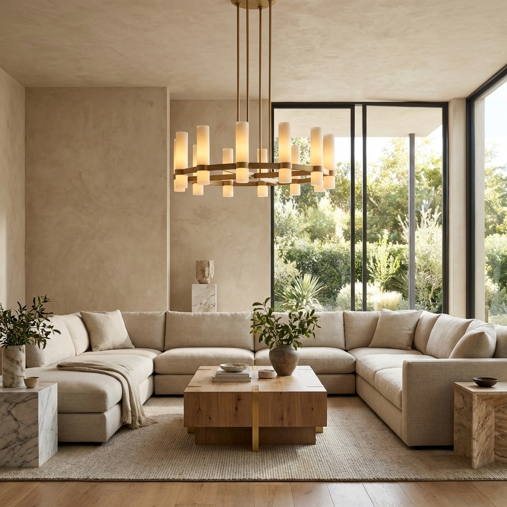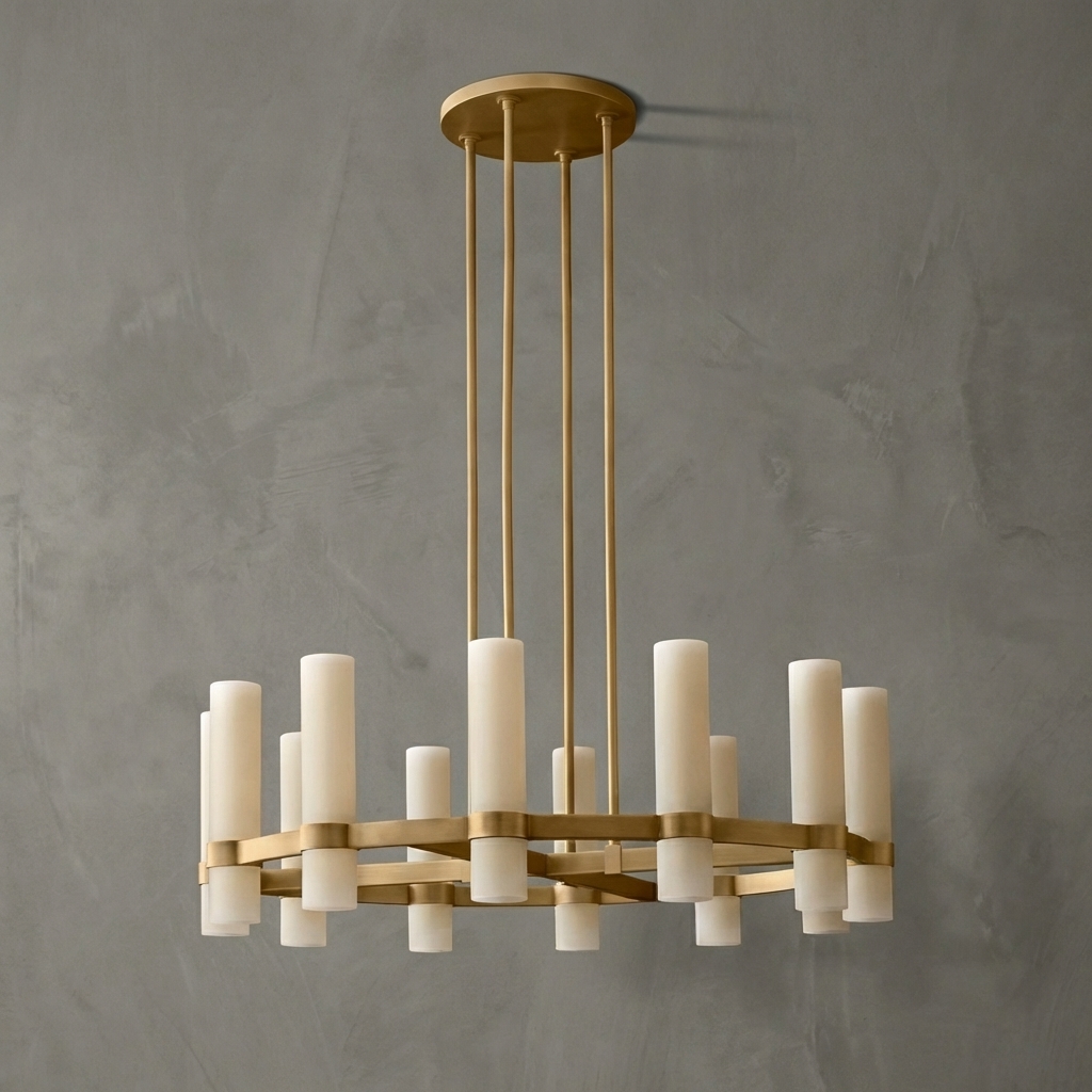 The Anello Round Milk Glass Chandelier 36" pairs sculptural form with refined materials, combining brass-toned ring framing with upright glass cylinders that rise like a crown. Designed in the Anello series, this round chandelier makes a striking statement over dining tables, entryways, and living spaces while maintaining an airy, balanced profile.