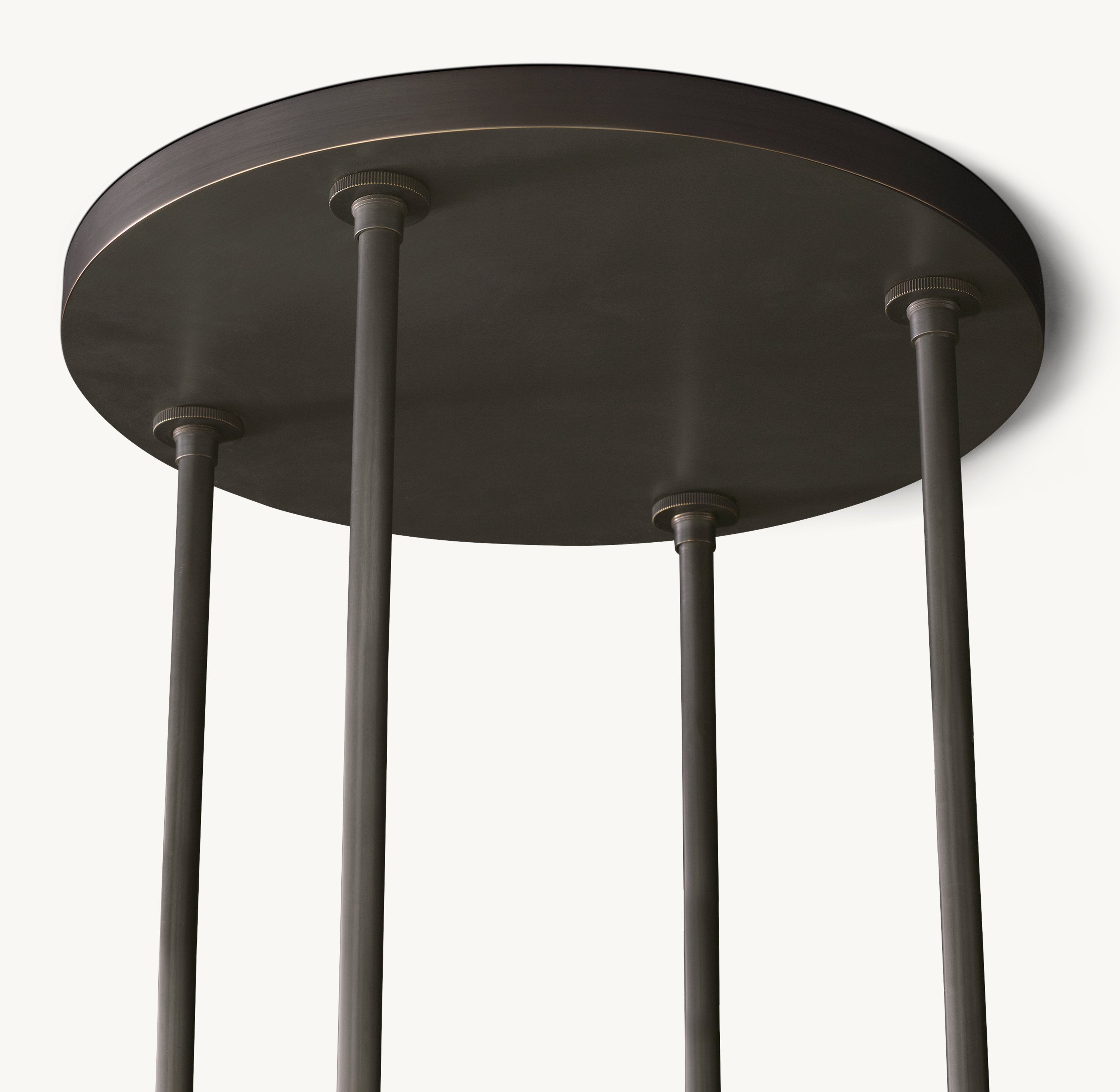 Crafted with a frame of solid steel and aluminum, this round chandelier measures 48" diameter x 12"H. Its adjustable hanging system includes eight 6" rods, eight 12" rods, and eight 18" rods for a customizable installed height from 22" minimum to 76" maximum. The canopy measures 13.5" diameter x 0.75"H, and the cord length is 10'.
