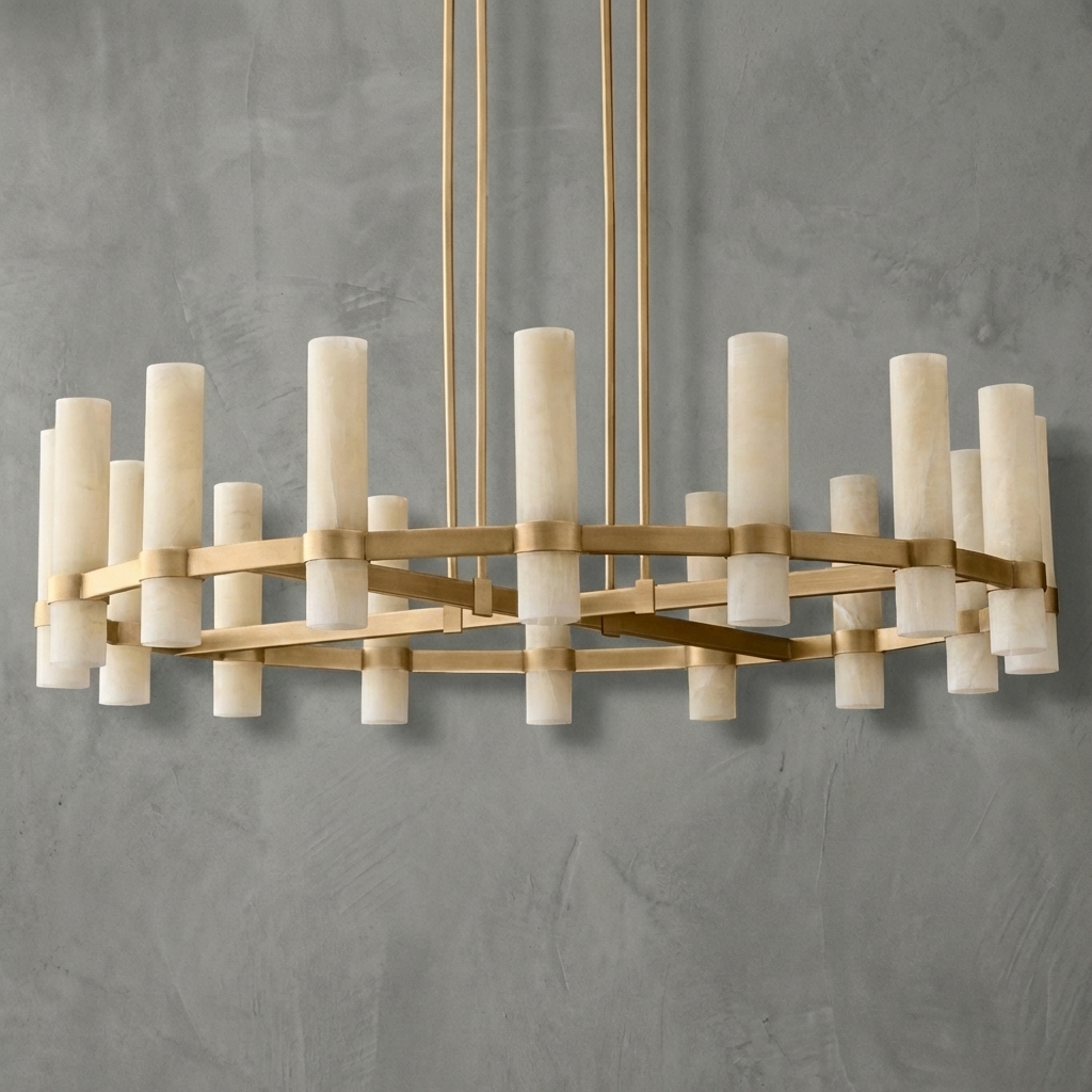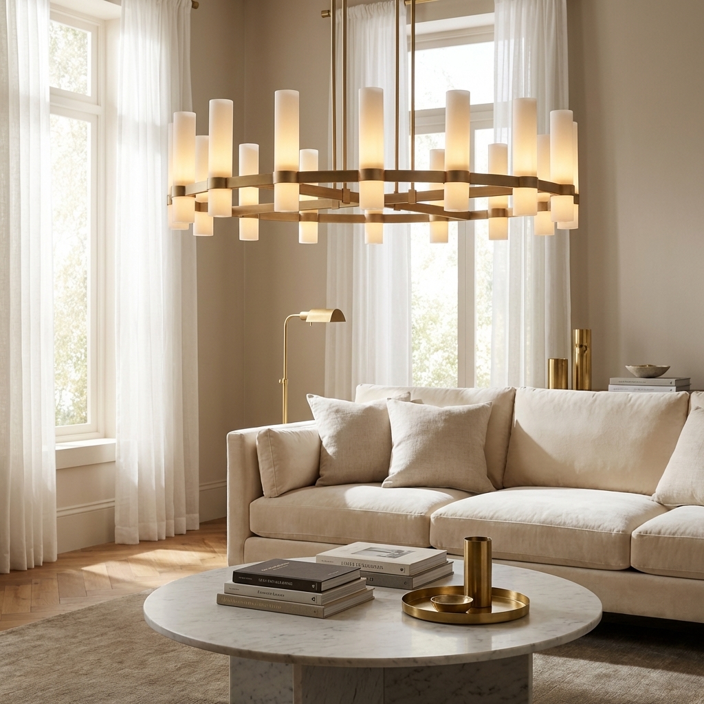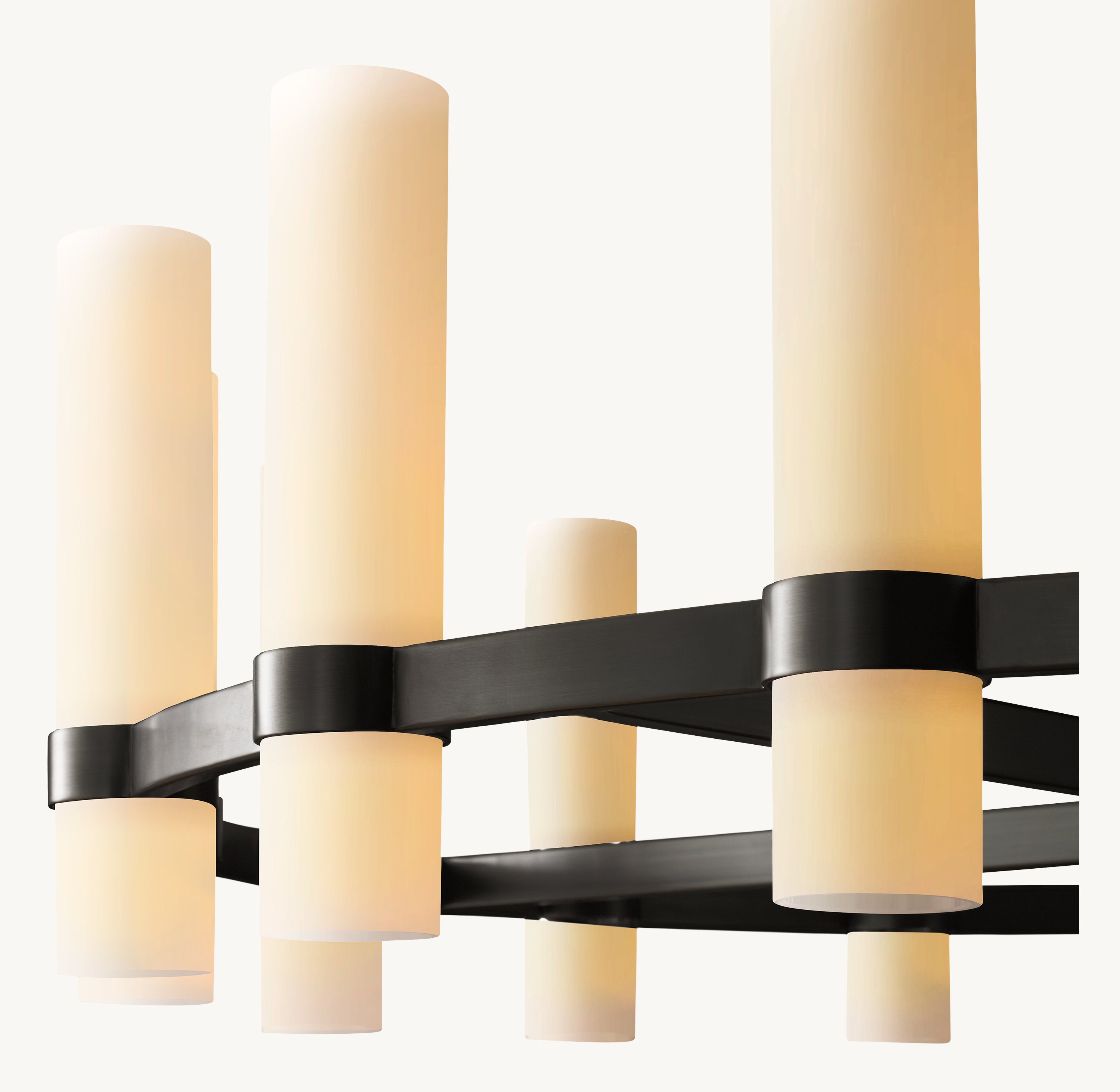 The Anello Round Milk Glass Chandelier 48" pairs a bold circular silhouette with upright blown glass cylinders that rise like a crown. Brass-toned ring framing and luminous milk glass shades give this chandelier a sculptural presence suited to dining rooms, entryways, living spaces, and other interiors where a dramatic overhead fixture is desired.