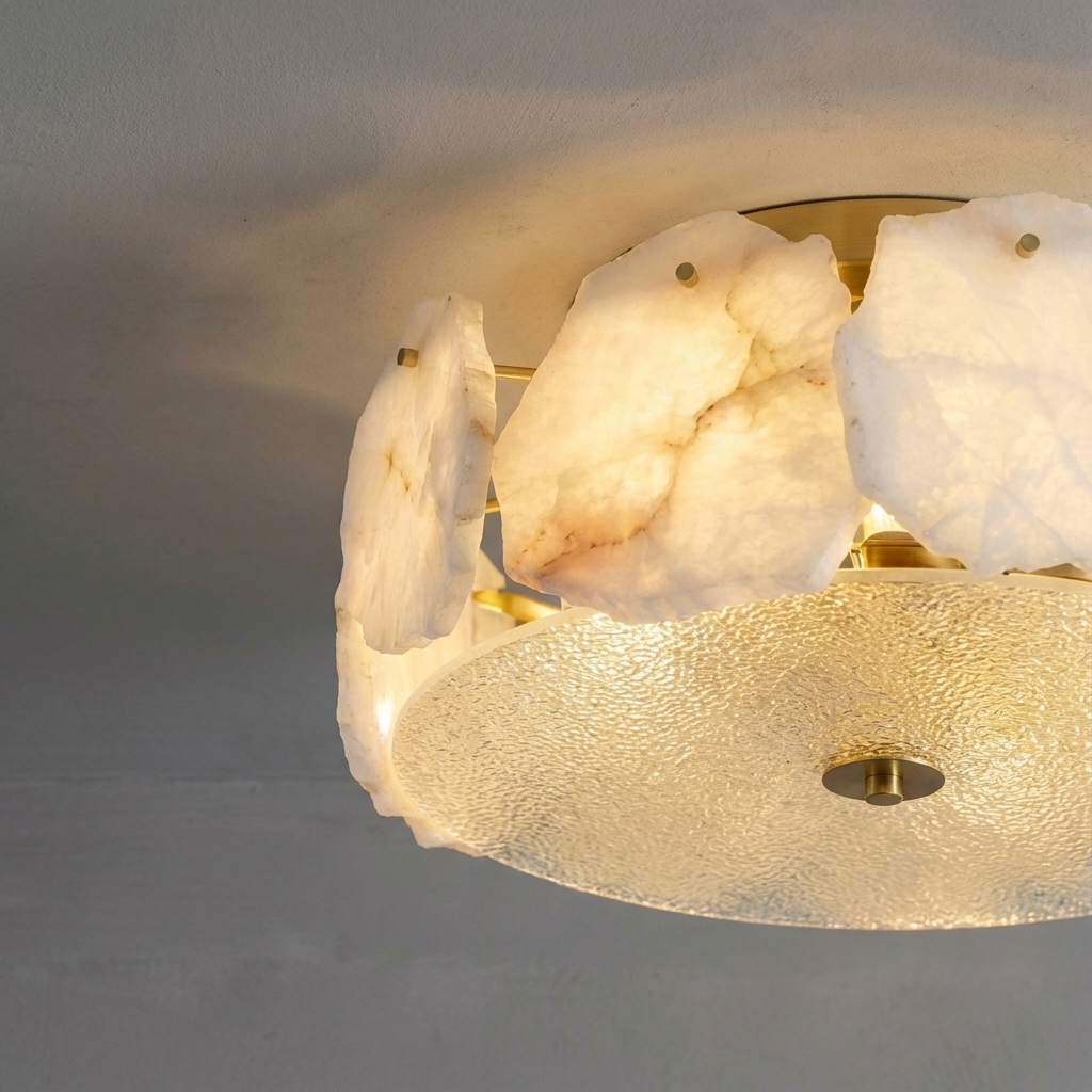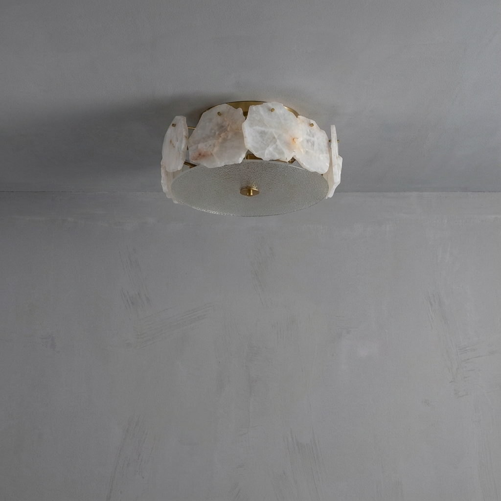 A ceiling-mounted alabaster form that casts a soft, dome-like glow across the room. The natural alabaster subtly diffuses the light, creating a warm, inviting ambiance that feels refined yet understated. Its gently curved surface spreads light beautifully, bringing a sense of calm and warmth to hallways, bedrooms, or transitional spaces. The compact canopy keeps the silhouette visually light, preserving an elegant presence even in smaller rooms or areas with lower ceilings.