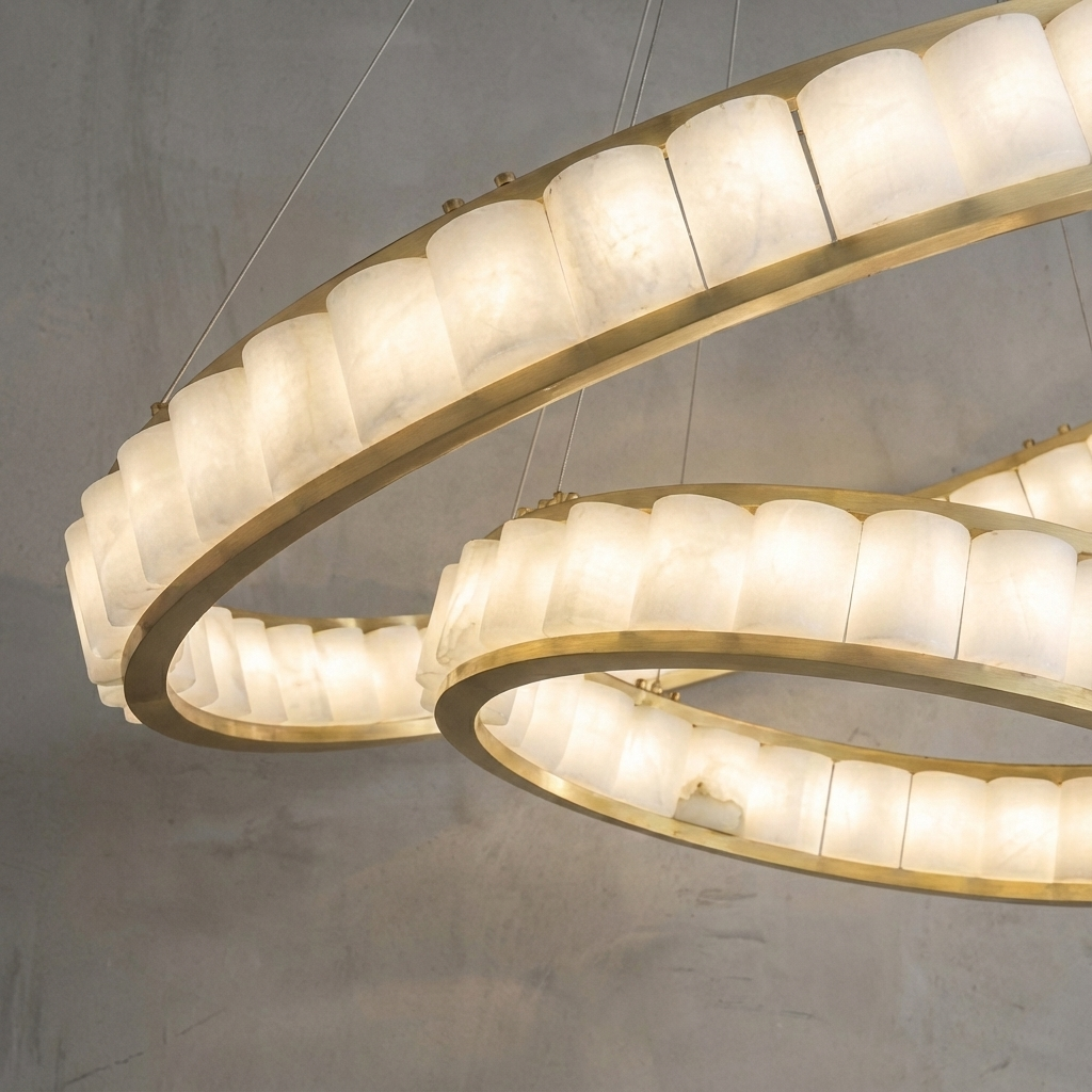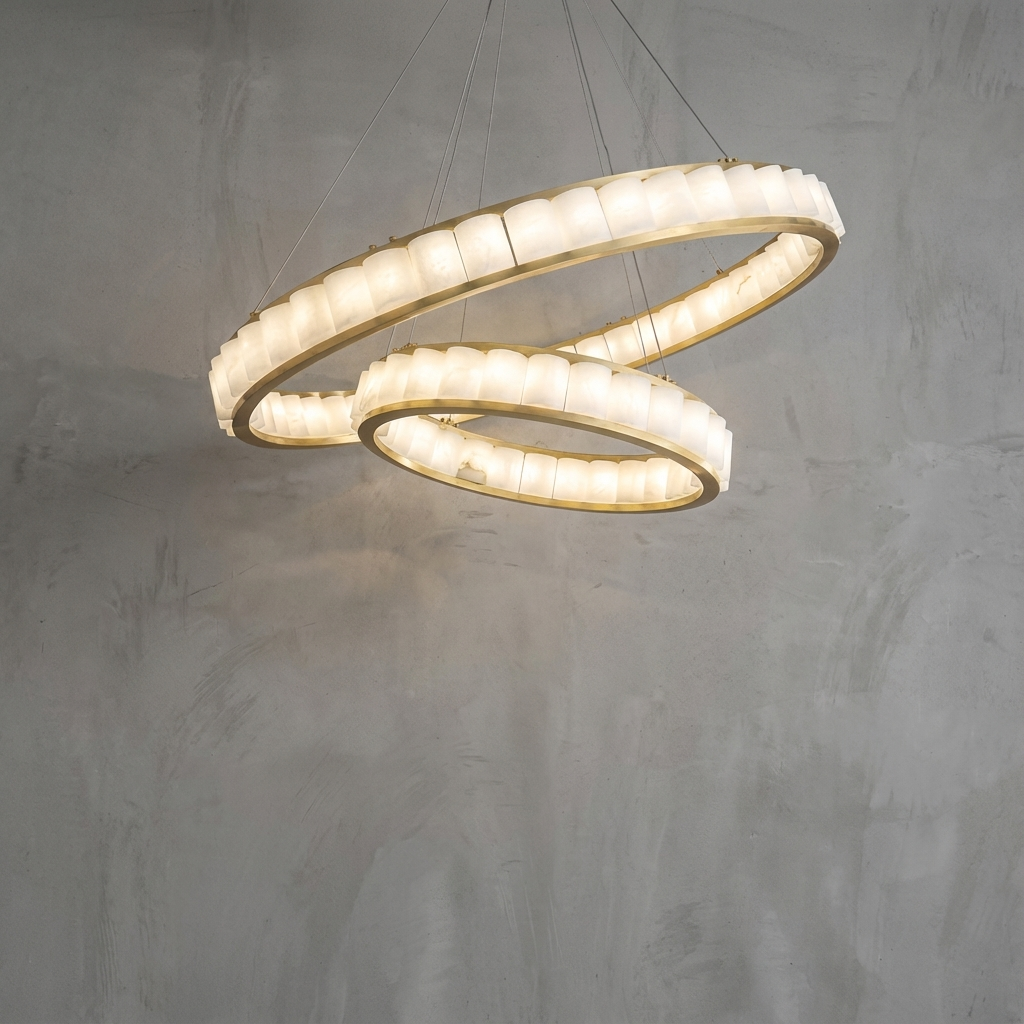 A circular composition of hand-shaped alabaster discs forms a quiet, floating ring that feels both modern and timeless. When illuminated, each alabaster disc reveals layers of soft mineral clouding, giving the chandelier a gentle, mist-like radiance that adds depth and warmth to any space. Slender suspension stems in a warm metal finish complete the silhouette without weighing it down, allowing the piece to hover gracefully overhead. Perfect above dining tables or in double-height spaces, this chandelier brings an elegant, sculptural presence while maintaining a serene, airy lightness.