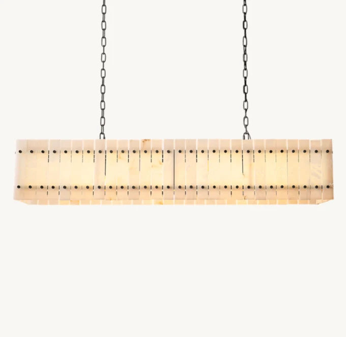 Warm tones of ivory and pale gold emerge through the alabaster stone as the Barrel Tier Alabaster Linear Chandelier 54" comes to life, filling the room with a serene, earthy glow. The natural variations in the alabaster create a soft, luminous ambiance that feels both elevated and inviting.