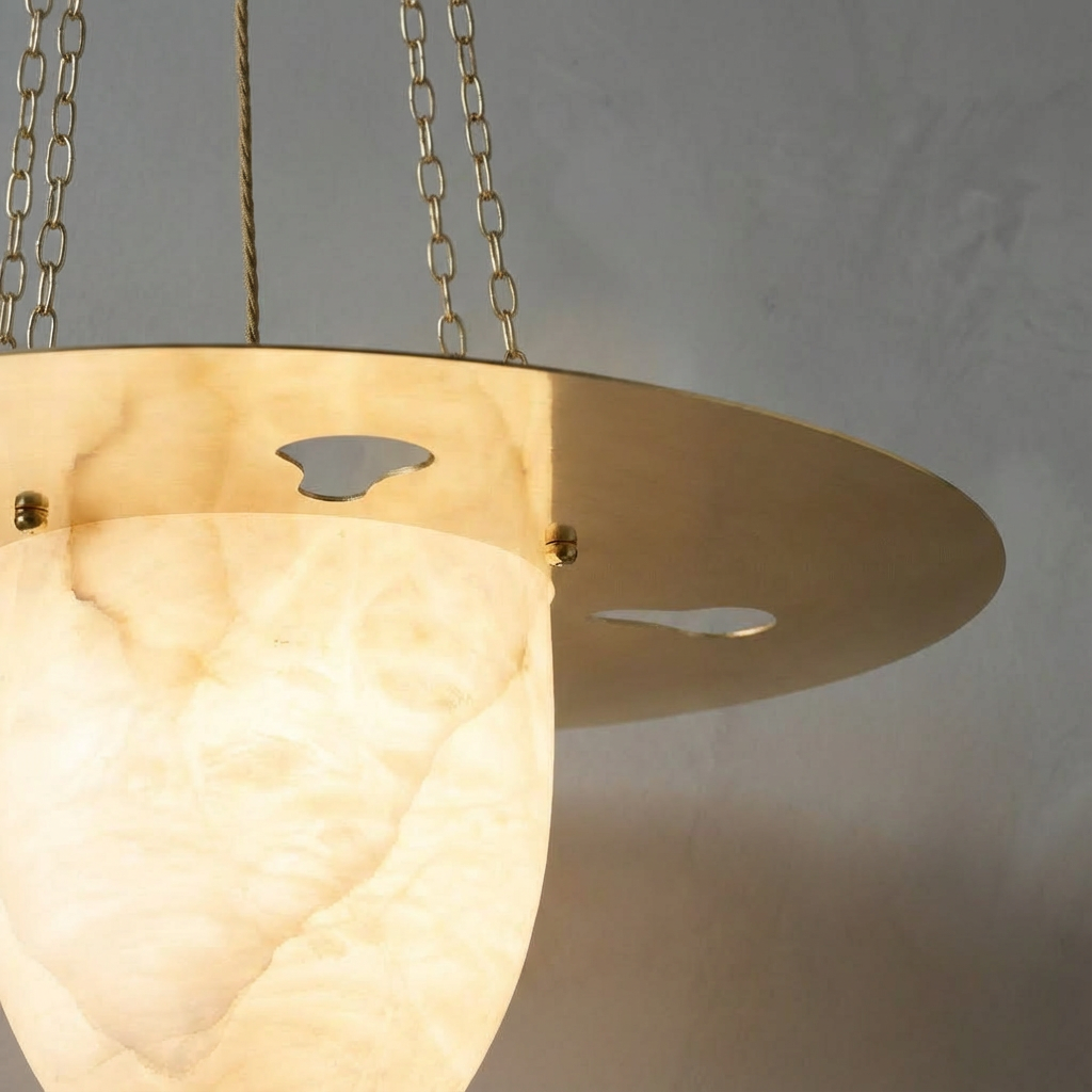 A compact pendant with a gently curved alabaster shade, this piece glows with a quiet, refined intensity. When illuminated, the stone's soft translucency reveals delicate mineral threads, bringing depth and natural character to the light. Perfect for bedside placement, over kitchen islands, or in grouped installations at staggered heights, the alabaster creates a warm, inviting ambiance while maintaining a clean, modern presence.