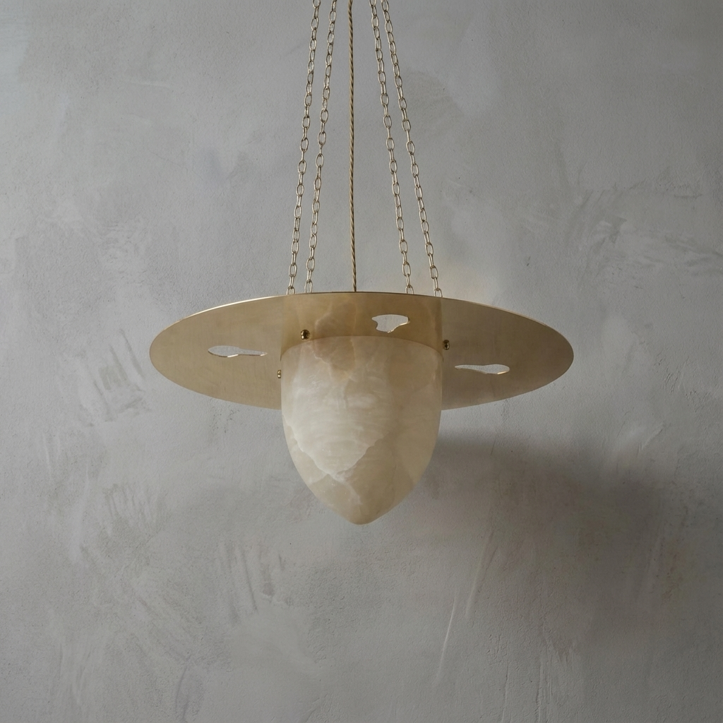 A compact pendant with a gently curved alabaster shade, this piece glows with a quiet, refined intensity. When illuminated, the stone's soft translucency reveals delicate mineral threads, bringing depth and natural character to the light. Perfect for bedside placement, over kitchen islands, or in grouped installations at staggered heights, the alabaster creates a warm, inviting ambiance while maintaining a clean, modern presence.