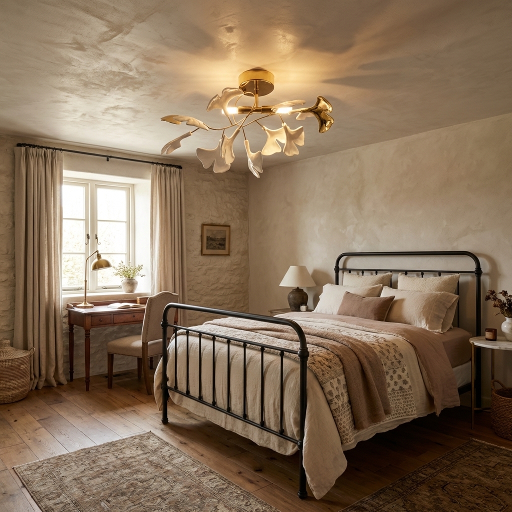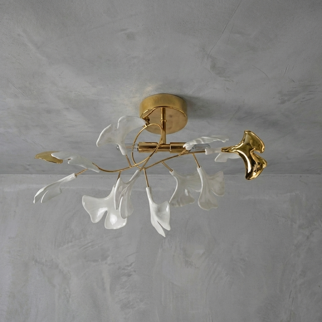 The Biloba Ceiling Lamp brings a soft, sculptural presence to the ceiling with layered ceramic leaves inspired by the natural form of the ginkgo. Arranged in flowing clusters around glowing globes, each white ceramic element helps diffuse and reflect light for a warm, elegant effect. Delicate yet expressive, this nature-inspired design suits living rooms, dining rooms, bedrooms, hotel hallways, and foyer entryways.