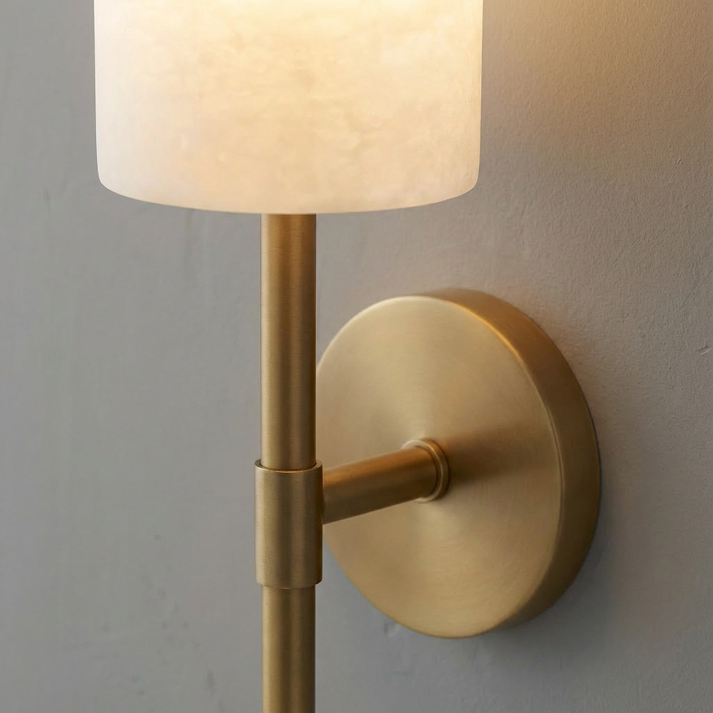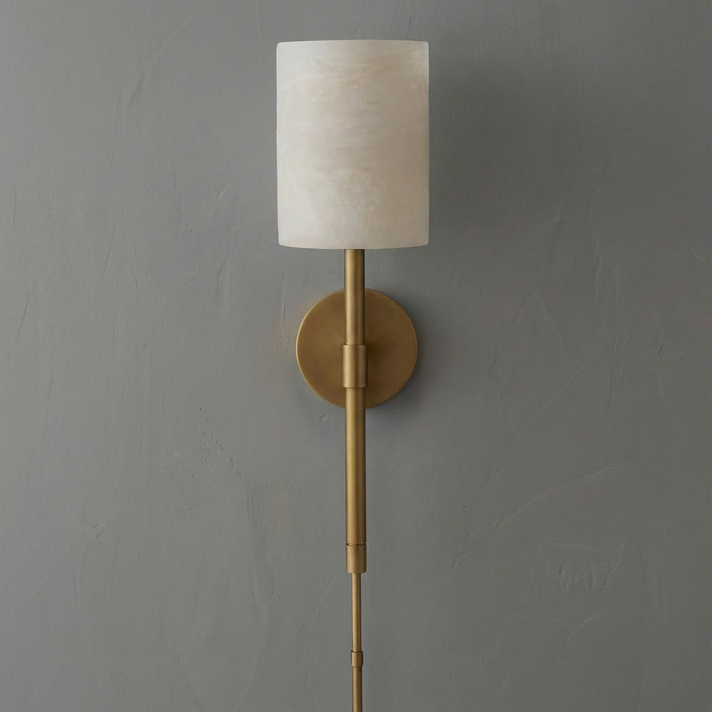 A hybrid wall sconce that pairs a softly glowing alabaster block with a tailored fabric shade, Blaire creates a refined, layered presence on the wall. The warm translucence of the alabaster stone diffuses light with a gentle glow, while the crisp textile shade adds structure and softness. With two complementary light sources blending into one welcoming illumination, this sconce enriches bedrooms, seating areas, and other intimate spaces. The thoughtful combination of stone and fabric gives the piece a high-end residential feel, bringing modern elegance and subtle luxury to any interior.