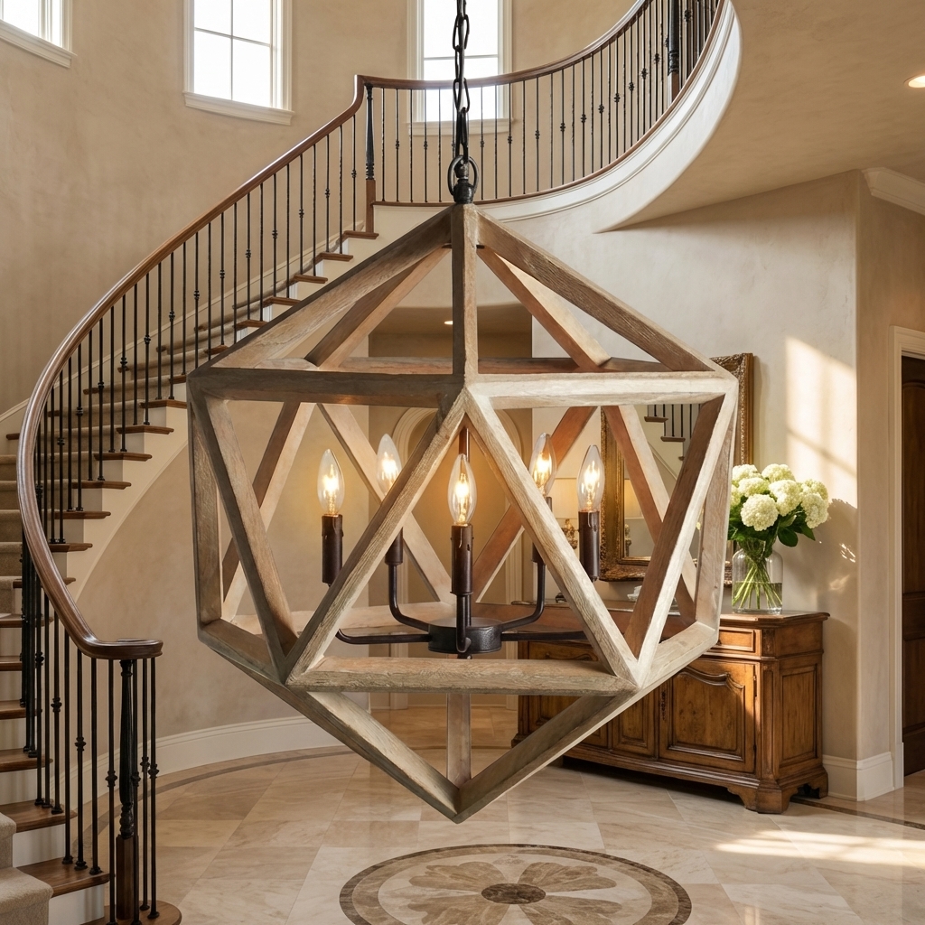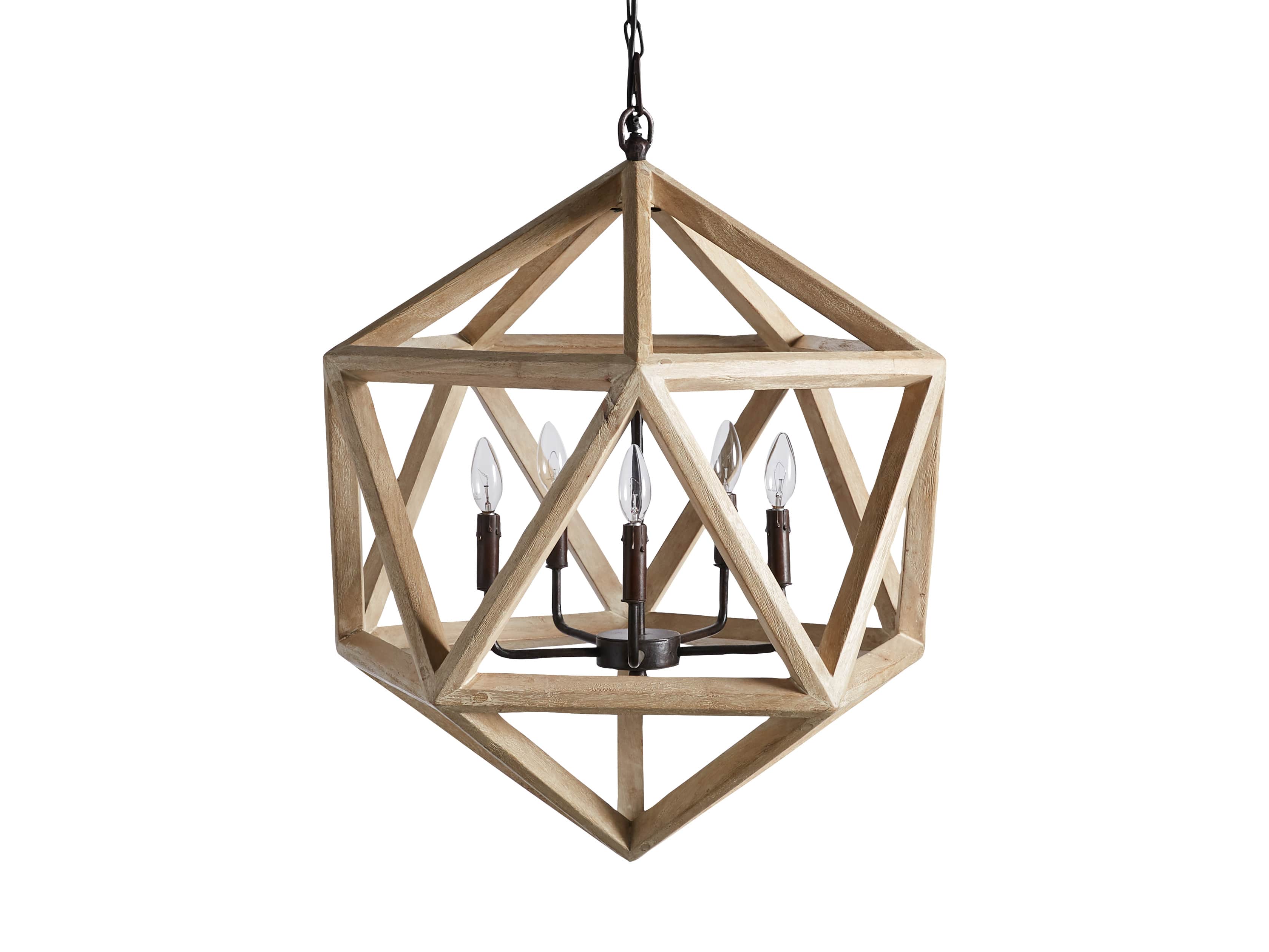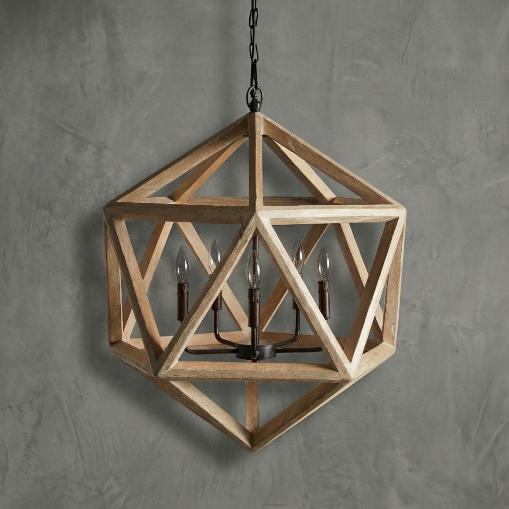 With its artisanal wood construction and faceted silhouette, the Boiserie Geode Chandelier in Natural makes a statement over dining tables, in entryways, or in living spaces that call for natural texture and geometric design.