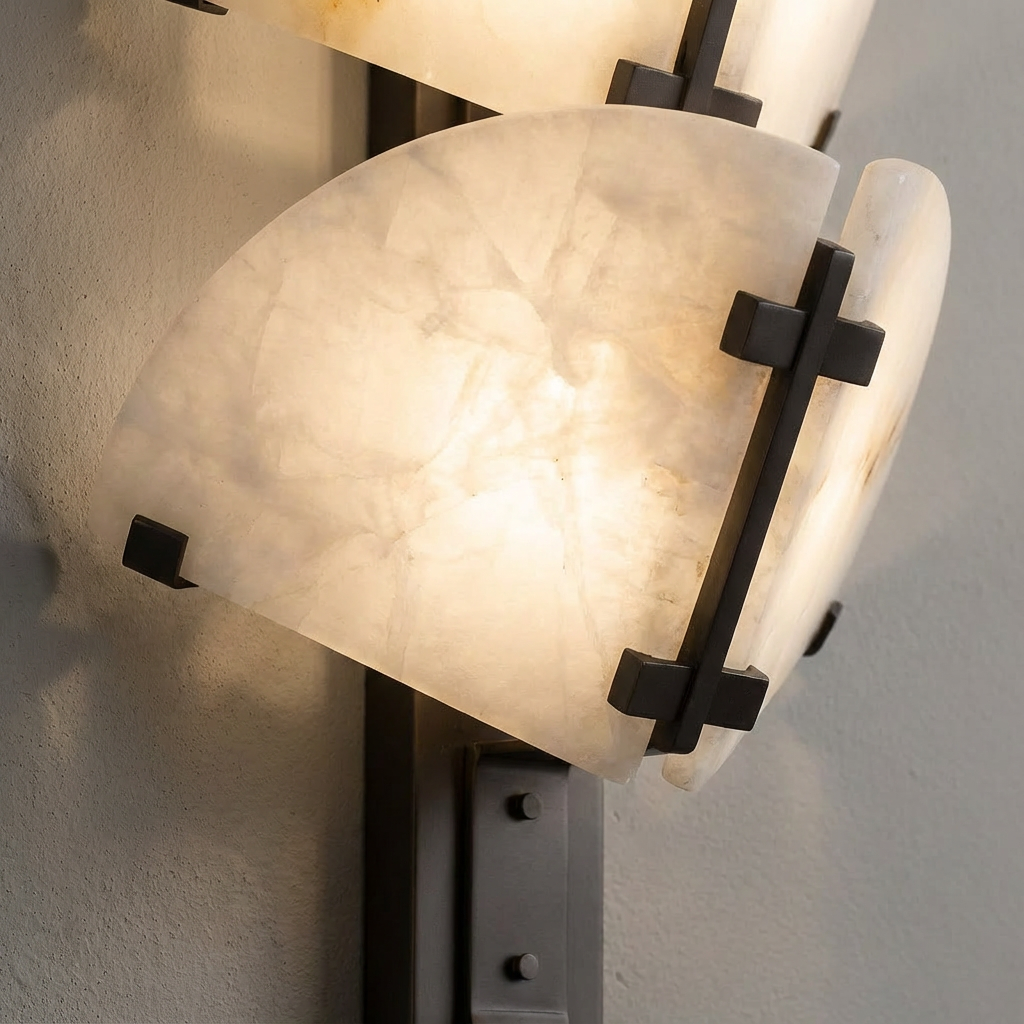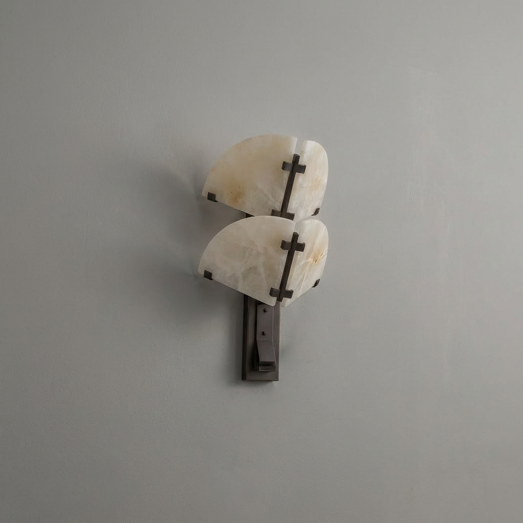 A structured wall sconce crafted from alabaster, this piece features a balanced, architectural outline that feels both modern and timeless. The natural stone adds subtle depth and character, making it a refined accent on any wall. When illuminated, the alabaster shade glows with a warm, calming diffusion that softens the room and enhances the atmosphere. Ideal for living spaces, sophisticated bedrooms, or transitional areas, it brings a gentle visual rhythm and an understated sense of luxury to your lighting scheme.