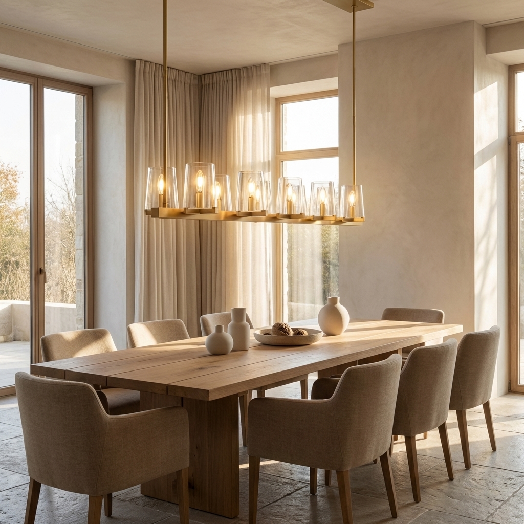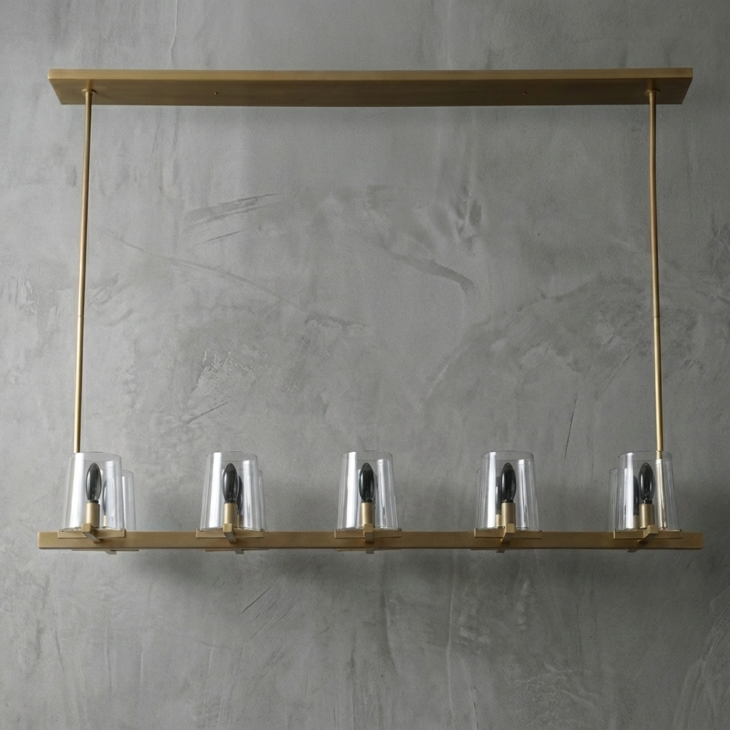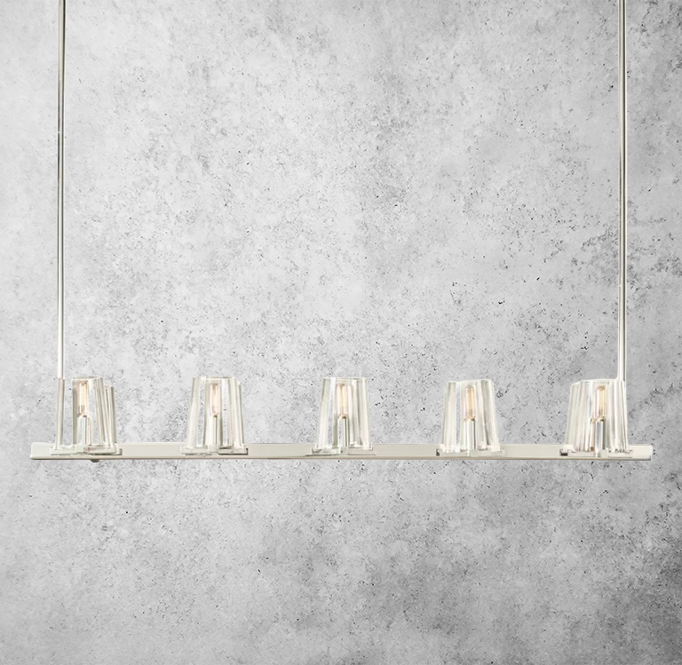 The Calice Linear Chandelier 49" pairs a refined brass arc frame with faceted hand-blown glass dome shades for a sculptural, goblet-inspired silhouette. Influenced by 1950s Italian lighting, its prismatic glass softly reflects and refracts light for an elegant statement over dining tables, kitchen islands, and long living spaces.