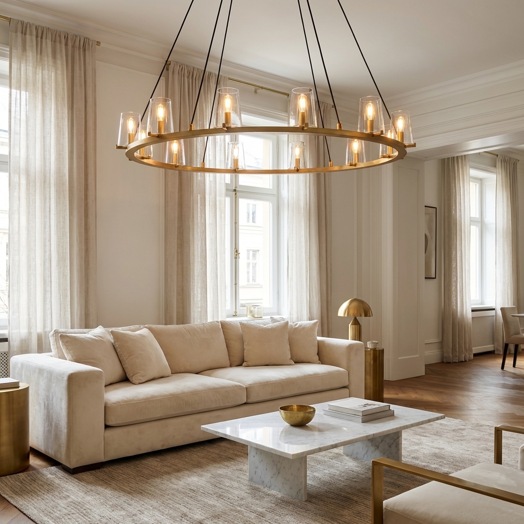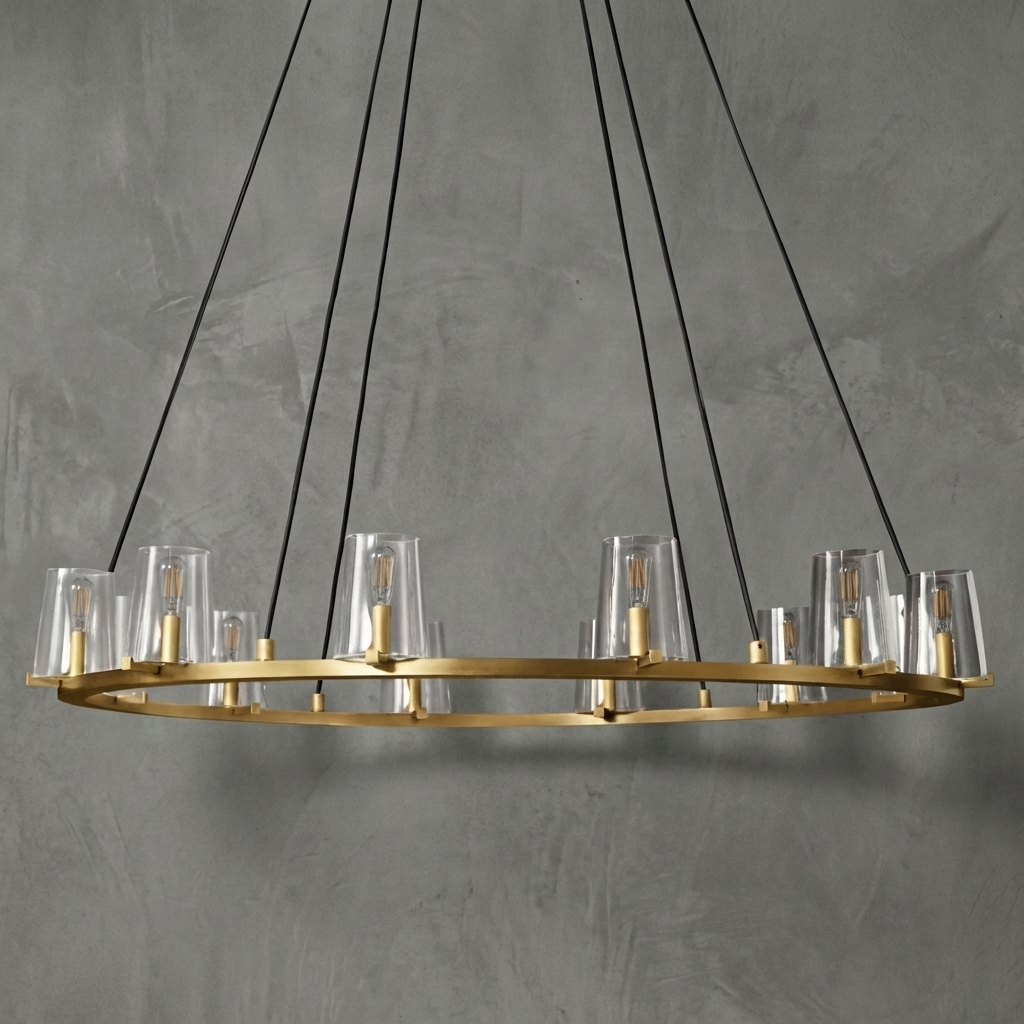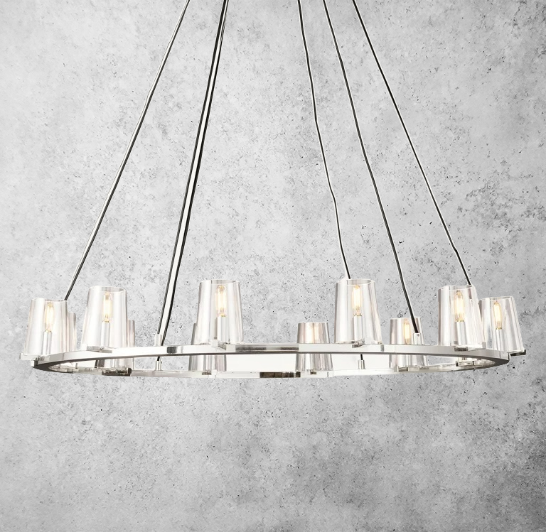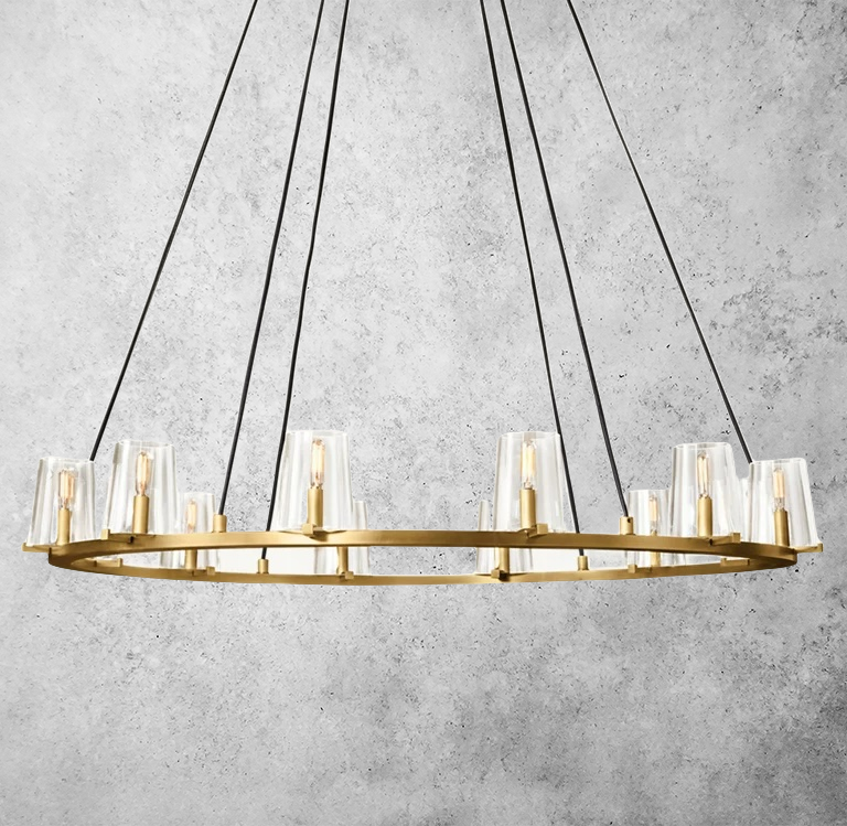 The Calice Round Chandelier 48" pairs a refined brass arc frame with faceted, hand-blown glass dome shades for a sculptural, prismatic look. Inspired by 1950s Italian lighting, its elegant goblet-like silhouette reflects and refracts light beautifully, making it a striking focal point above dining tables, in living rooms, foyers, and hospitality interiors.