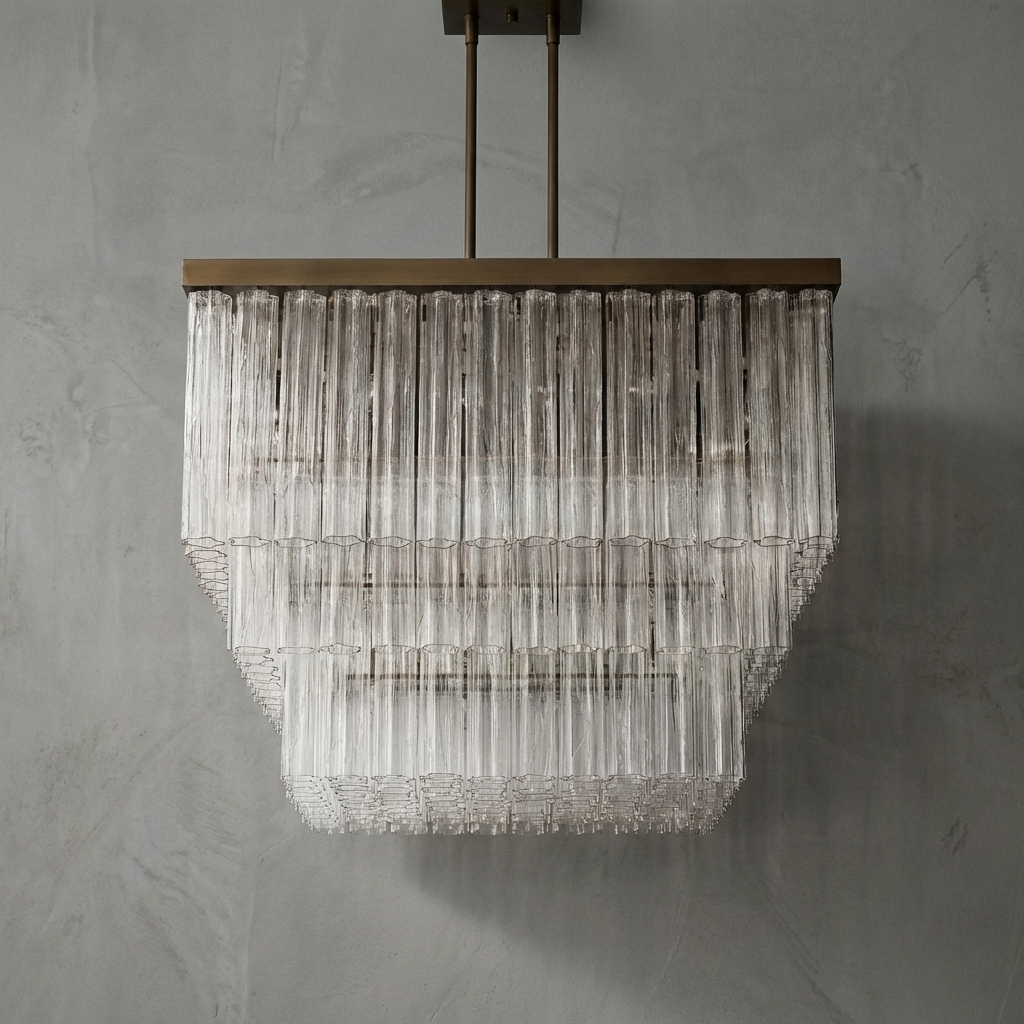 - Style: Square chandelier with fluted glass tubes and brass-frame look