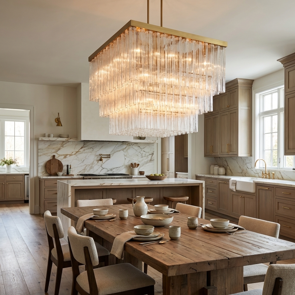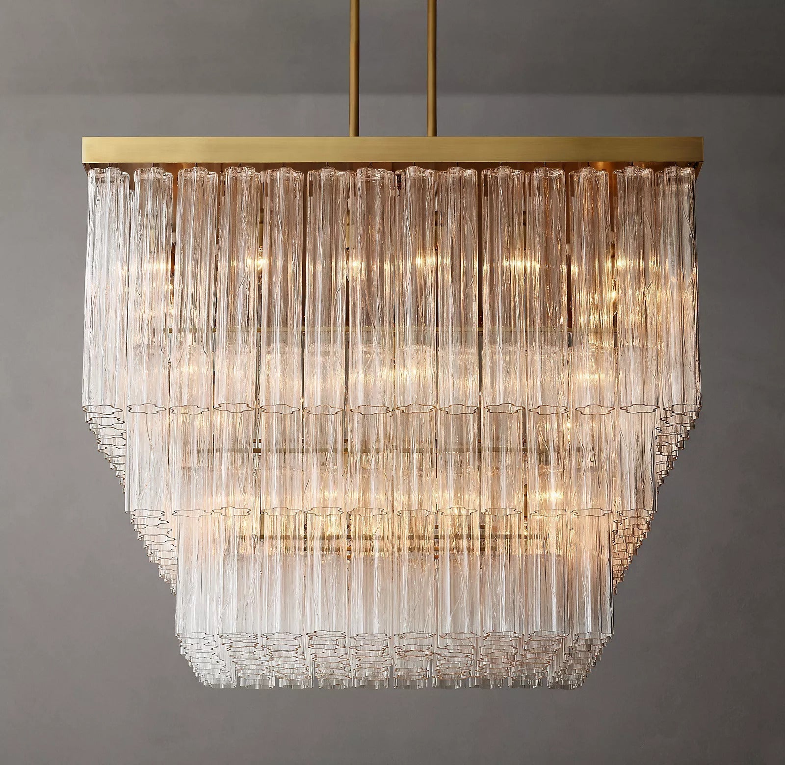 The Cannelure Square Chandelier 45″ 25-Lights / 60‘’ (Customized) brings sculptural elegance to large interiors with a refined rectangular silhouette, fluted glass tubes, and a metal frame finished in your choice of lacquered burnished brass, bronze, or polished stainless steel. Inspired by the visual richness of layered glass and the rhythmic beauty of linear fluting, this statement chandelier casts a shimmering, patterned glow across dining rooms, living spaces, villas, and hospitality settings.