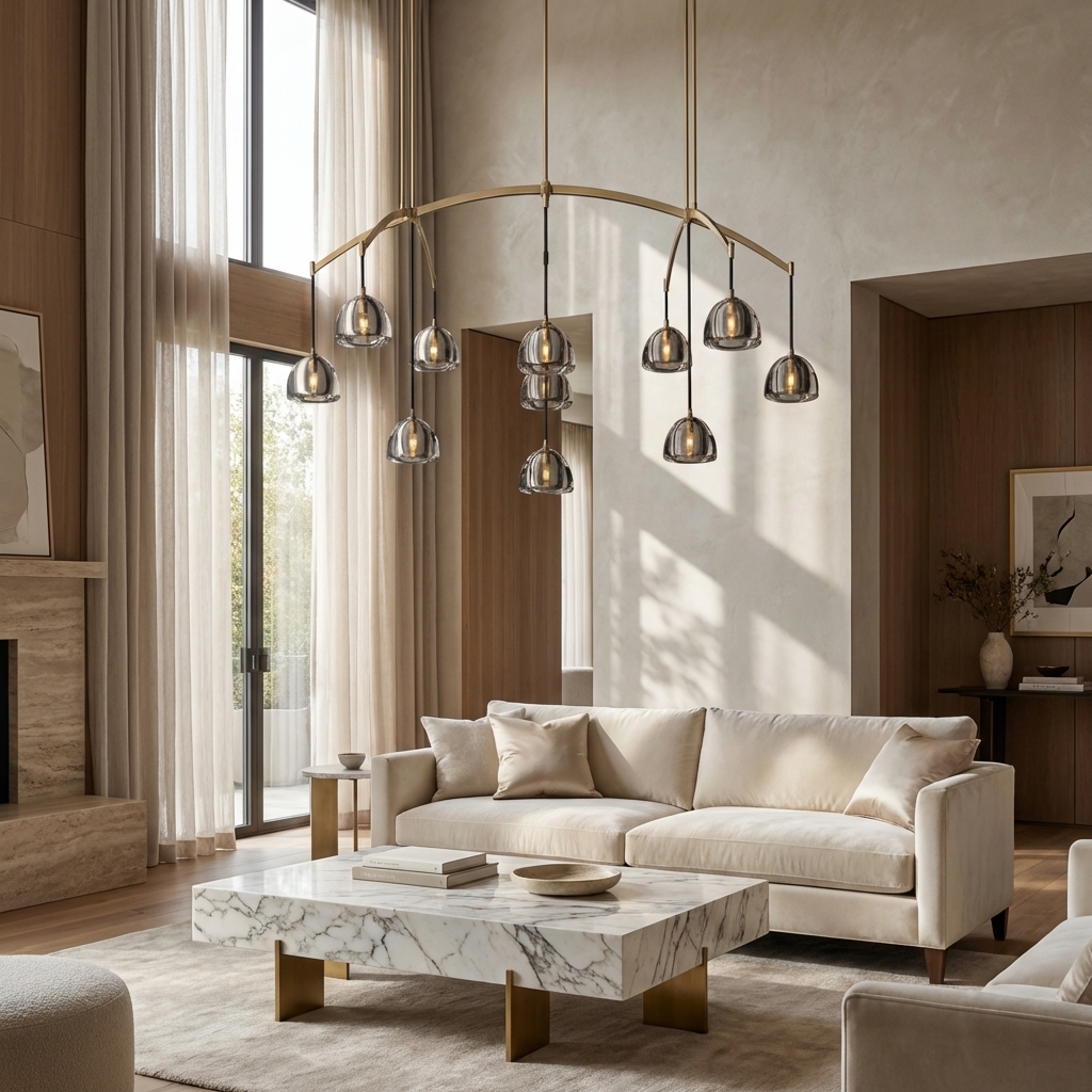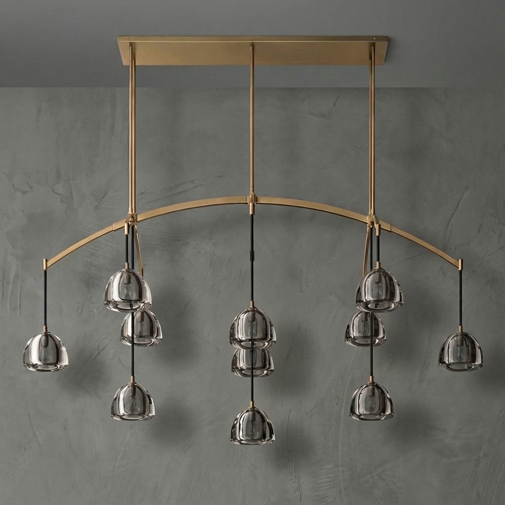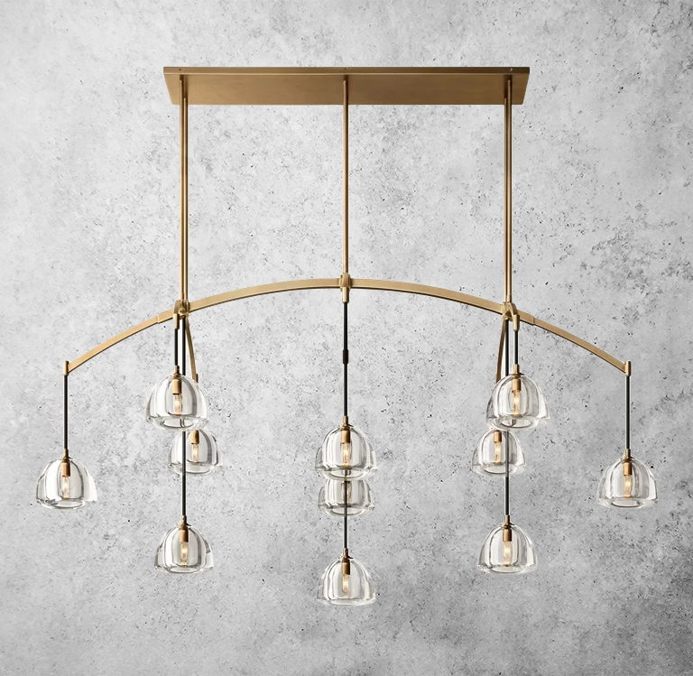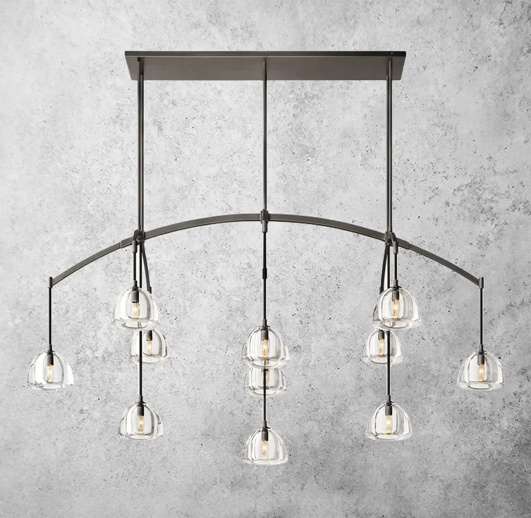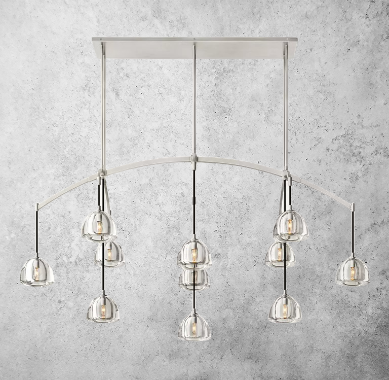 Cascada Linear Chandelier 72'' brings dramatic, architectural light to long dining tables, grand living spaces, and refined hospitality interiors. Defined by its tiered arrangement of fluted crystal glass tubes in a cascading drum silhouette, this statement chandelier creates a waterfall-like glow when illuminated.