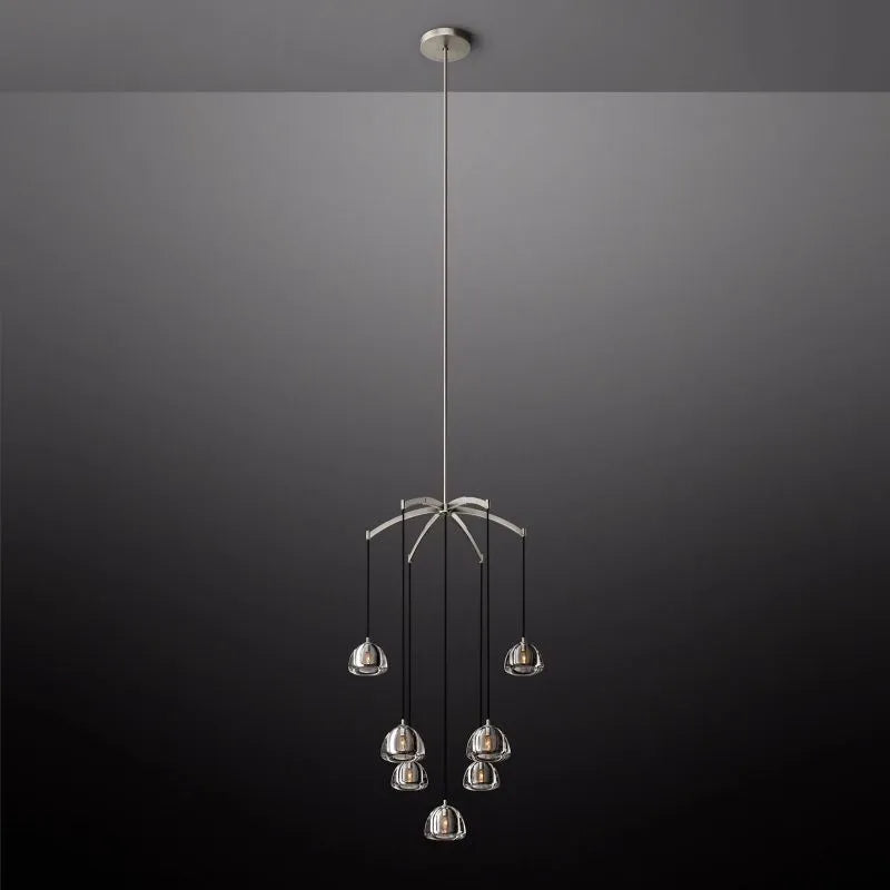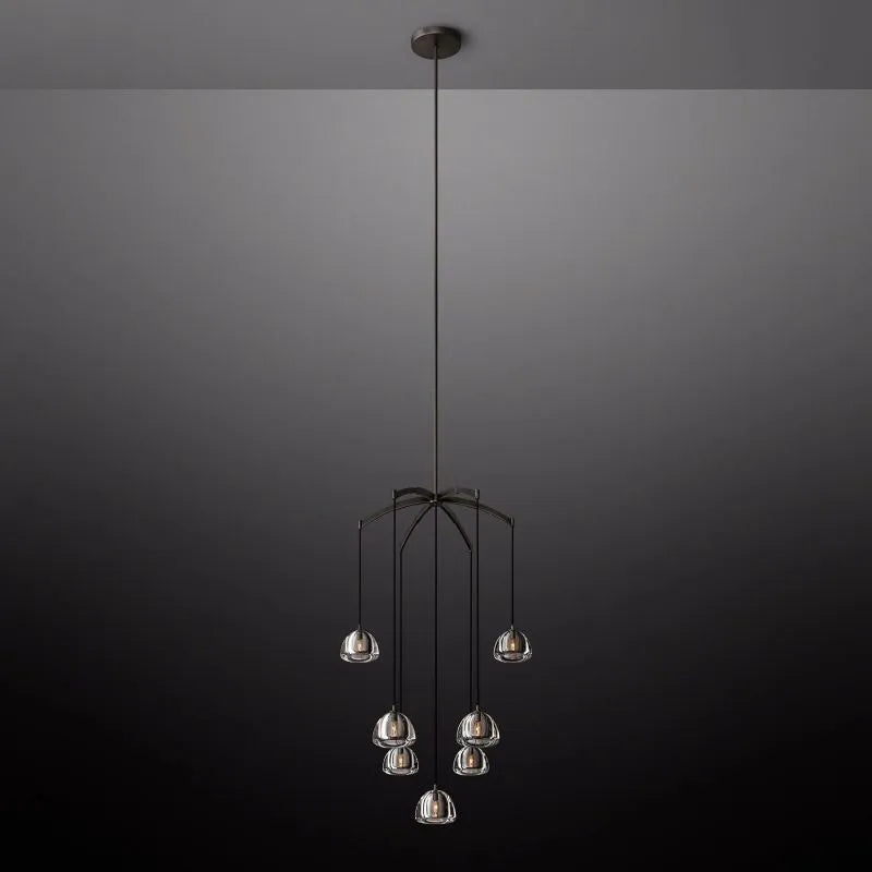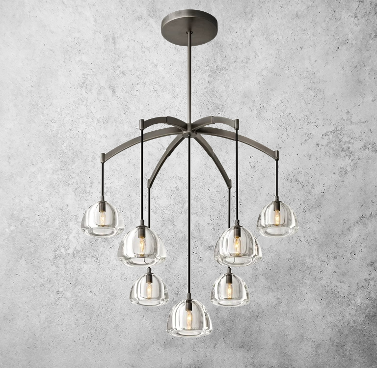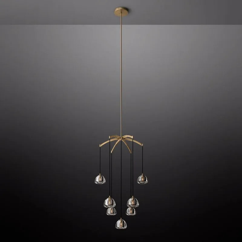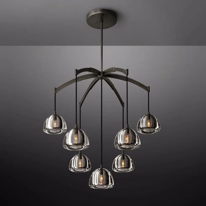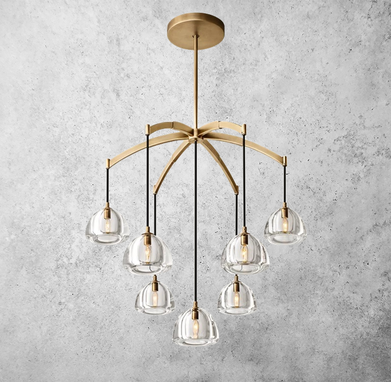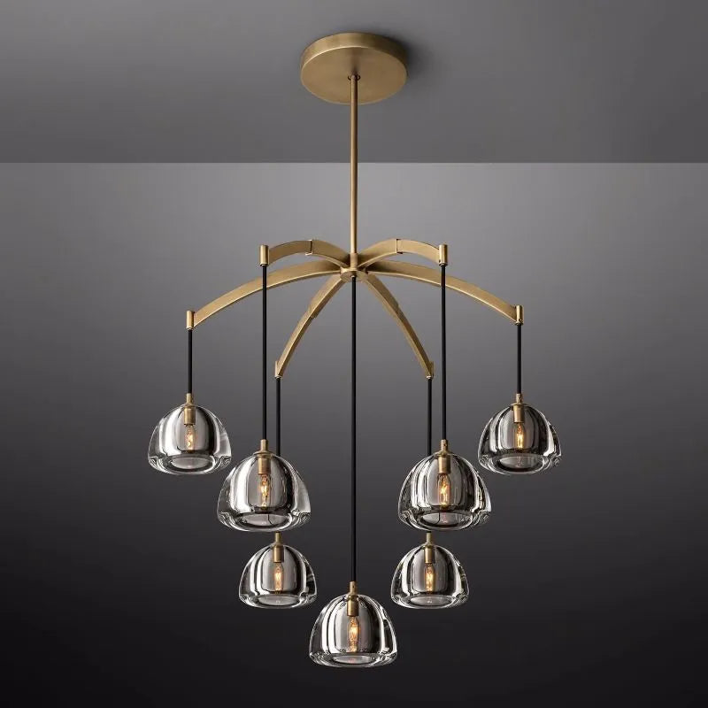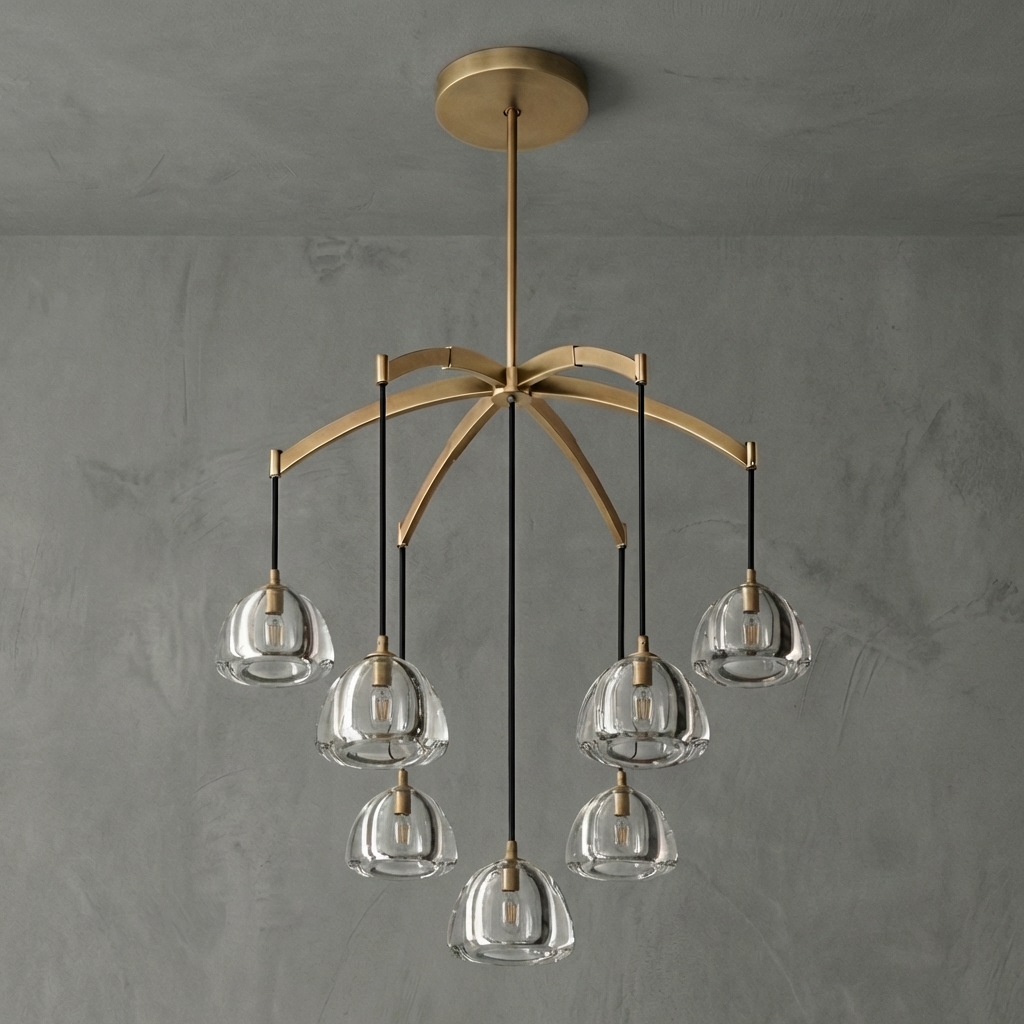 Designed with a handcrafted solid brass frame and ceiling canopy, this chandelier pairs substantial crystal elements with delicate architectural curves. Each thick glass shade is lathe-carved from a solid block of crystal and polished by hand for exceptional clarity and depth.