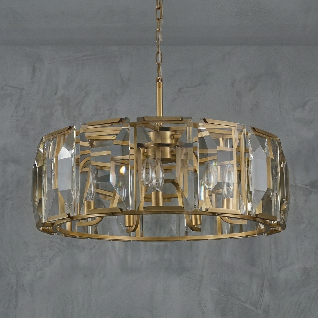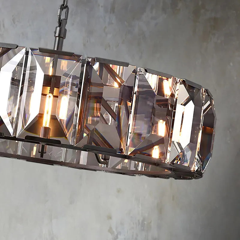 The Cassette Round Chandelier 19" 31" 38" 43" 60"D pairs a bold iron cage frame with large faceted crystal glass panels for a striking, architectural look. Inspired by the glamour of the 1970s, its spaced rectangular prismatic crystal bands are secured by substantial metal brackets at the top and bottom, creating a dramatic ring of light reminiscent of emerald-cut diamonds.