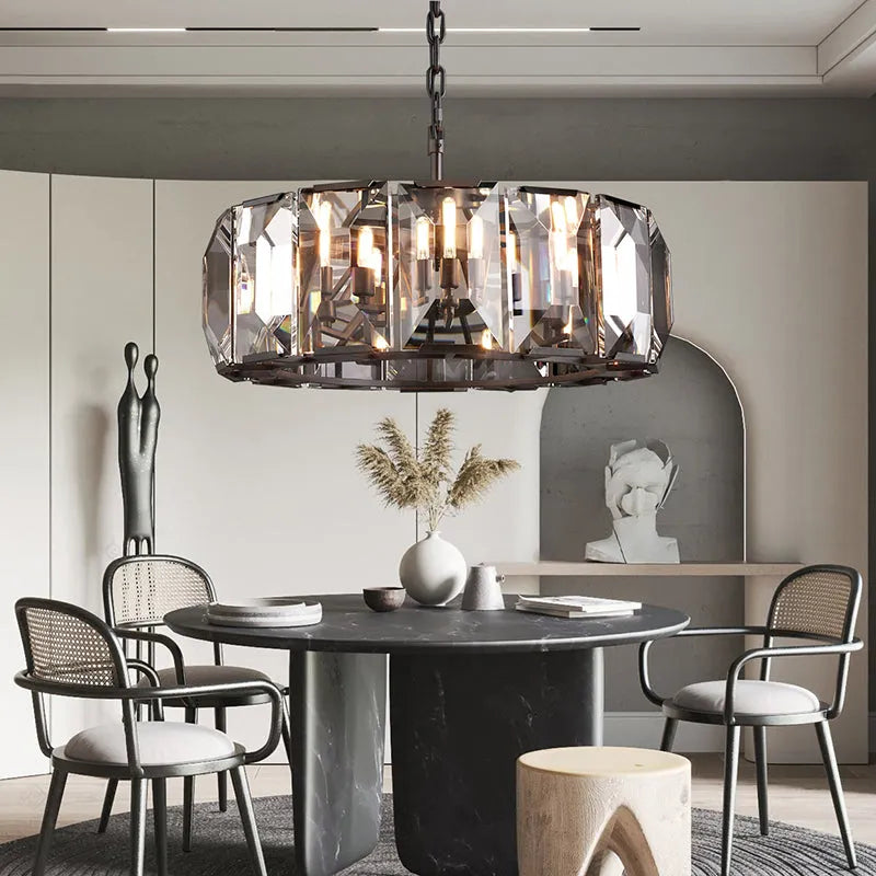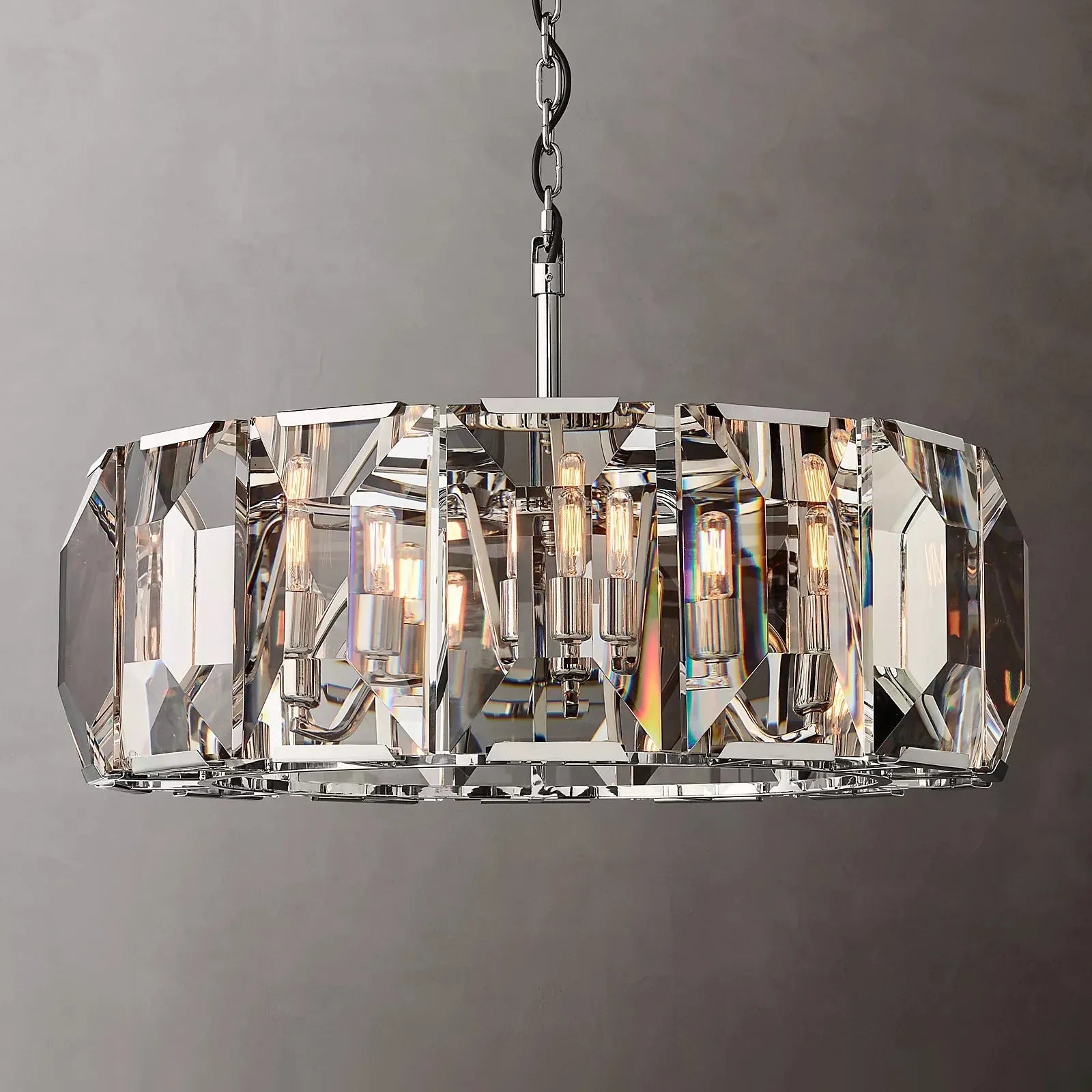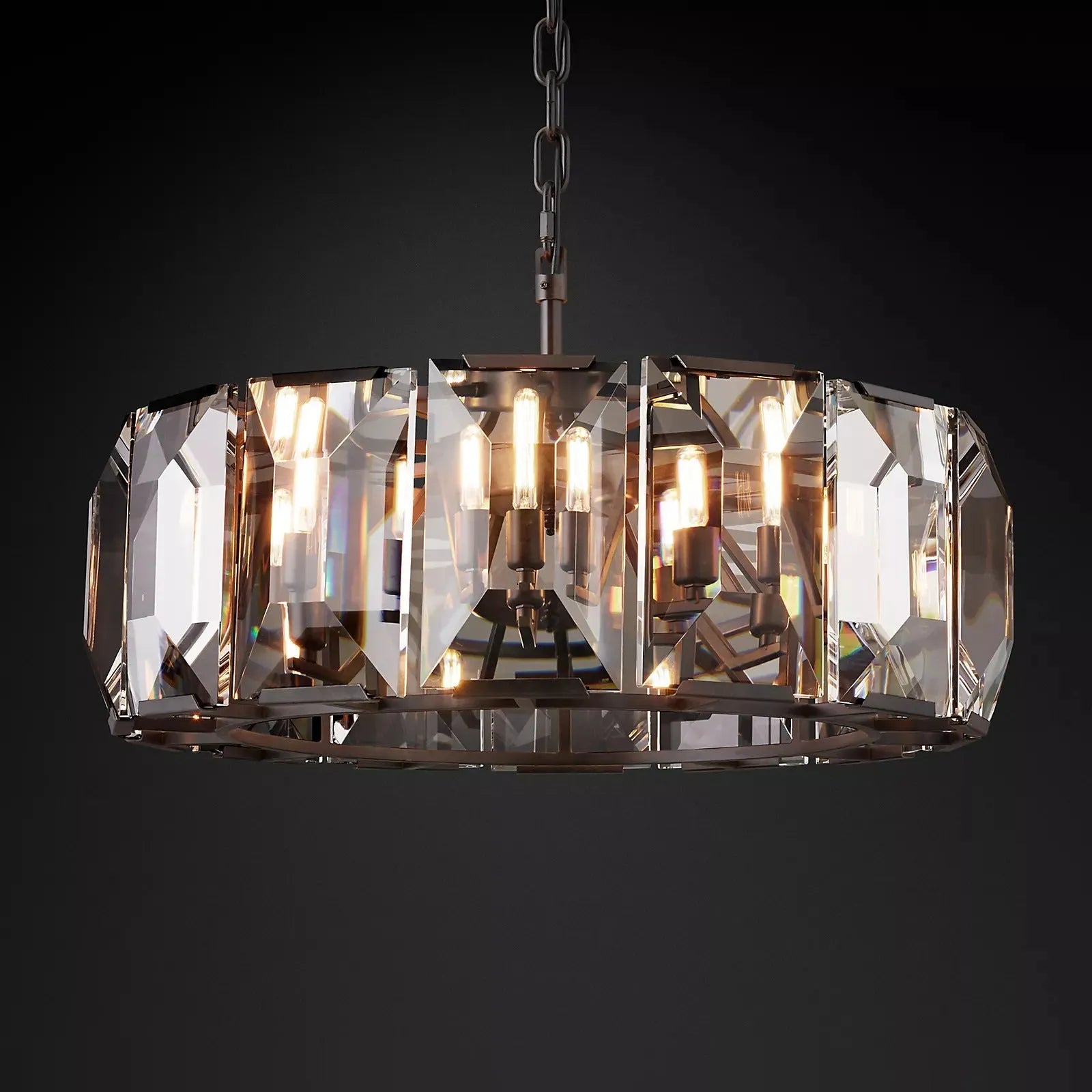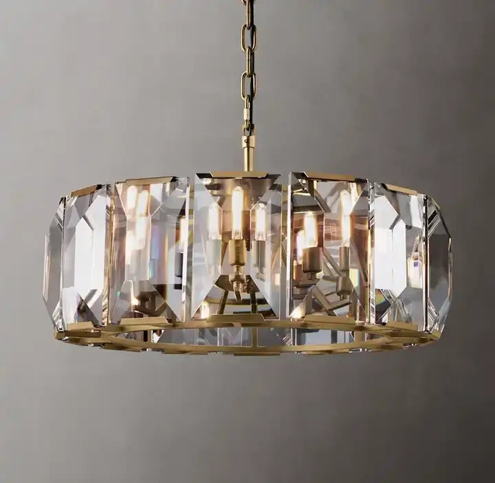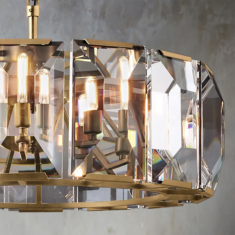 The Cassette Round Chandelier 31" pairs a bold brass-toned iron cage with oversized faceted crystal panels for a glamorous, architectural statement. Inspired by 1970s design, its circular arrangement of emerald-cut-style crystal prisms reflects and refracts light beautifully, casting shimmering patterns across walls and floors.