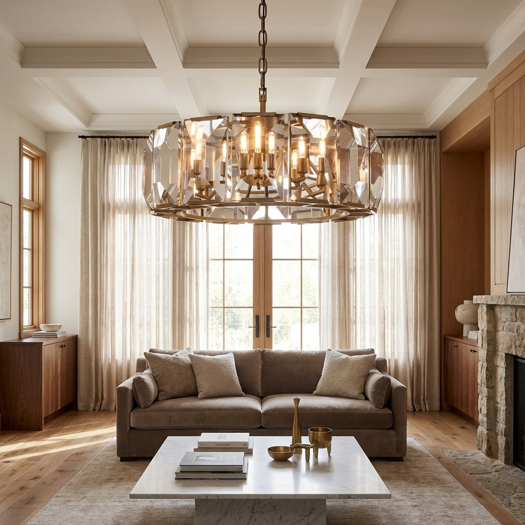 With its sculptural brass-toned frame and jewel-like crystal clarity, the Cassette Round Chandelier 31" delivers striking illumination and timeless glamour in equal measure.
