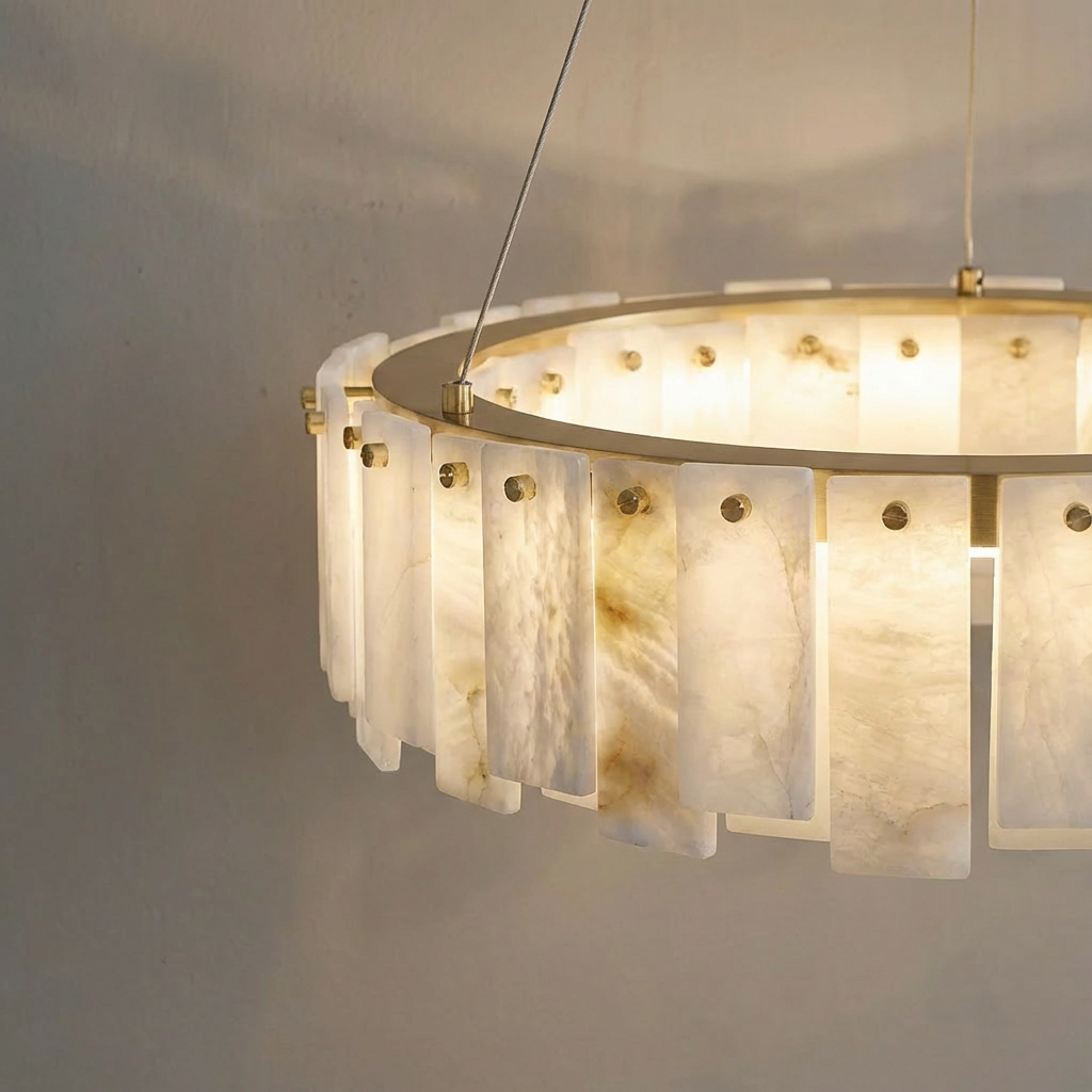 Introducing the Celestial Alabaster Round Chandelier - a serene centerpiece designed to bathe your space in calm, diffused light. A broad alabaster disc softly illuminates, allowing the stone's natural mineral gradients to glow gently from the center to the outer edge, creating a tranquil ambient presence. Crafted in luminous alabaster, each disc reveals unique veining and tonal variation, adding subtle depth and character. The understated hardware is thoughtfully refined, making this chandelier equally at home in minimalist interiors or warm transitional spaces. Whether suspended over a dining table, in a living room, or as a statement in an entryway, the Celestial Alabaster Round Chandelier brings an elegant, modern glow that feels both luxurious and quietly timeless.