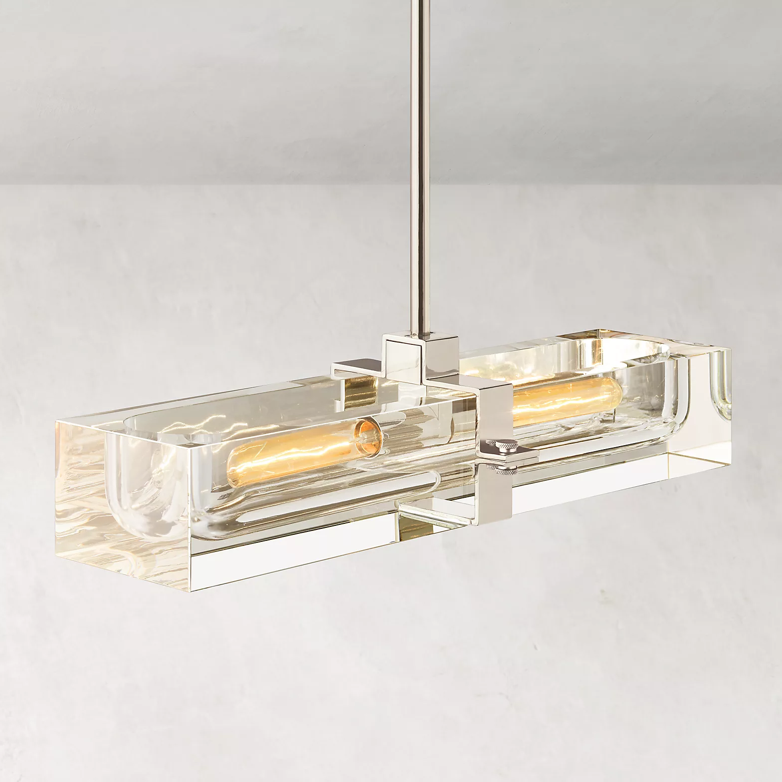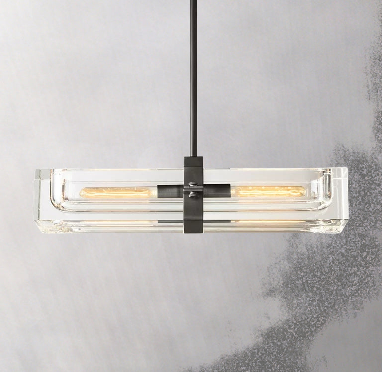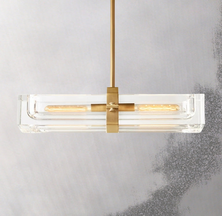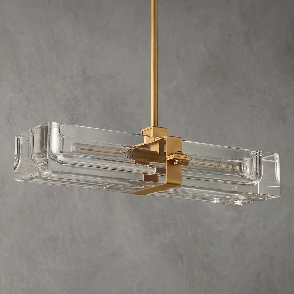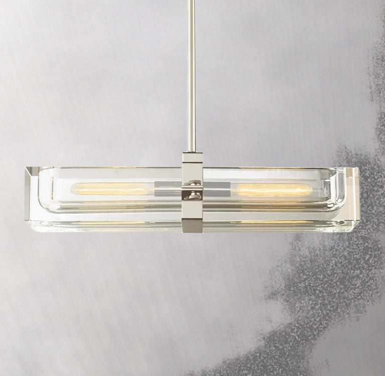 The Cilindra Linear Chandelier 24" 2-lights pairs sculptural clarity with warm metal detailing for a look that feels both industrial and refined. Two clear K9 crystal glass cylinders are carved to house visible Edison-style bulbs within a solid brass frame, creating a dramatic balance of weight, transparency, and glow. When illuminated, the crystal refracts and reflects the light beautifully; when off, it maintains a clean, airy presence over a dining table, kitchen island, or bar.