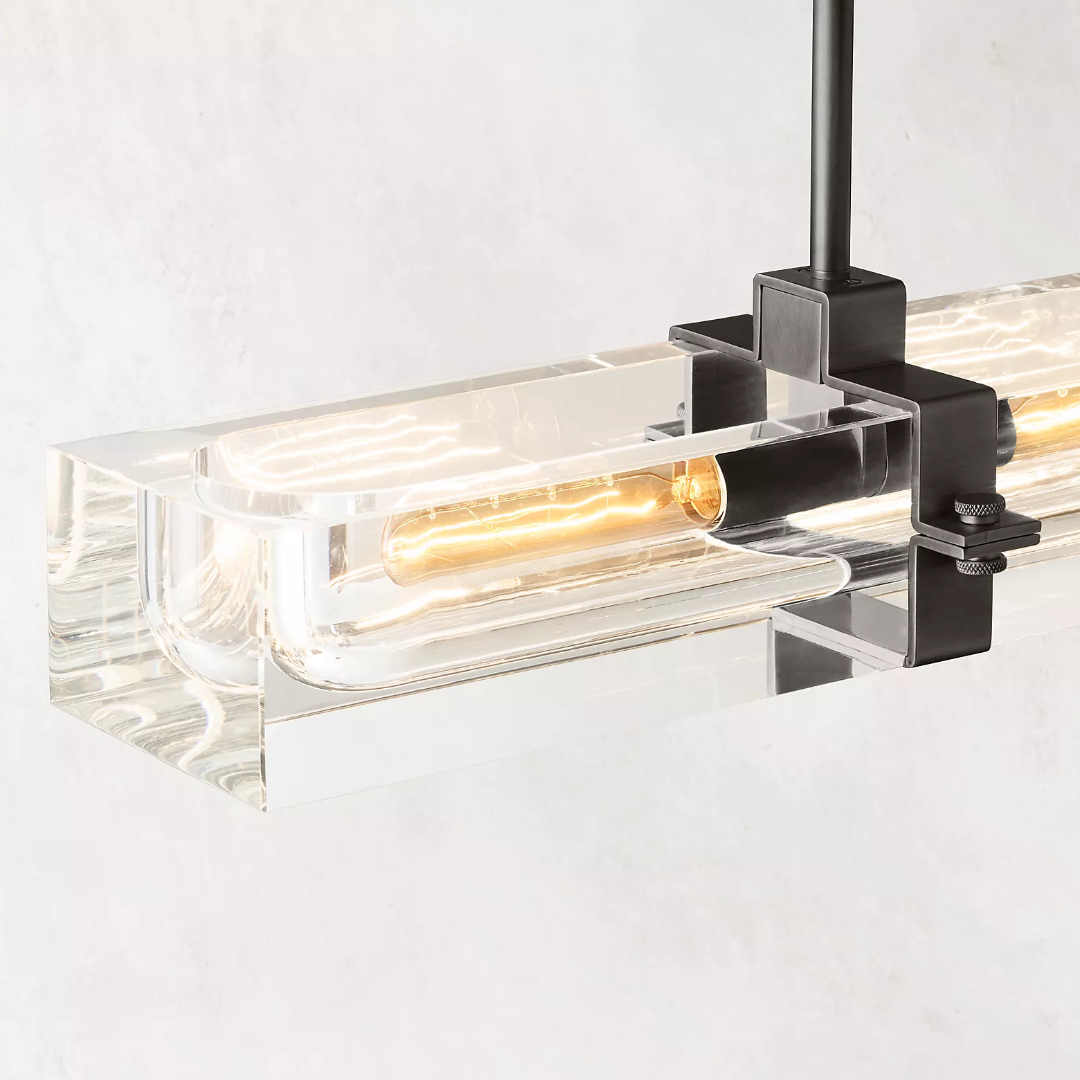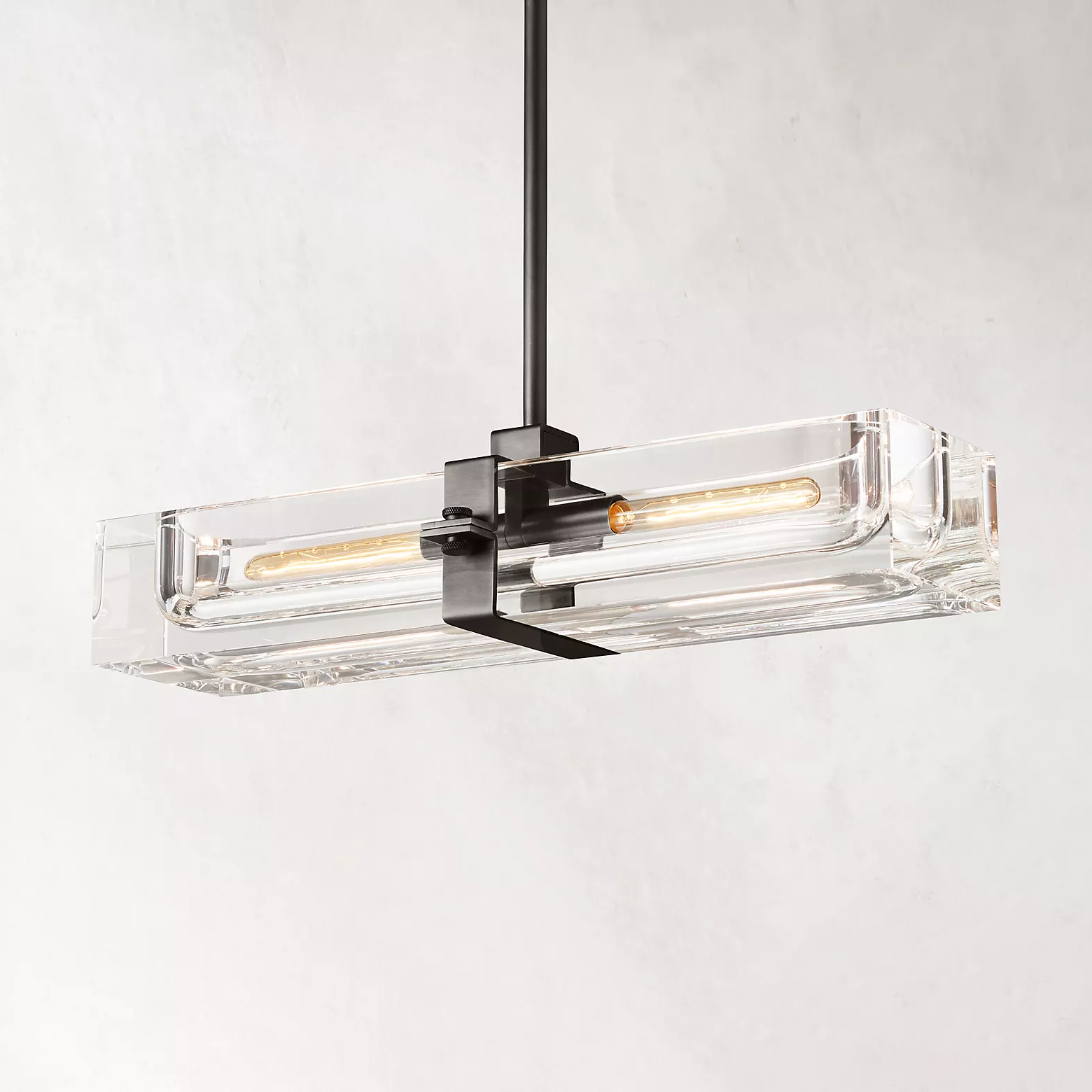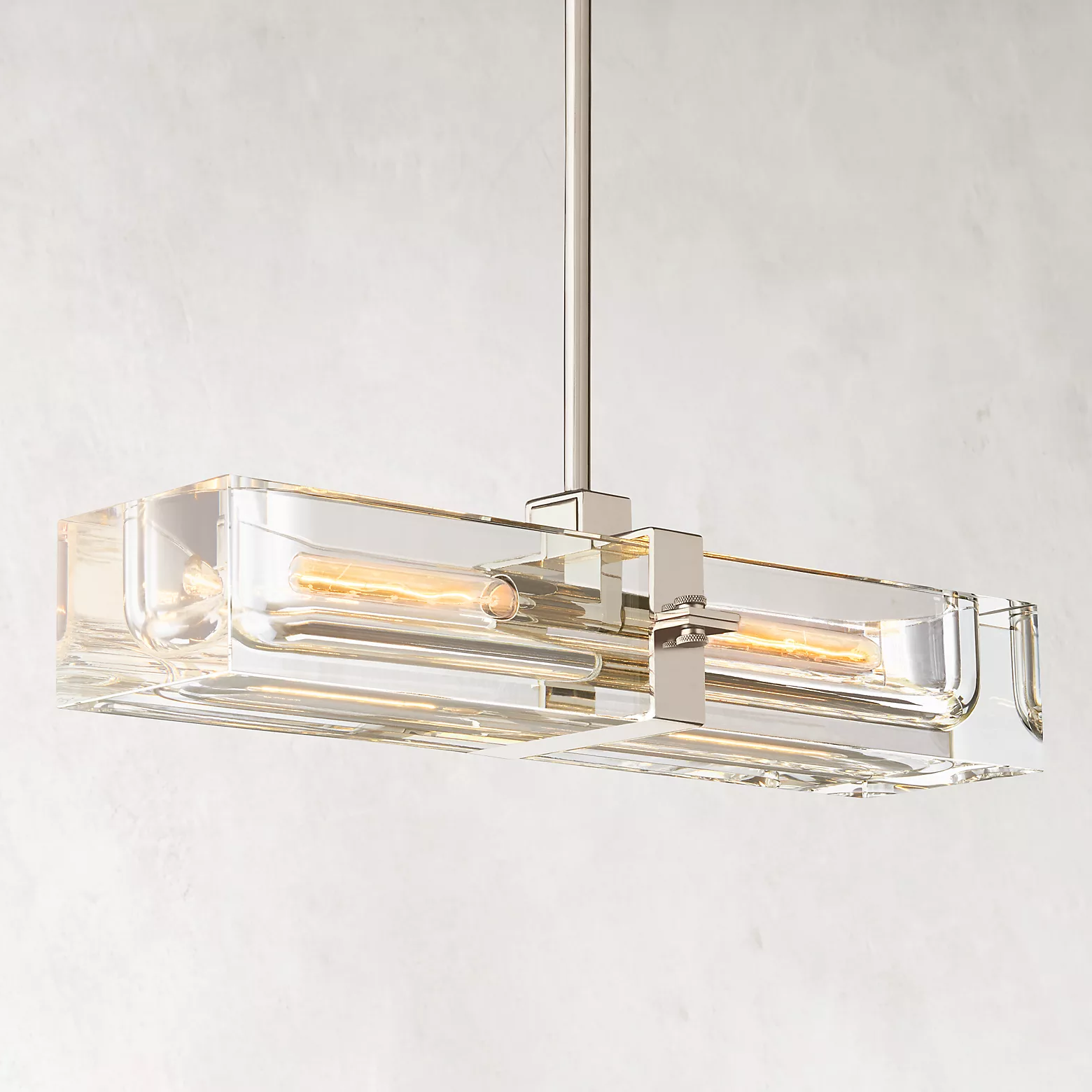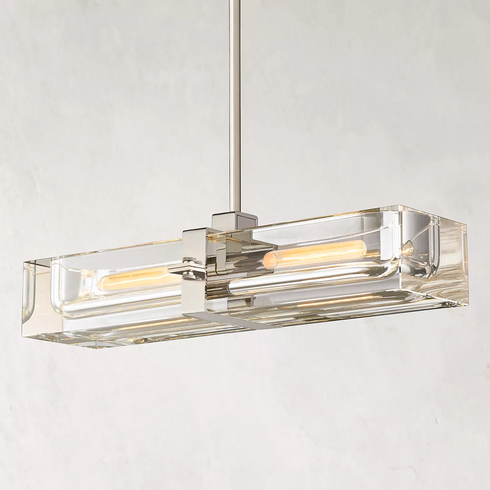 The Cilindra Linear Chandelier 24" 2-lights pairs sculptural clarity with warm metal detailing for a look that feels both industrial and refined. Two clear K9 crystal glass cylinders are carved to house visible Edison-style bulbs within a solid brass frame, creating a dramatic balance of weight, transparency, and glow. When illuminated, the crystal refracts and reflects the light beautifully; when off, it maintains a clean, airy presence over a dining table, kitchen island, or bar.