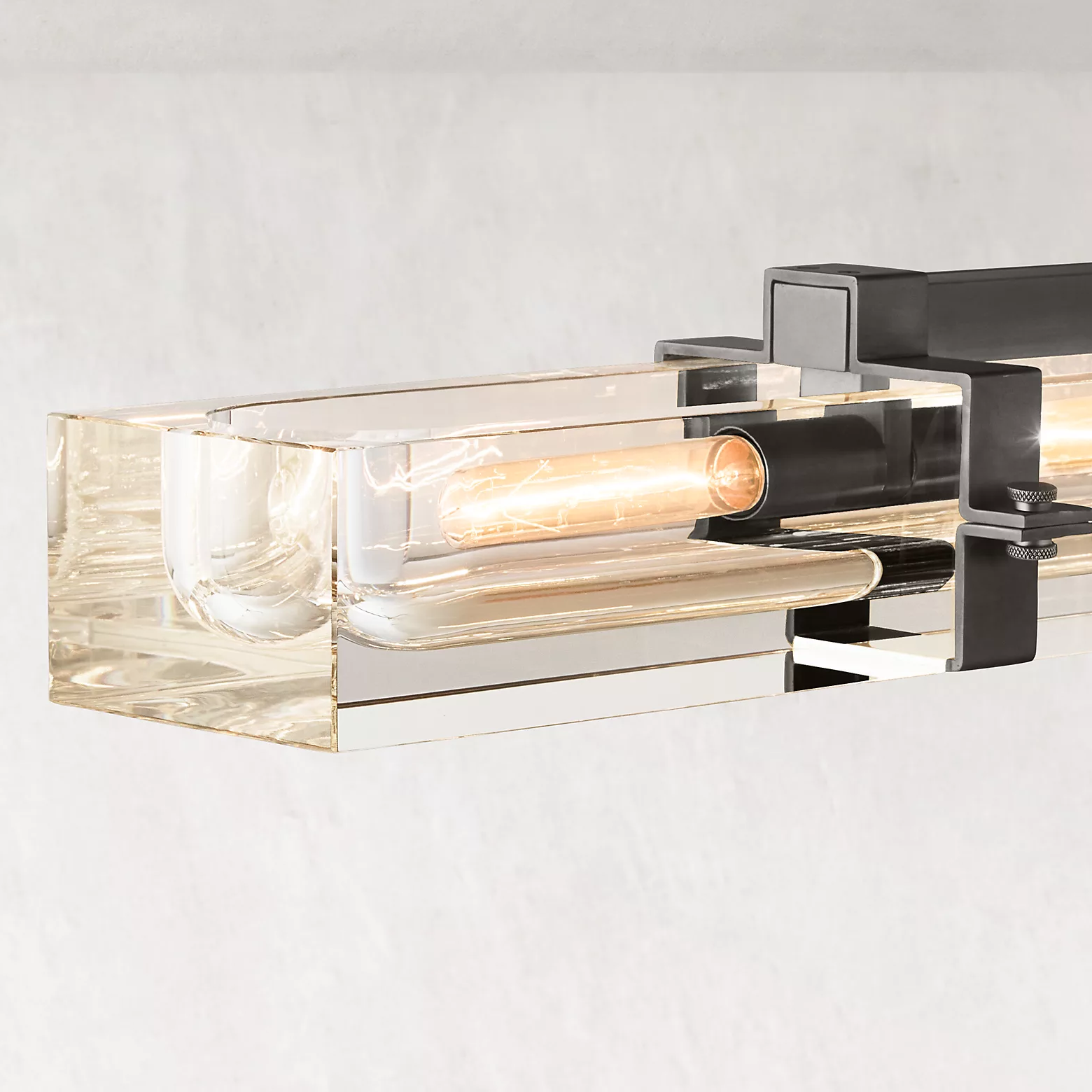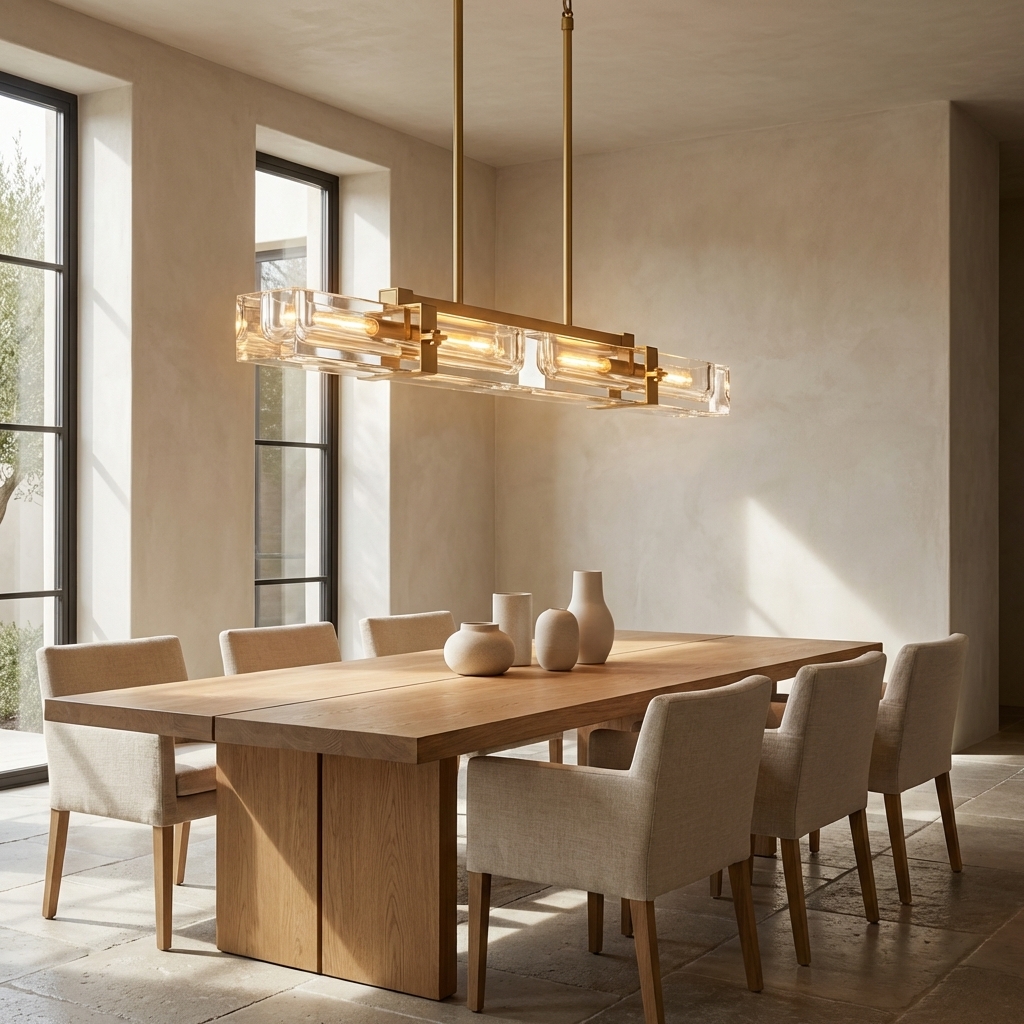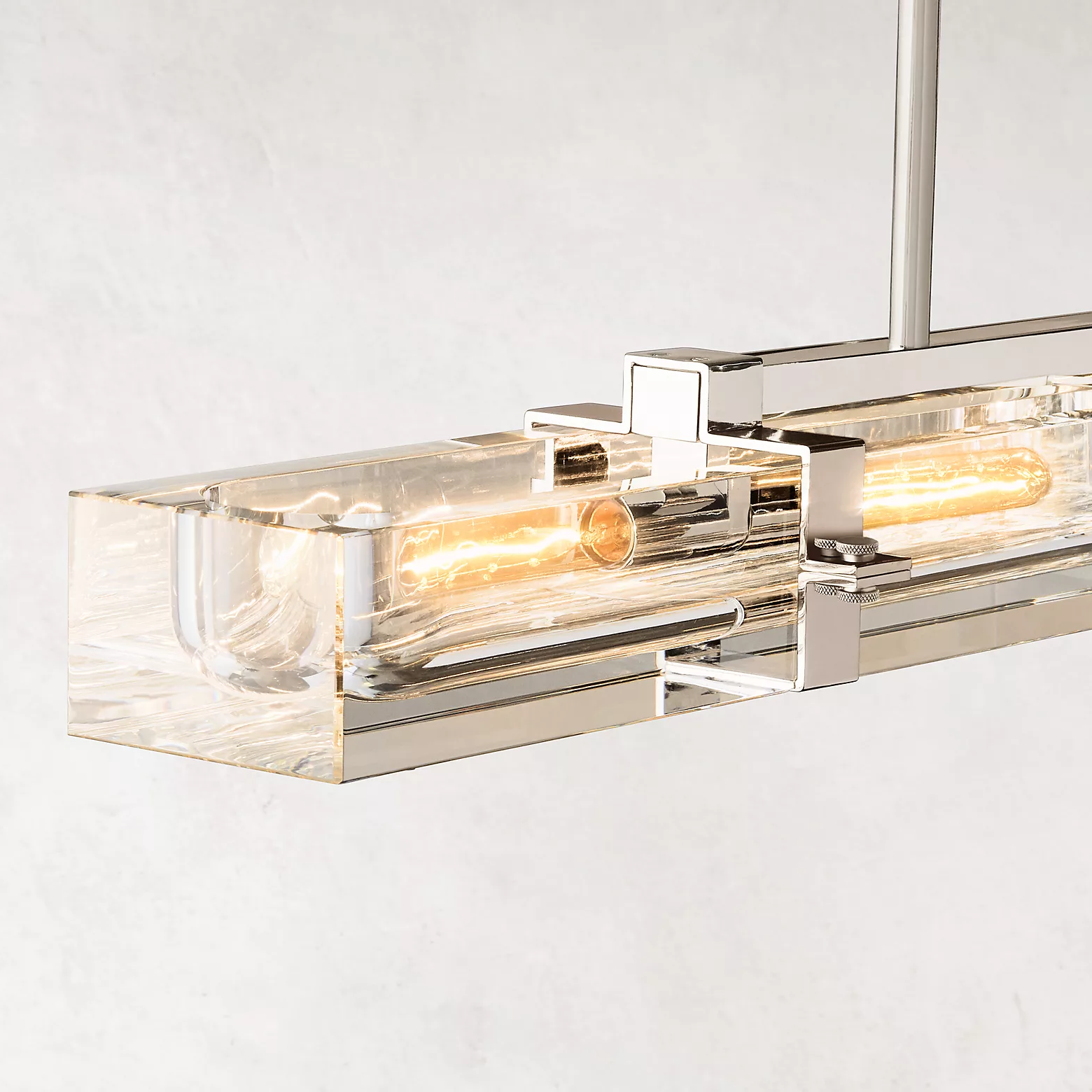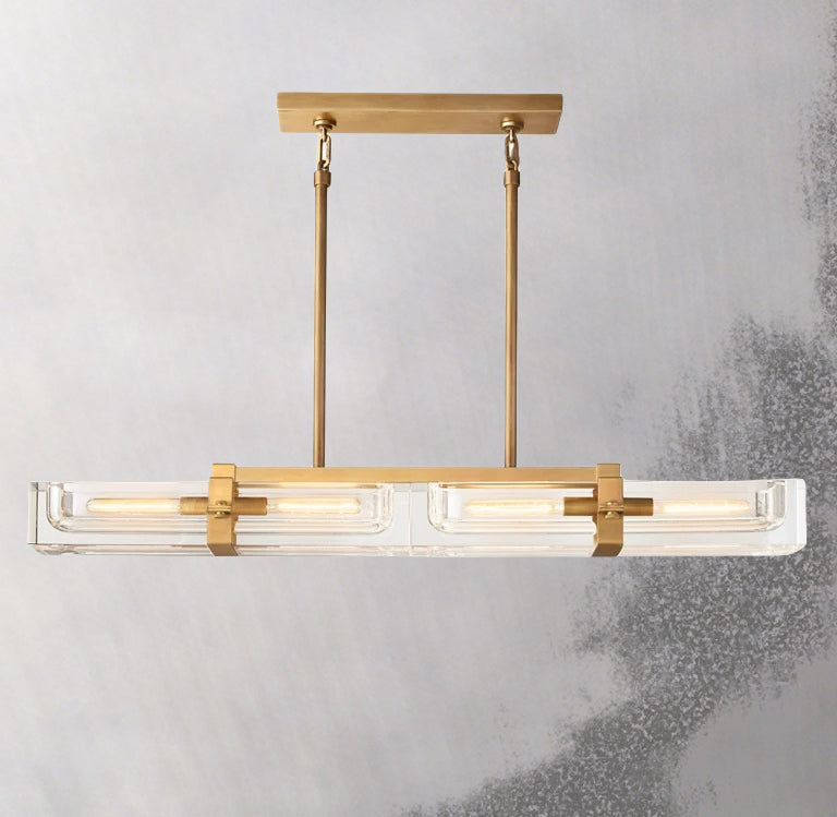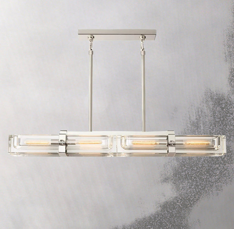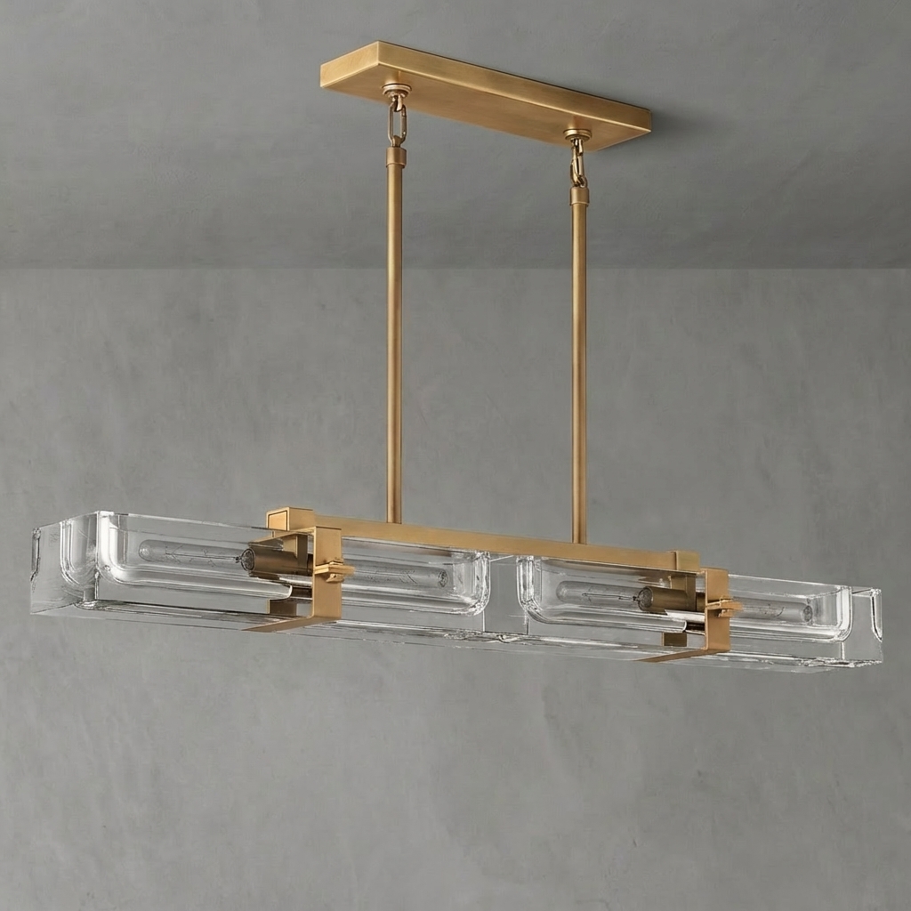The Cilindra Linear Chandelier 48" 4-lights brings an industrial-meets-refined presence to dining rooms, kitchens, and living spaces with its clear crystal-glass cylinders, visible Edison-style bulbs, and solid brass detailing. Each recessed crystal channel is designed to cradle the bulb within a substantial brass frame, creating a dramatic interplay of refraction, reflection, and warm illumination.