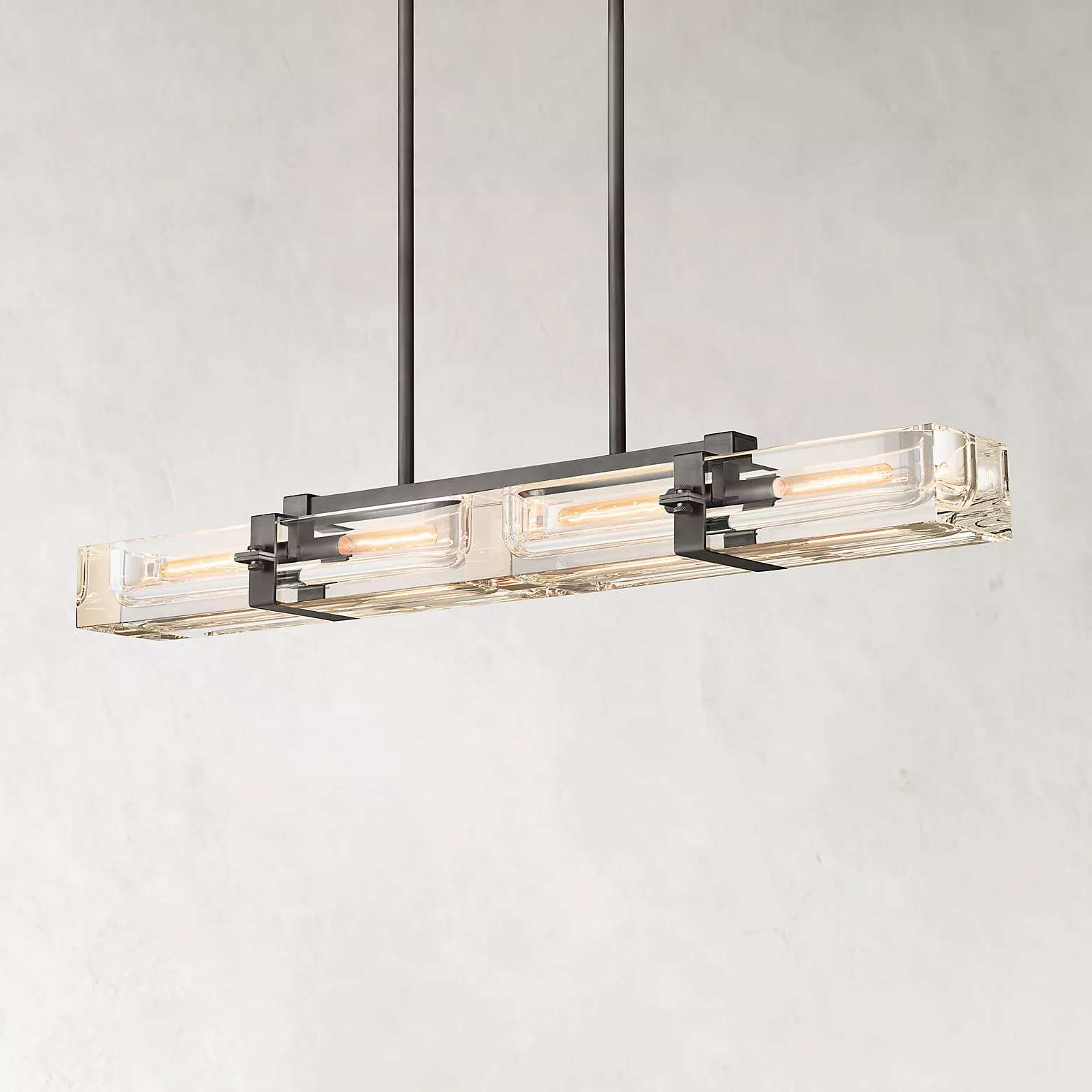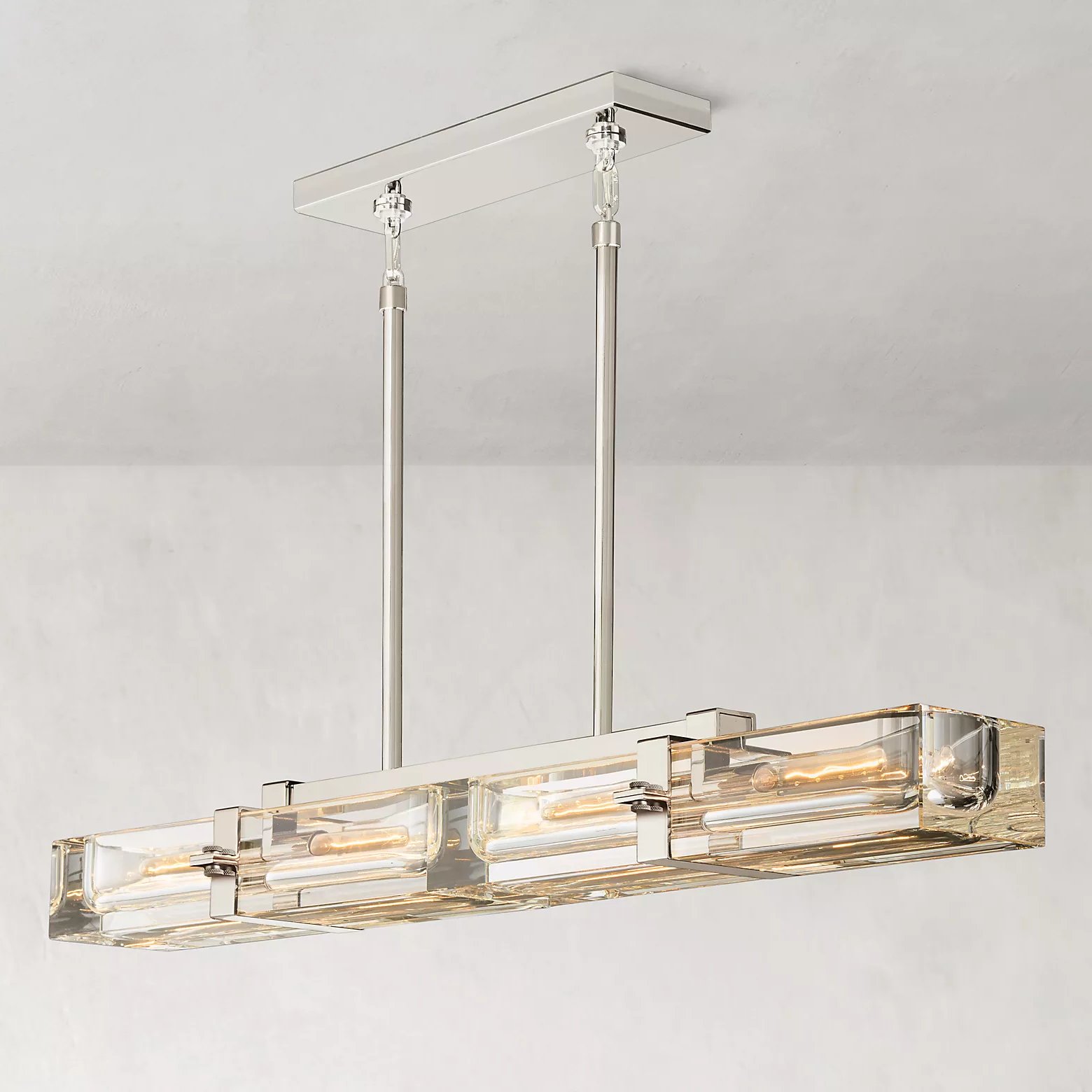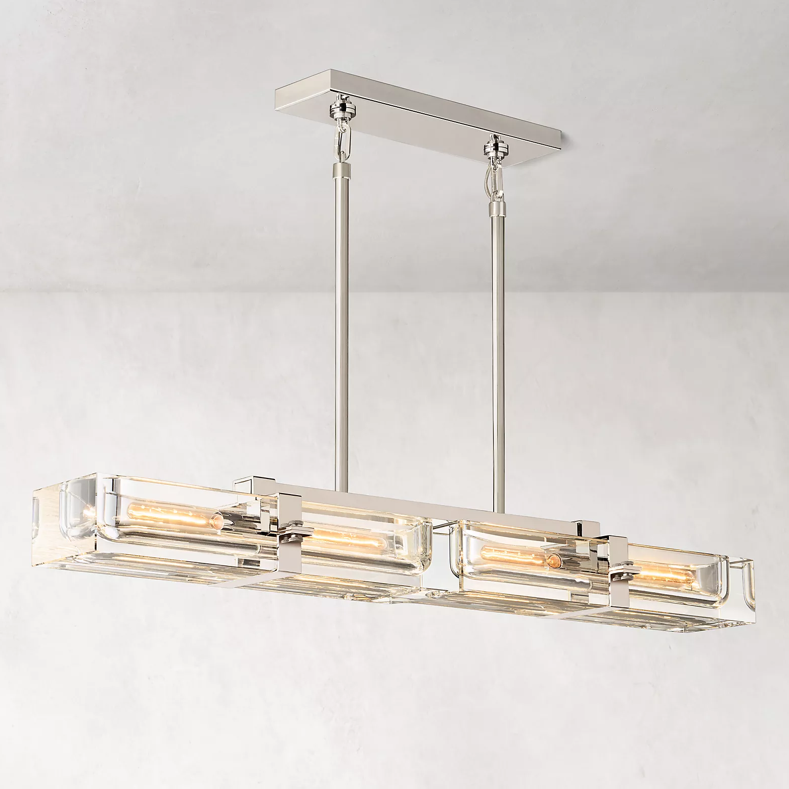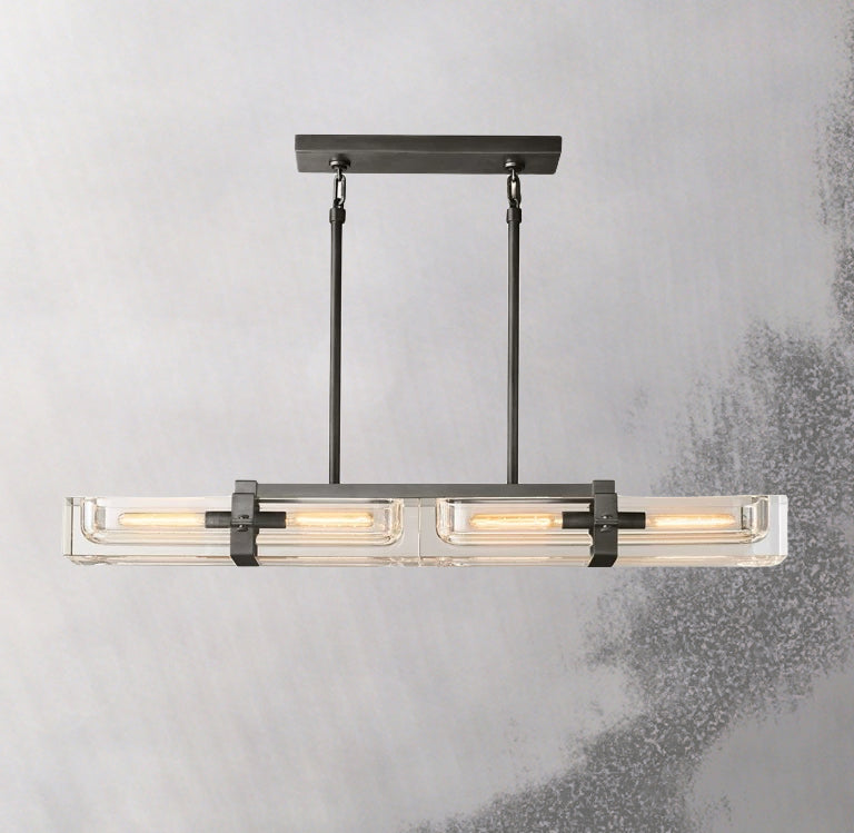 With a 48" wide linear body and four-light configuration, this chandelier makes a bold statement while maintaining visual clarity through its weightless transparent glass form. Available in Lacquered Burnished Brass, Bronze, or Polished Nickel, it suits both modern and classic interiors.