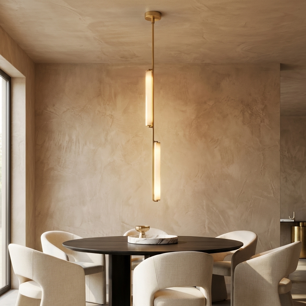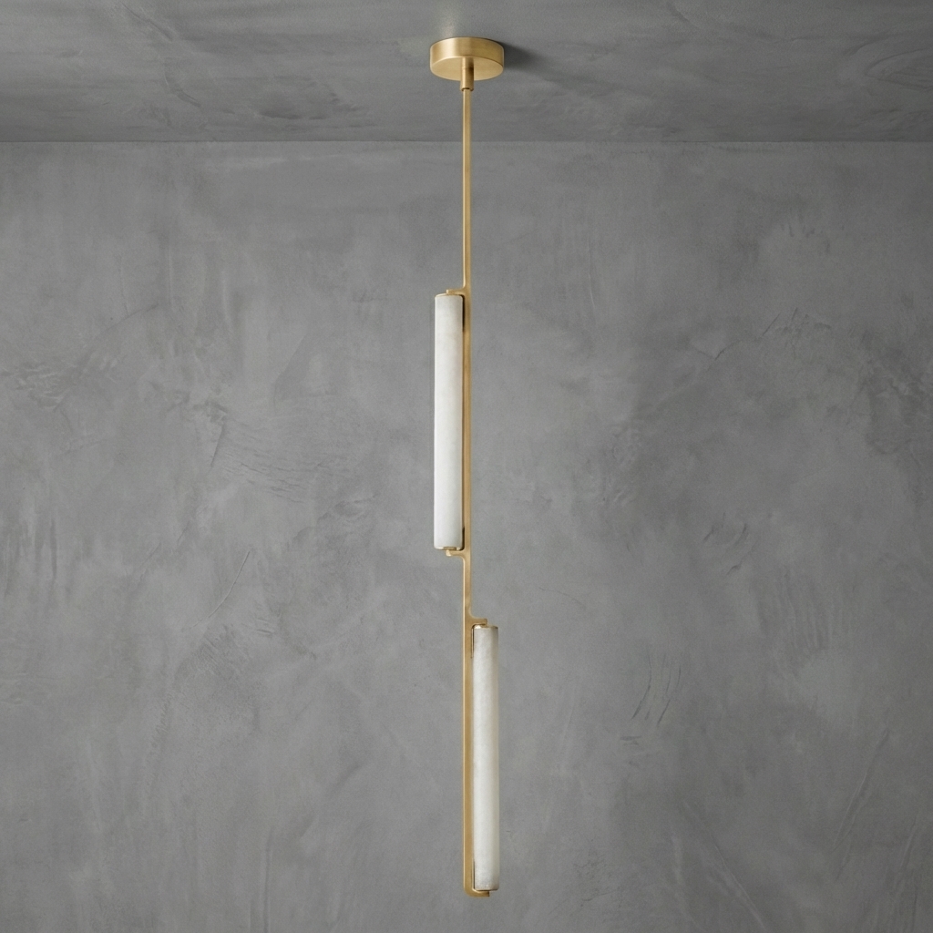 Inspired by a minimalist 1960s Italian sensibility, this pendant pairs natural material character with clean vertical structure. The result is a fixture that feels both sculptural and restrained, offering warm atmospheric light while emphasizing the beauty of the alabaster cylinder silhouette.