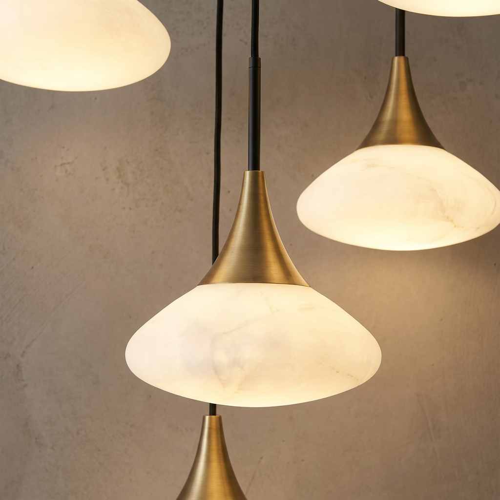 Introducing the Duco L Alabaster Chandelier - a modern statement piece defined by its unusually translucent stone sections, allowing the light to reveal nuanced, natural variations unique to each piece of alabaster. The result is a warm, architectural glow that feels both refined and quietly dramatic. The design emphasizes sculptural restraint, keeping the alabaster as the visual anchor while the metal elements provide a calm, understated structure. This balance of natural stone and sleek metal creates a sense of modern organic sophistication, making the chandelier feel intentional in both form and function. Ideal for curated living rooms, refined dining areas, transitional hallways, or elevated hospitality spaces, the Duco L Chandelier brings subtle texture and atmosphere to interiors that value thoughtful, ambient lighting.