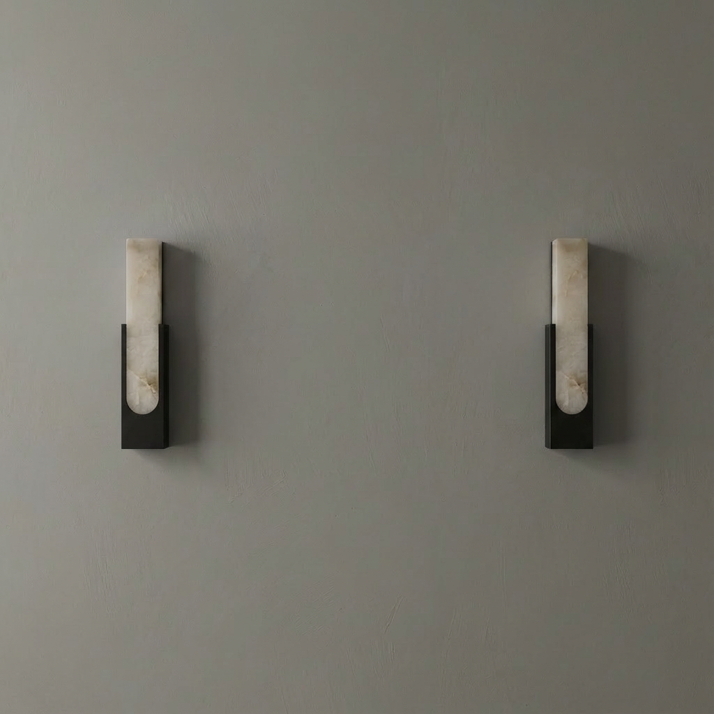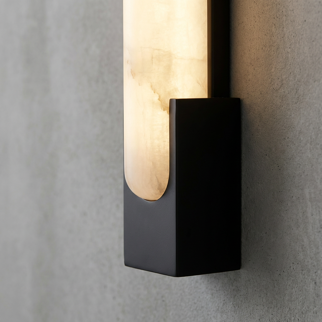 Introducing the Emilia Alabaster Wall Lamp - a refined study in sculptural restraint and natural beauty. Each piece is carved to emphasize the alabaster's mineral striations, allowing the illumination to reveal subtle nuances unique to the stone. The result is a warm, atmospheric glow that feels both architectural and organic. The design keeps alabaster as the clear focal point, while the metal elements offer quiet structure and balance. This modern, understated composition brings a sense of sophistication and calm to any setting. Perfect for curated living rooms, refined dining areas, transitional hallways, or elevated hospitality spaces, the Emilia Alabaster Wall Lamp is made for interiors where lighting is chosen with intention and where natural texture and modern elegance are essential.