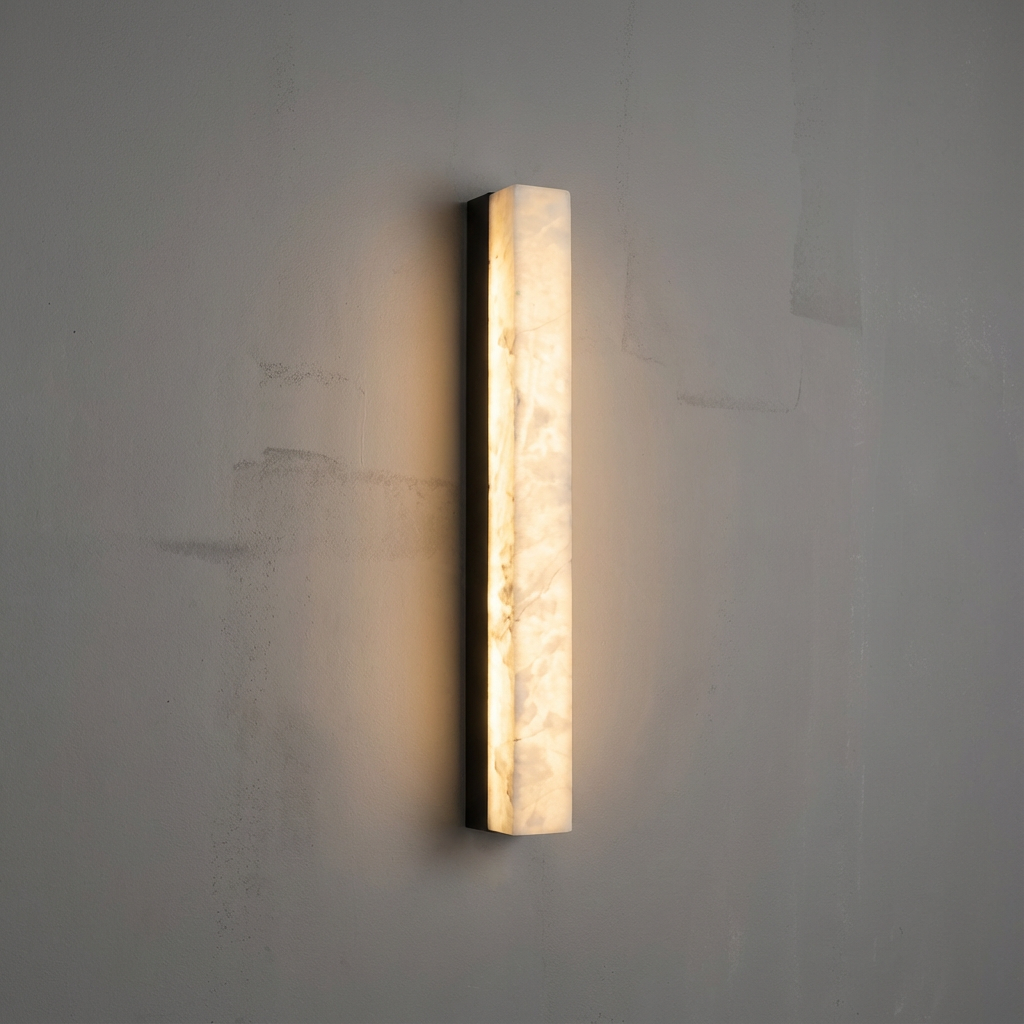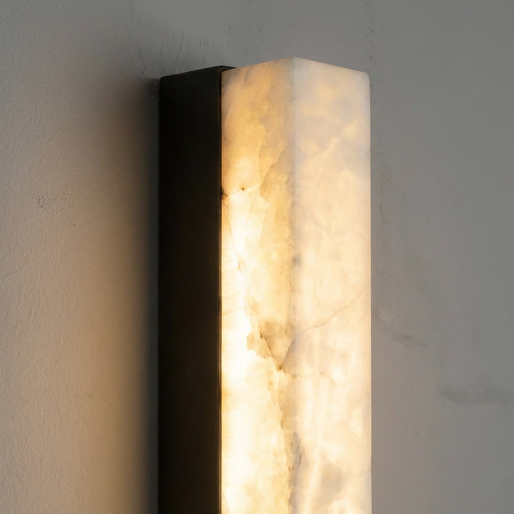 Introducing the Eric Alabaster Wall Sconce - a refined study in sculptural restraint and modern organic sophistication. Cool nickel accents provide a subtle contrast to the rich alabaster, allowing the illumination to reveal the stone's unique natural nuances and textures. The design keeps alabaster as the visual anchor, while the metal elements offer a quiet, architectural structure. Its warm, atmospheric glow and understated presence make it an ideal choice for curated living rooms, refined dining areas, transitional hallways, or hospitality spaces where lighting is meant to feel intentional and artfully composed.