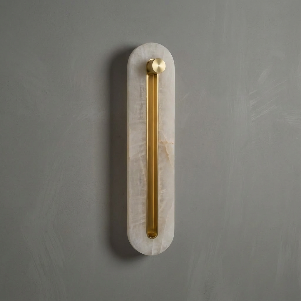 Introducing the Fader Alabaster Wall Lamp - a vertically poised piece that allows light to reveal the natural nuances and depth of its alabaster stone. The refined silhouette highlights the gentle veining and organic character of the material, creating a softly luminous focal point on any wall. Sculptural restraint defines the design, with the alabaster as the visual anchor and the metal elements providing a quiet, architectural framework. The result is a modern, organic composition that feels both elevated and understated. With its warm, atmospheric glow and subtle natural texture, this wall lamp is well suited to curated living rooms, refined dining areas, transitional hallways, and hospitality spaces where lighting is meant to feel intentional, inviting, and artful.