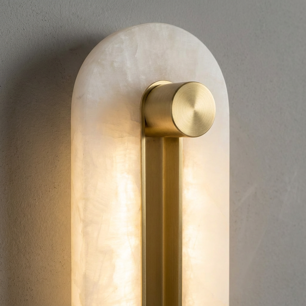 Introducing the Fader Alabaster Wall Lamp - a vertically poised piece that allows light to reveal the natural nuances and depth of its alabaster stone. The refined silhouette highlights the gentle veining and organic character of the material, creating a softly luminous focal point on any wall. Sculptural restraint defines the design, with the alabaster as the visual anchor and the metal elements providing a quiet, architectural framework. The result is a modern, organic composition that feels both elevated and understated. With its warm, atmospheric glow and subtle natural texture, this wall lamp is well suited to curated living rooms, refined dining areas, transitional hallways, and hospitality spaces where lighting is meant to feel intentional, inviting, and artful.