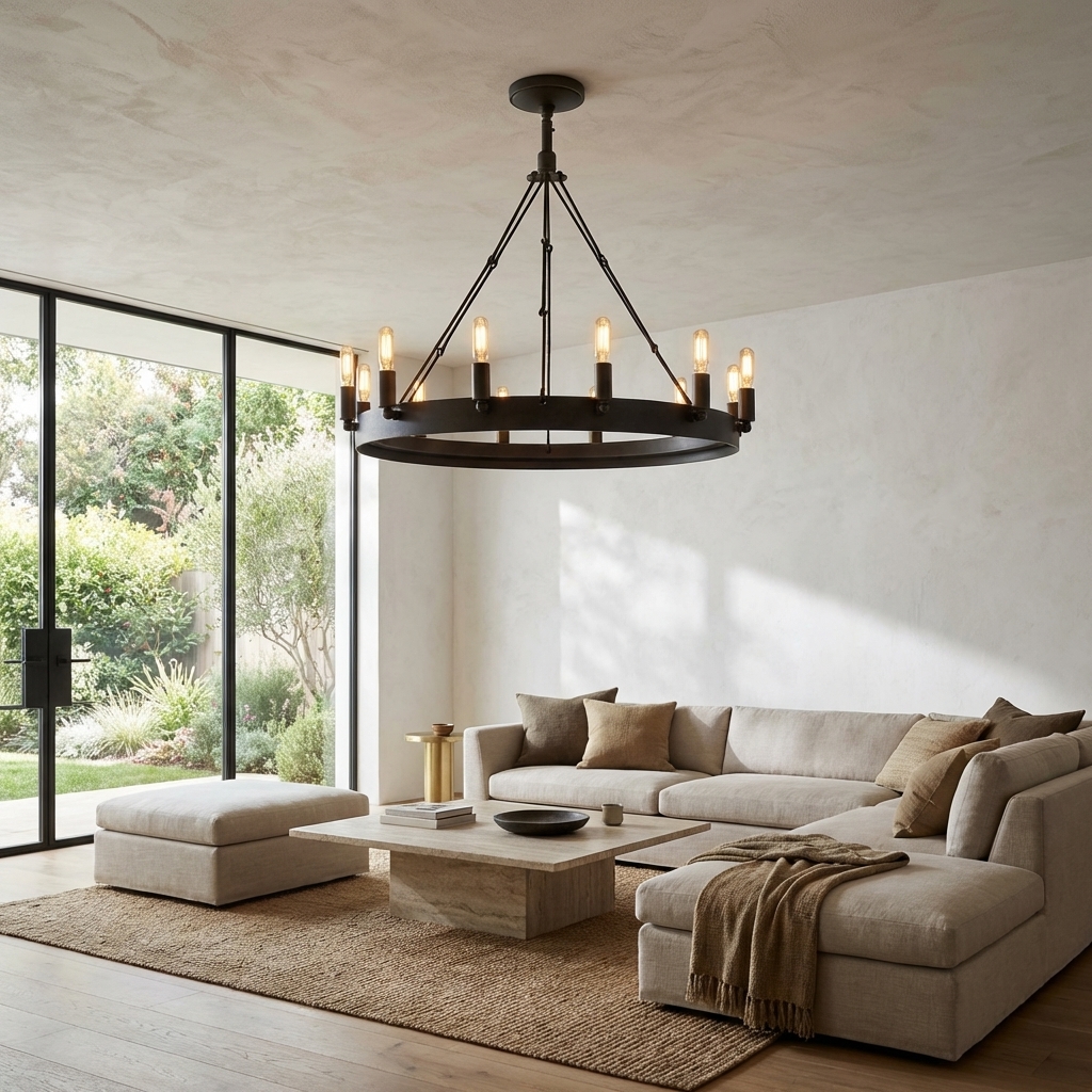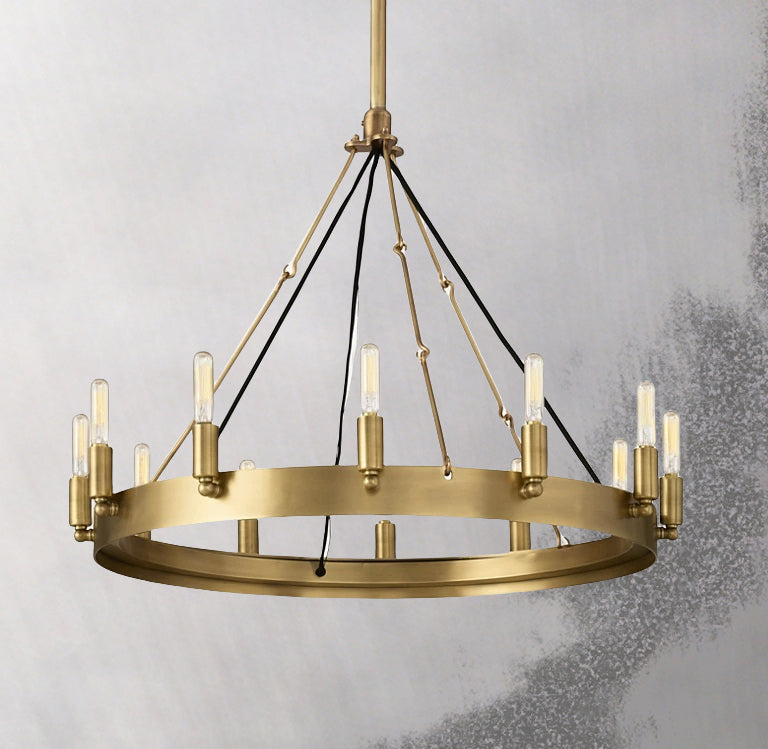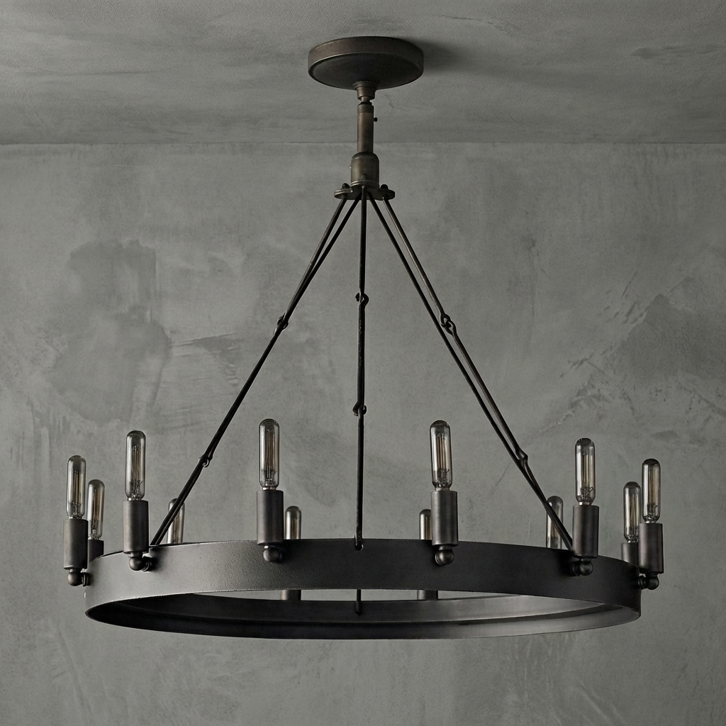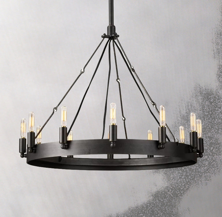 Forge Noire Round Chandelier 26" 12-Lights brings industrial heritage style into focus with a bold black iron ring, exposed filament bulbs, and a cross-brace chain suspension. Its open circular frame creates a clean, architectural presence while the 12-light arrangement delivers warm, even illumination for dining rooms, living rooms, bedrooms, villas, hotels, and other statement interiors.
