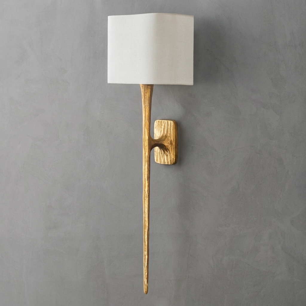 The Forgeron Grand Shaded Wall Sconce 37''H brings raw, sculptural character to the wall with a silhouette inspired by forged metalwork and natural thorn forms. Hand-hammered by artisans using an ancient fabrication process, its slender tapered frame reveals an alive, imperfect texture that gives each piece an organic presence. Crystal-tipped forged arms add contrast and refinement, making it a dramatic accent for hallways, foyers, bedrooms, dining spaces, and living rooms.