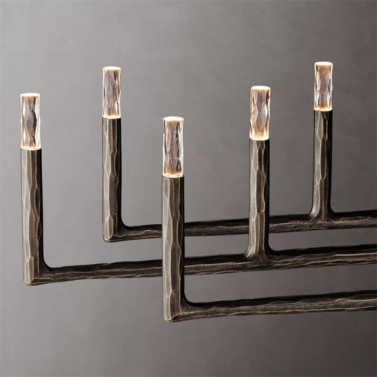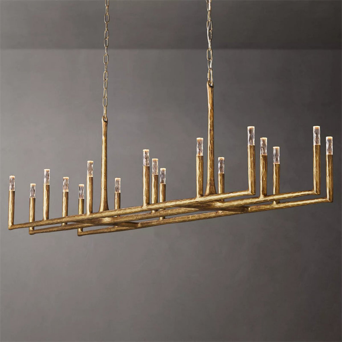Crafted from solid brass and faceted glass, the design balances rugged hand-forged expression with refined sparkle. The elongated 96-inch body delivers bold scale, while the included LED bulbs provide functional illumination for residential and commercial settings alike.