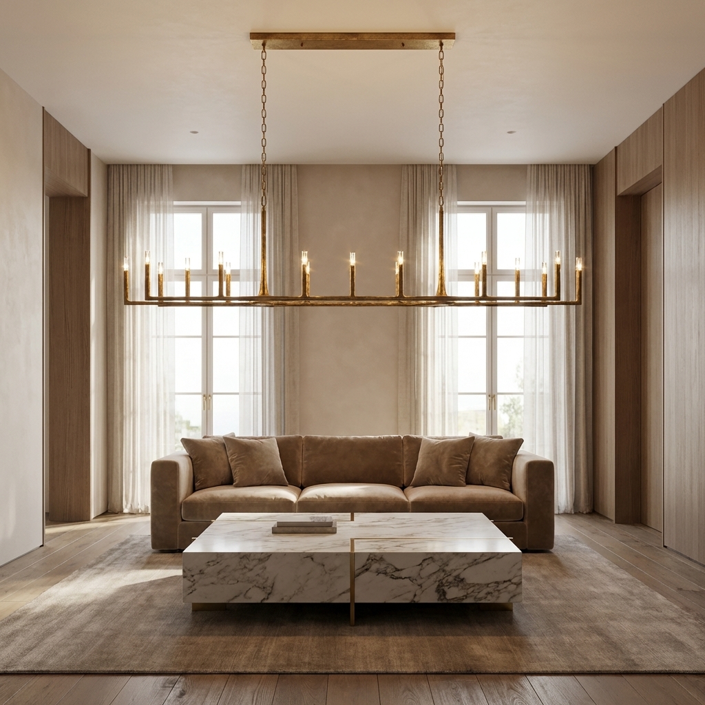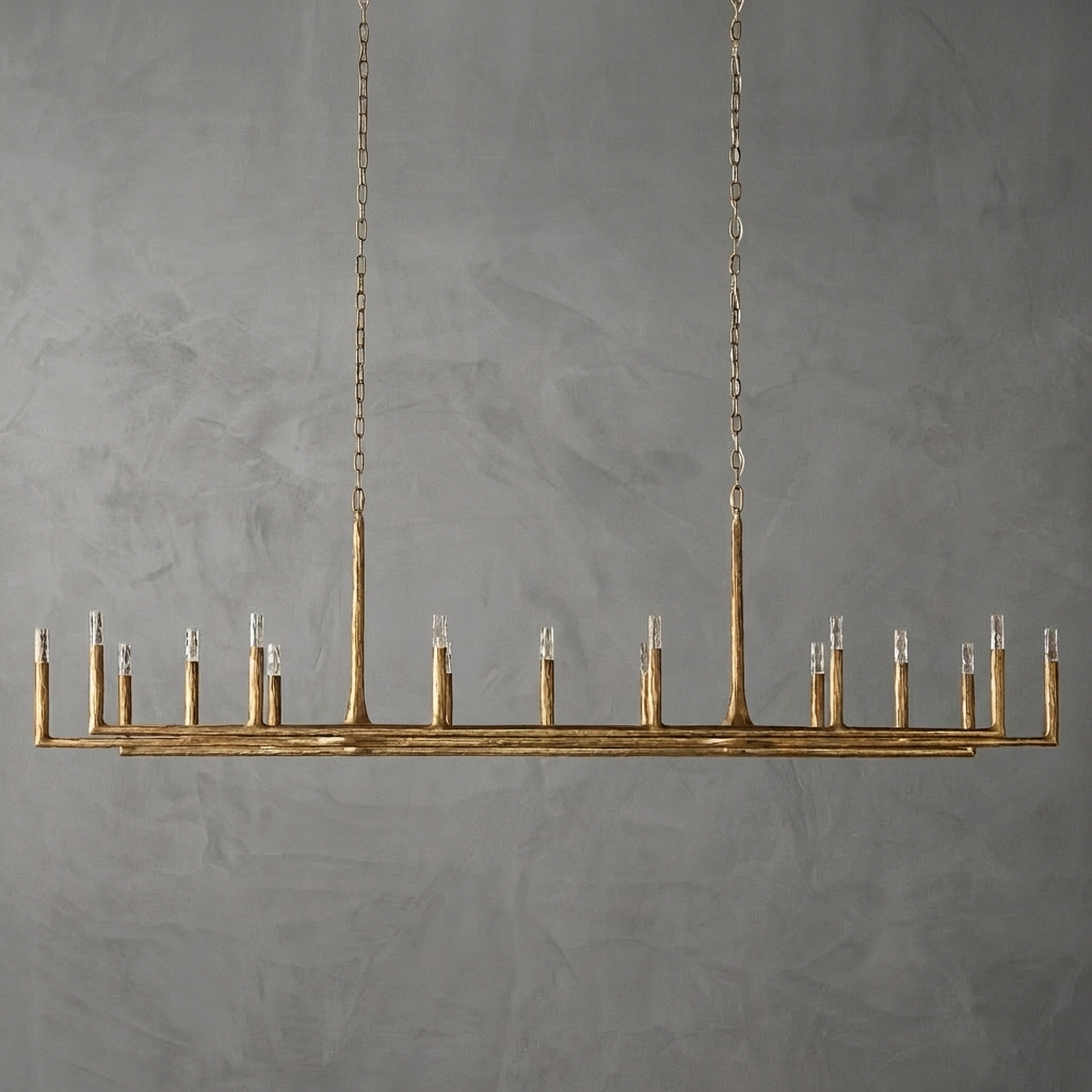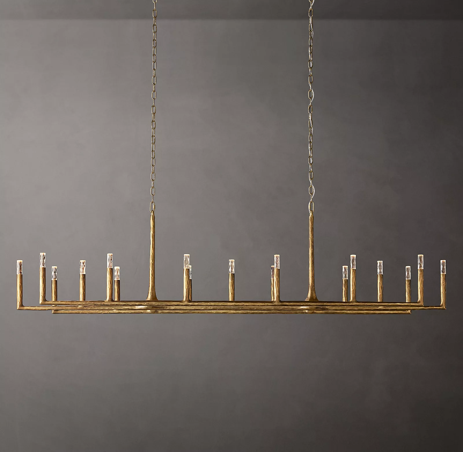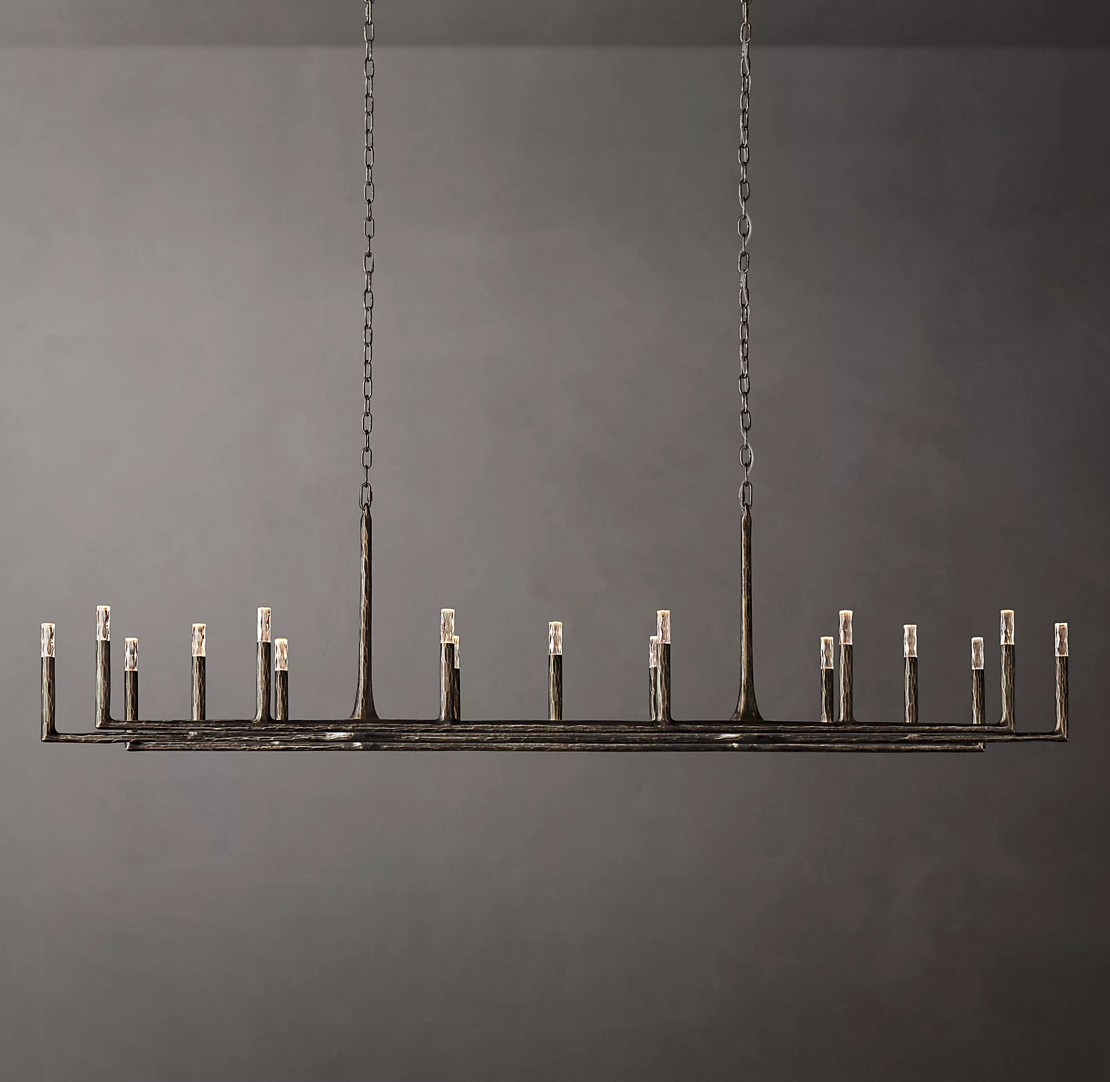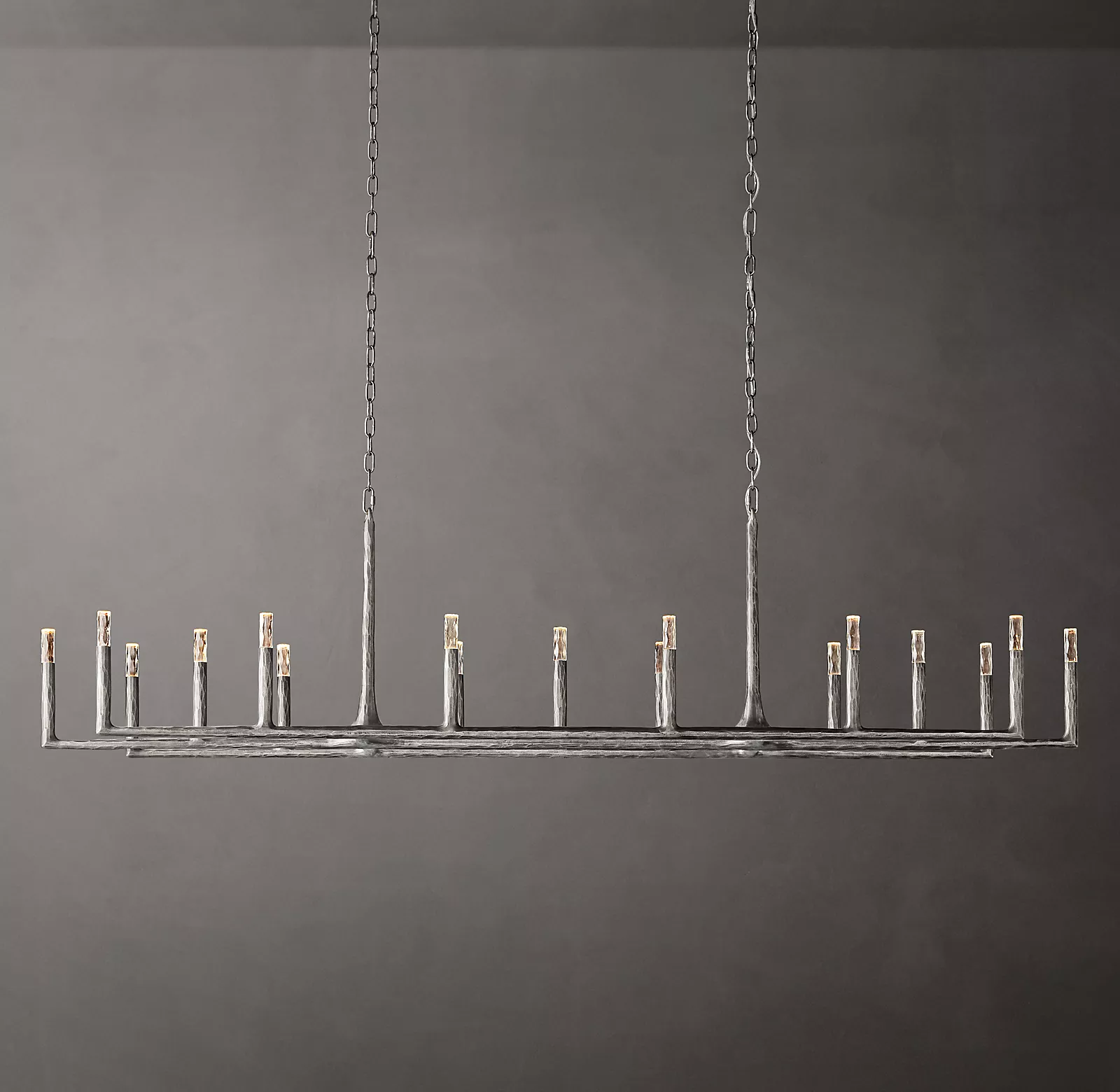 Available in Forged Brass, Forged Bronze, or Forged Pewter, this dramatic linear chandelier balances artisanal character with architectural scale. Its elongated 96-inch body features 17 integrated LED light sources that cast a warm 3000K glow, making it ideal for dining rooms, living rooms, bedrooms, villas, hotels, and other statement interiors.