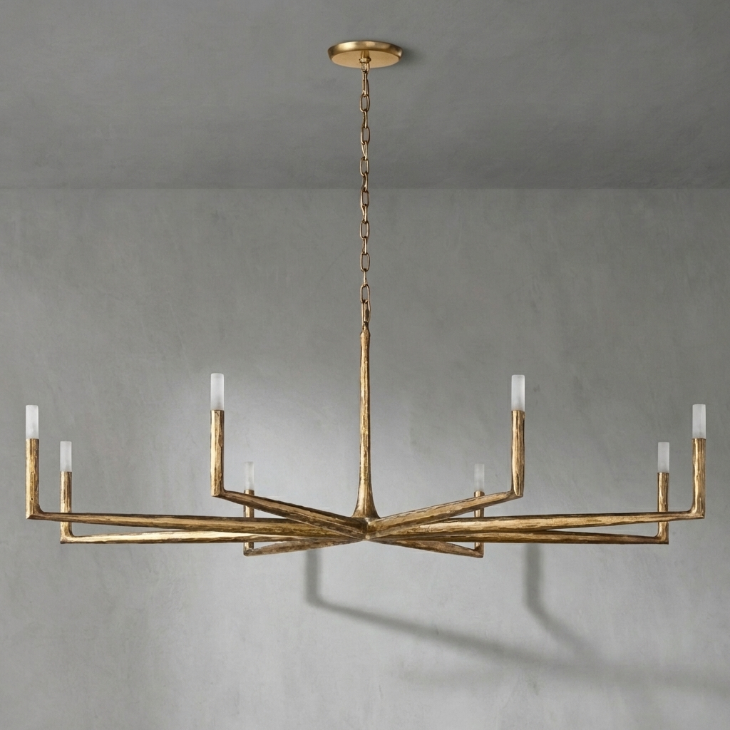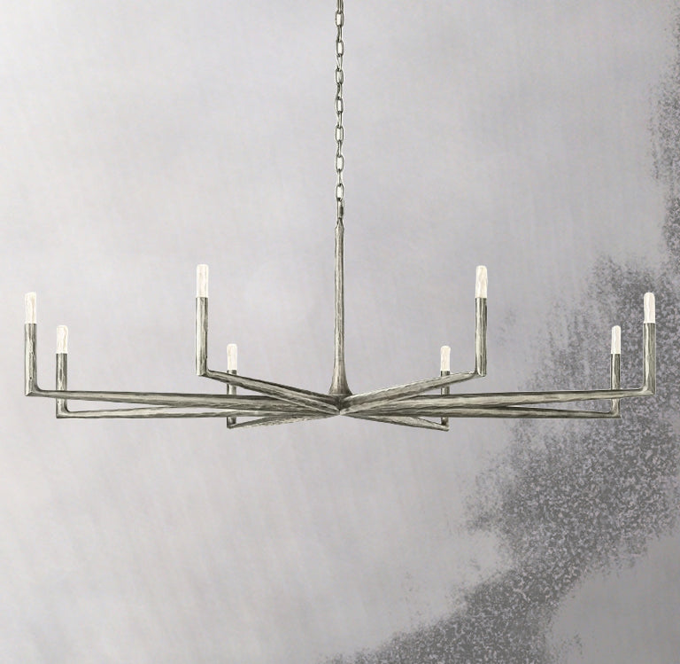The Forgeron Round Chandelier 72" is a bold, sculptural statement piece defined by forged spike-like arms and crystal-tipped detailing. Its raw, artisanal character brings an organic sense of movement to large interiors, while the substantial 72-inch round form makes it ideal for grand foyers, dining rooms, and living spaces.